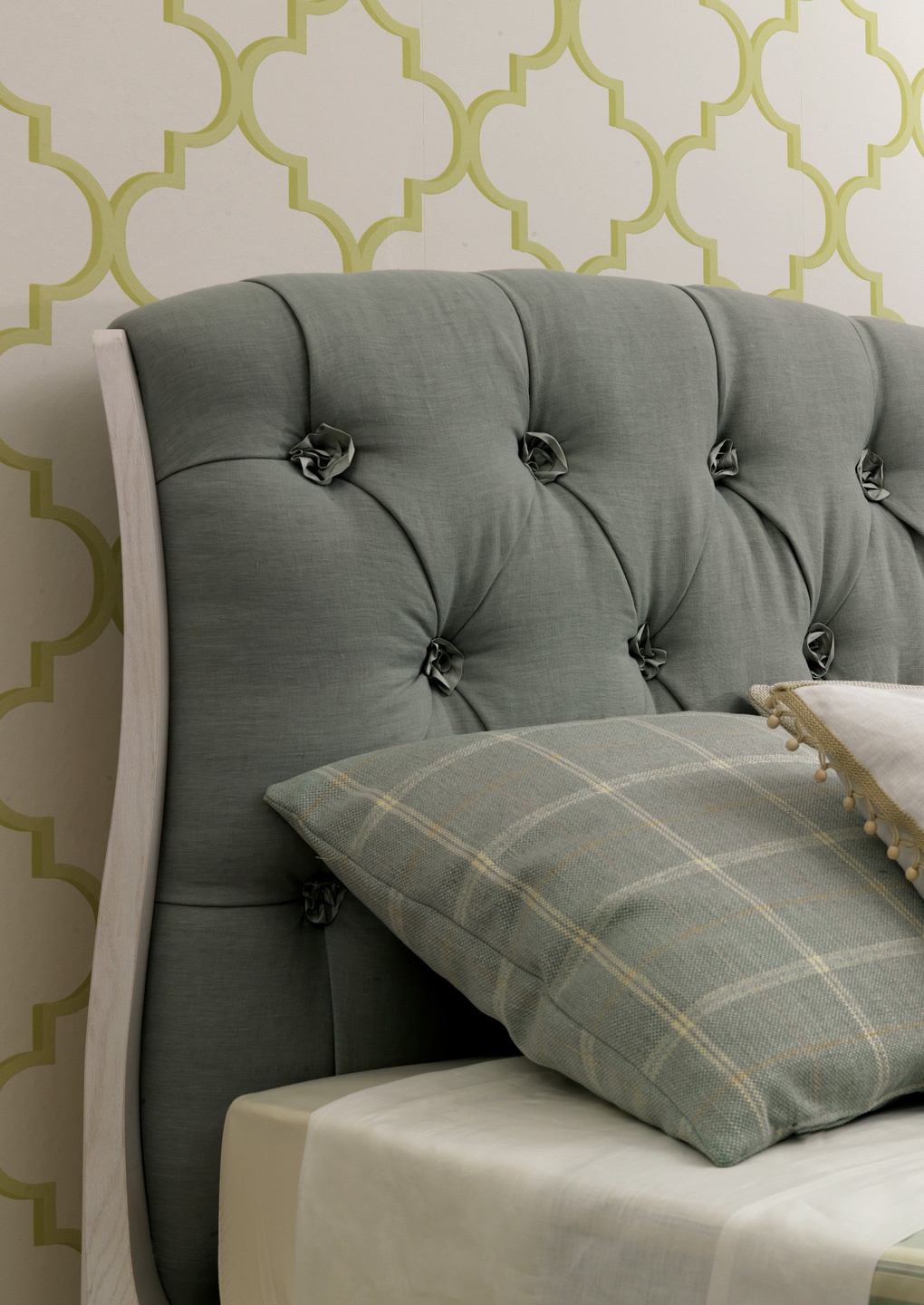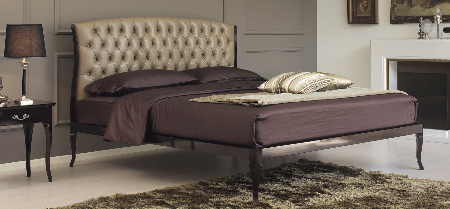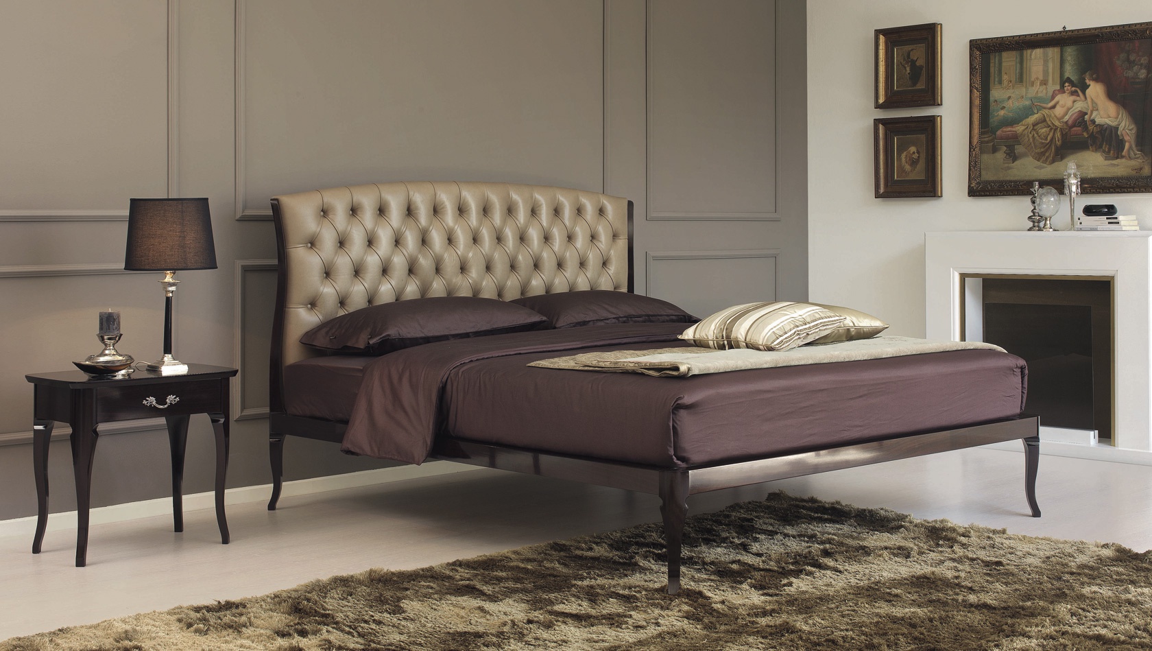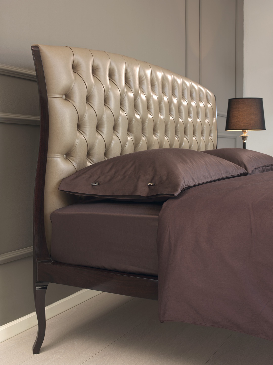 Bed Lollo from Italian producer Galimberti Nino. Bed made of solid Santos rosewood or ash. Upholstered headboard, upholstered in leather or fabric in the style of “capitonne”. Orthopaedic wooden slats. Double bed with high headboard and soft for the bedroom in classic style. Product color beige or a choice from manufacturer's catalogue.