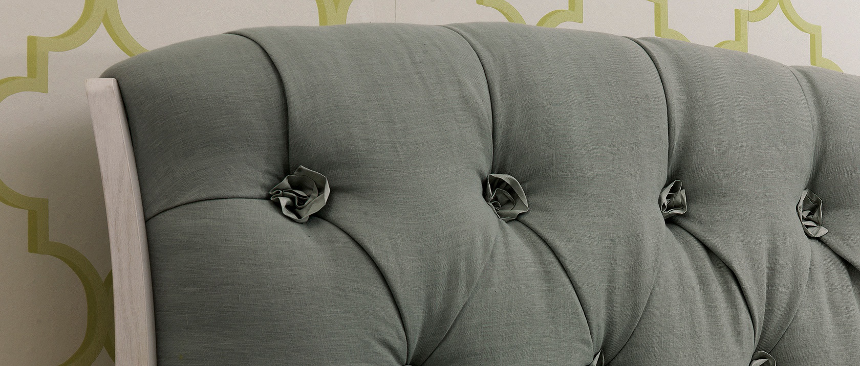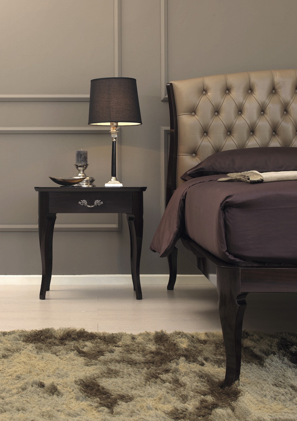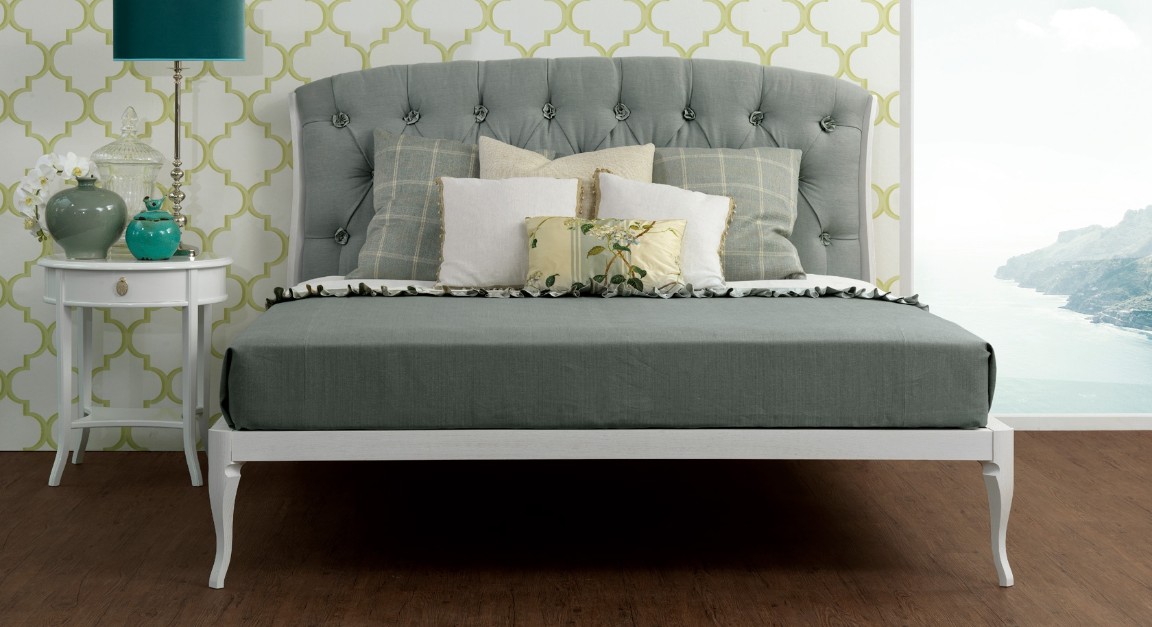 Bed Lollo from Italian producer Galimberti Nino. Bed made of solid Santos rosewood or ash. Upholstered headboard, upholstered in leather or fabric in the style of “capitonne”. Orthopaedic wooden slats. Double bed with high headboard and soft for the bedroom in classic style. Product color beige or a choice from manufacturer's catalogue.