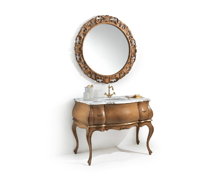 Bathroom (Suite bathroom) from the Italian manufacturer Angelo Cappellini. The set includes the Cabinet under the sink and wall mirror. The body legs and curved cabinets made from wood and top offers of marble. Wall mirror of round shape. The frame is made of wood and decorated with carvings. Finishing made with lacquer.