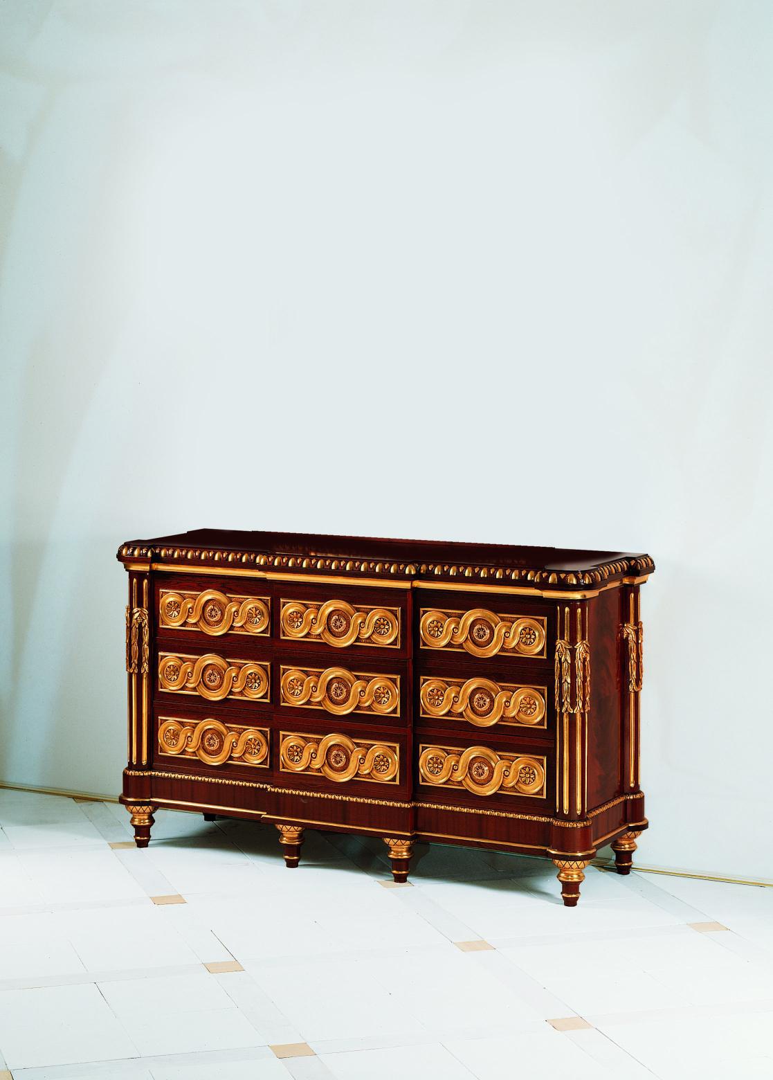 The dresser S. I. P. ARR 09 from Italian manufacturer Colombo Stile. The case is natural wood. Finish: mahogany, gold leaf and patina. Decorative elements of handwork. The style is classic. Model with drawers.