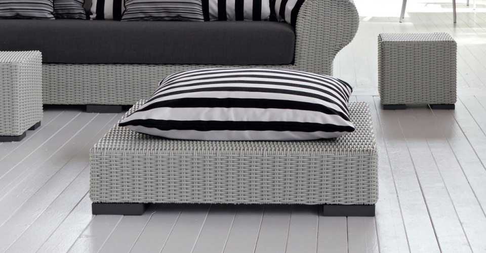 The coffee table InOut 514 from Italian manufacturer Gervasoni. The frame is aluminum, the wicker body is made of polyethylene tapes.