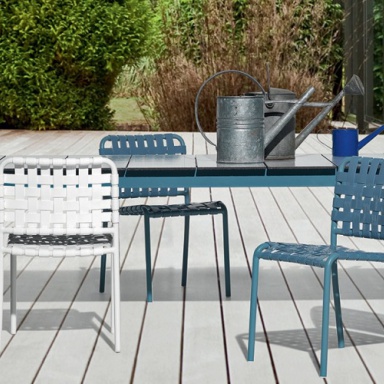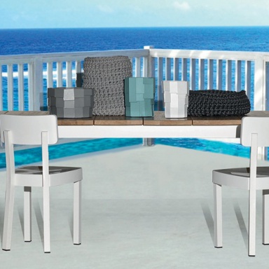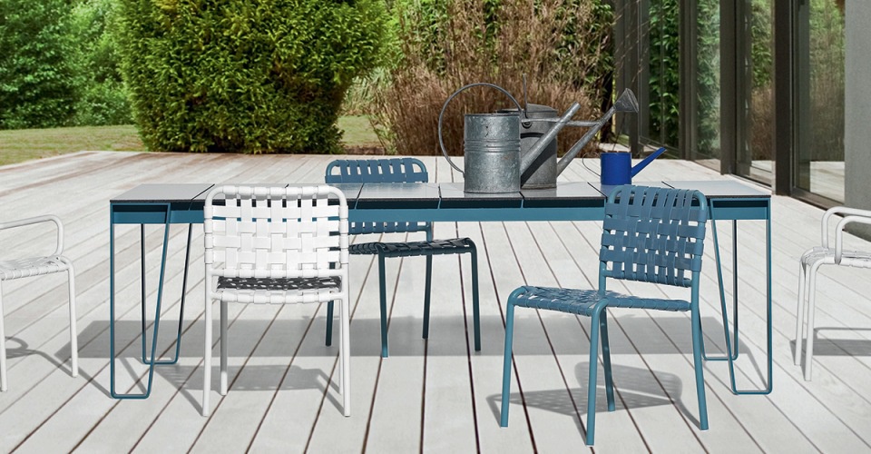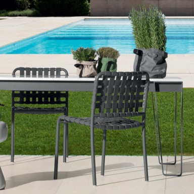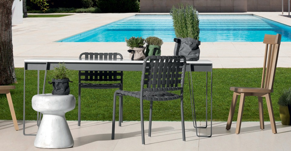 Dining table InOut 933 938 from Italian manufacturer Gervasoni. The frame is brushed steel. The table top is ash wood. Also available in teak, white marble, ceramics. The perfect choice for terraces. This model is not intended for use outdoors. Colours in stock.