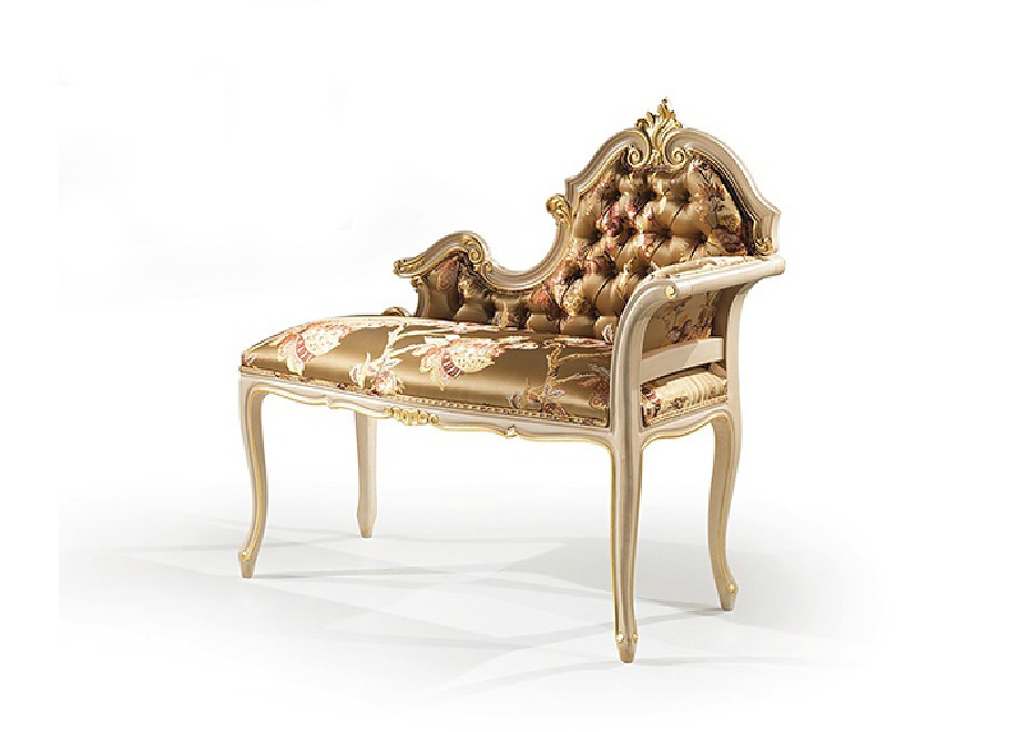 Bench from the Italian manufacturer Angelo Cappellini. Model with left armrest and shaped back in the frame. The frame and legs are made of wood. Decoration is the decorative carving and gilding. Finish offered from the company portfolio. The upholstery is made of textile with a decorative stitch Capito.