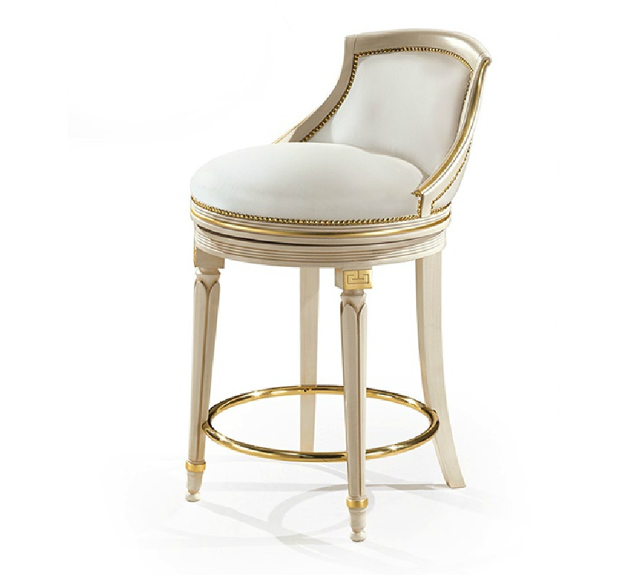 Bar stool from the Italian manufacturer Angelo Cappellini. The model without armrests, with low backrest. The design is executed in classical style. The frame is made of wood. The upholstery is available in leather. D?cor - carved and gilded. Color catalog of the company.