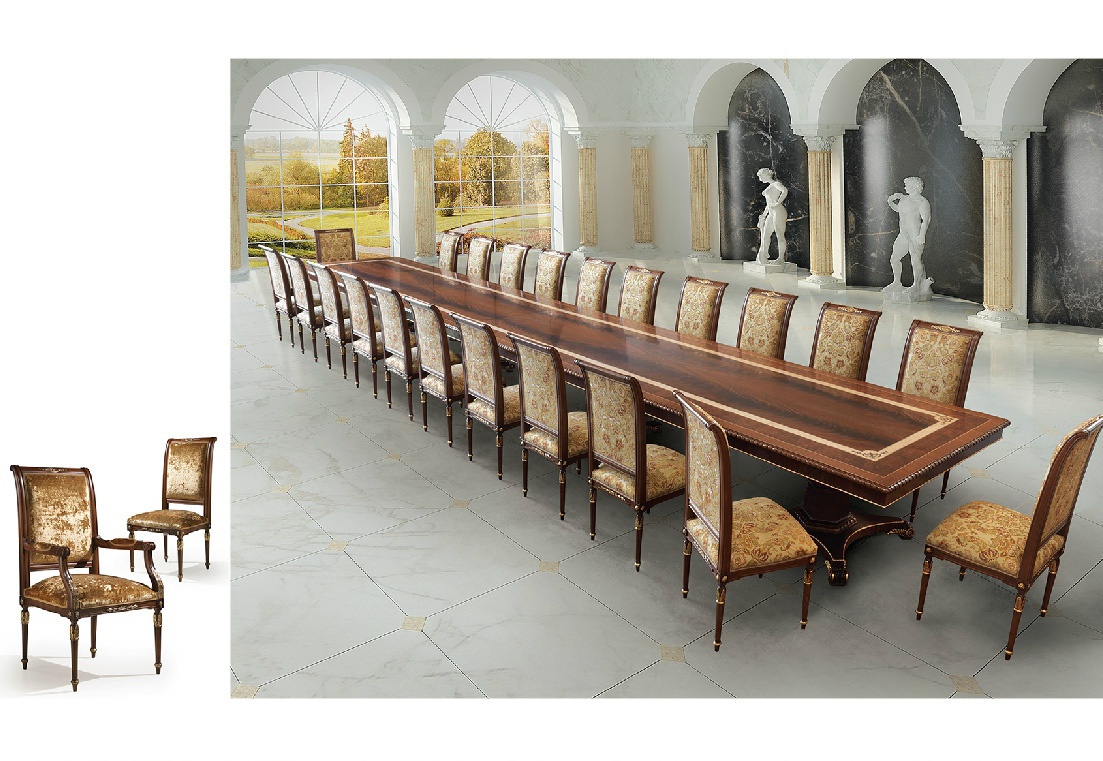 Furniture for conference halls from the Italian manufacturer Angelo Cappellini. The set includes a large table and chairs with high backs. The chairs are available with armrests and without. The frame is made from wood and decorated with carving and gilding. The upholstery is made of textile. Conference table with rectangular top made of wood. The table top is decorated with inlay. Voluminous curly pillars decorated with carvings and gilding.