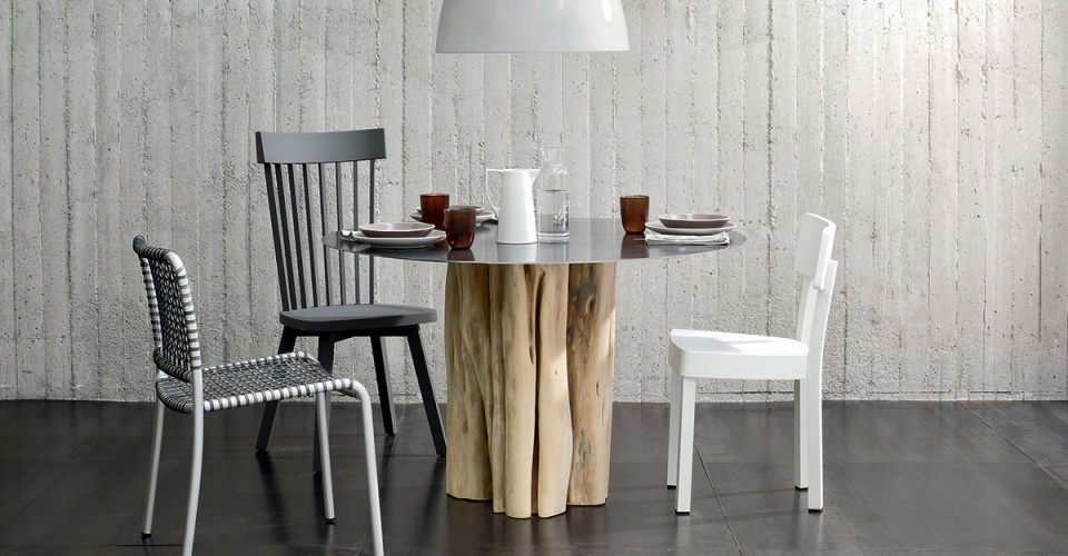 Dining round table with 36 Brick from Italian manufacturer Gervasoni. Model of the collection Brick. Tabletop metal. The base is natural wood, stripped of bark. Colours in stock.