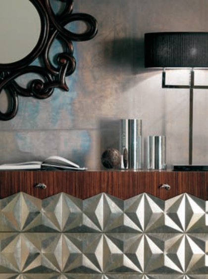 A chest of drawers on high legs Diamond Italian manufacturer Bizzotto. A chest of drawers on a frame of natural wood finish on the top drawer - ebony, the other three legs and aluminum foil. Colors to be selected from the range of the factory. The dresser is finished with a decorative trim in the form of many faces. A great addition to your interior.