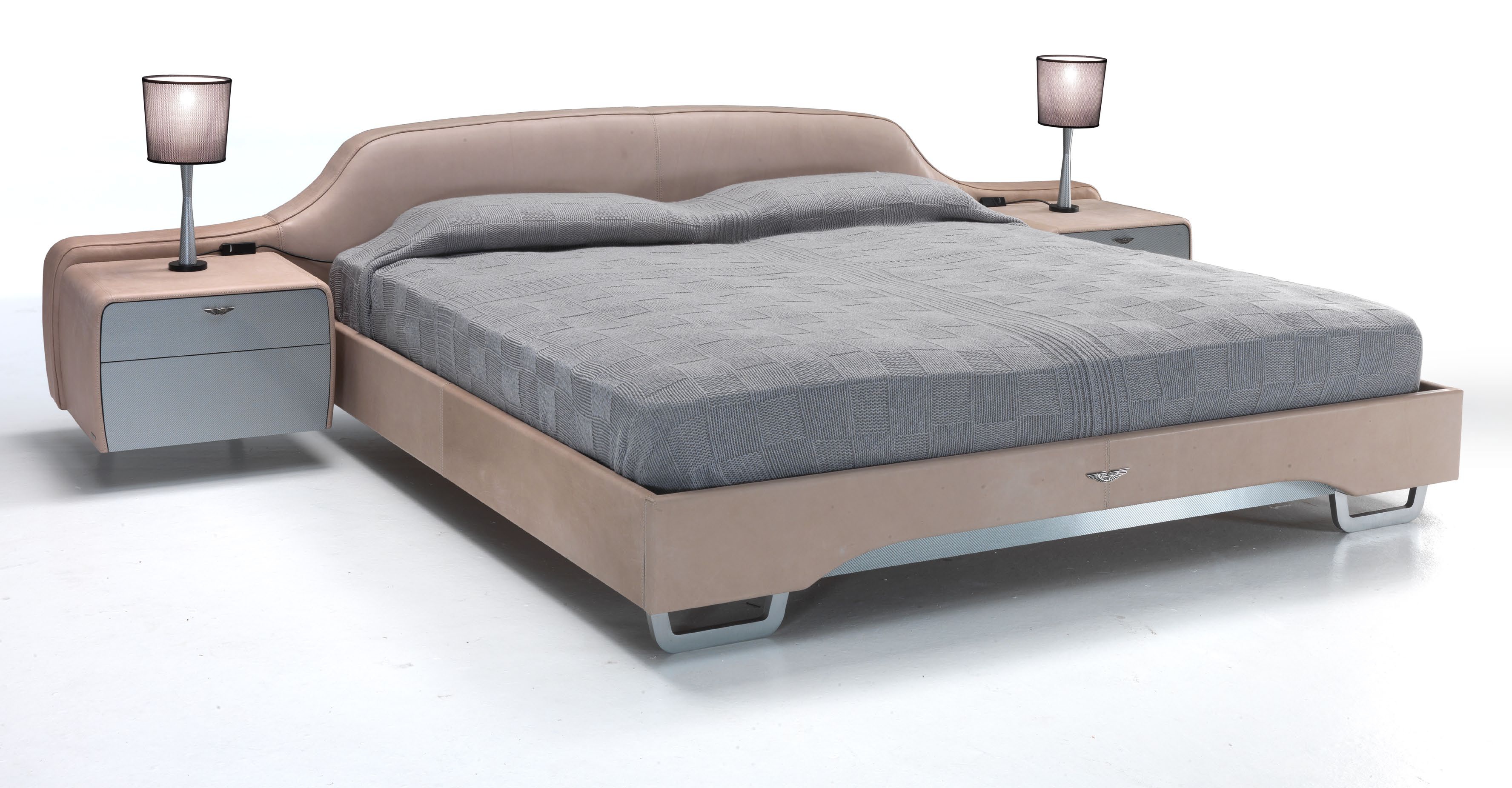 | Description: | Double bed V092 from the Italian manufacturer Formitalia. Frame made of nickle, Matt. Slats under the mattress wooden. Trim - leather Skin Sand, beige shade. Night tables with front drawers in ALUTEX fibre. |