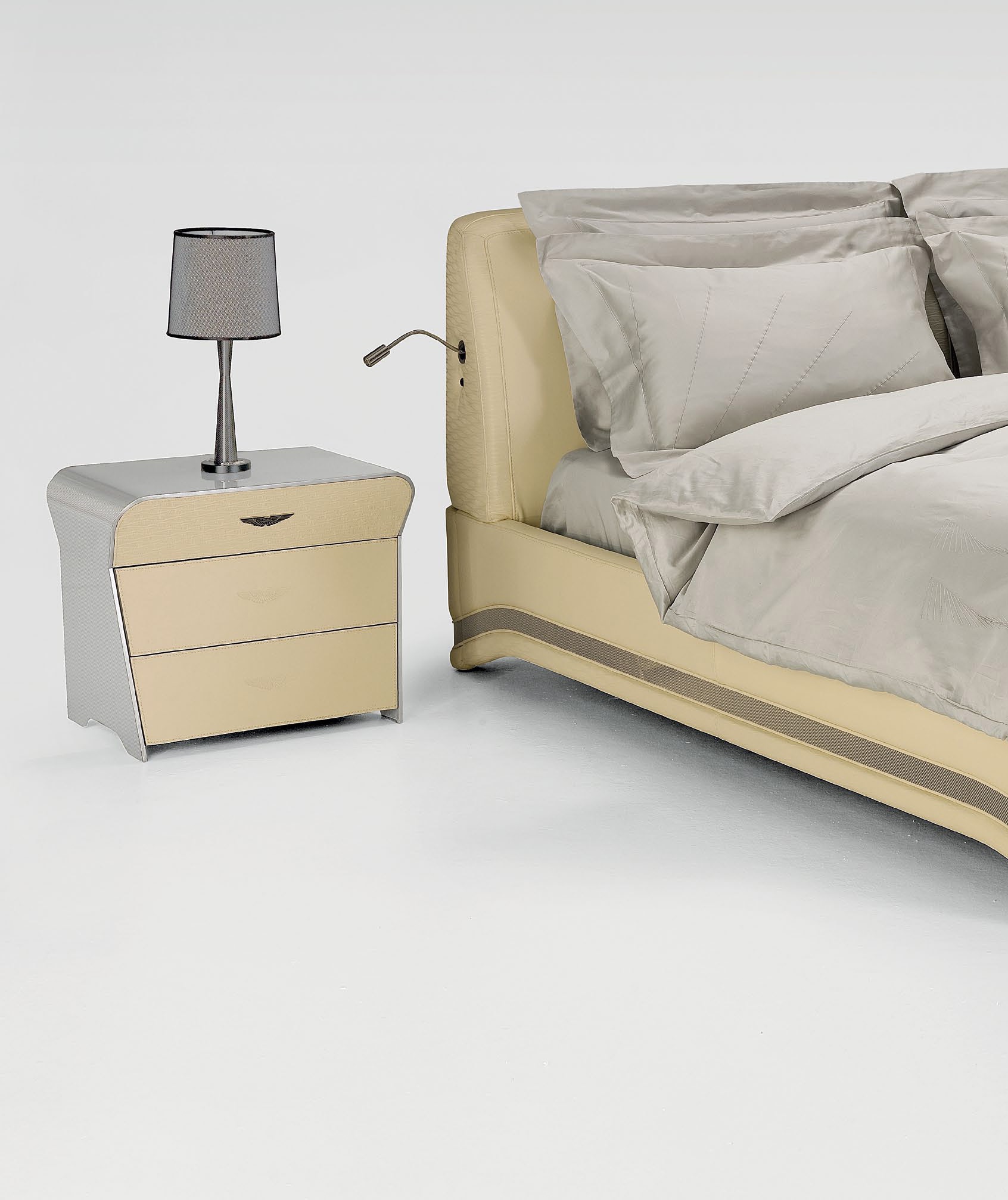 | Description: | Bedside table V028 from the Italian manufacturer Formitalia. The body is made of aluminum and wood. Finish - a combination of leather Seta Talpa and Seta cenere, in gray and beige tones. |