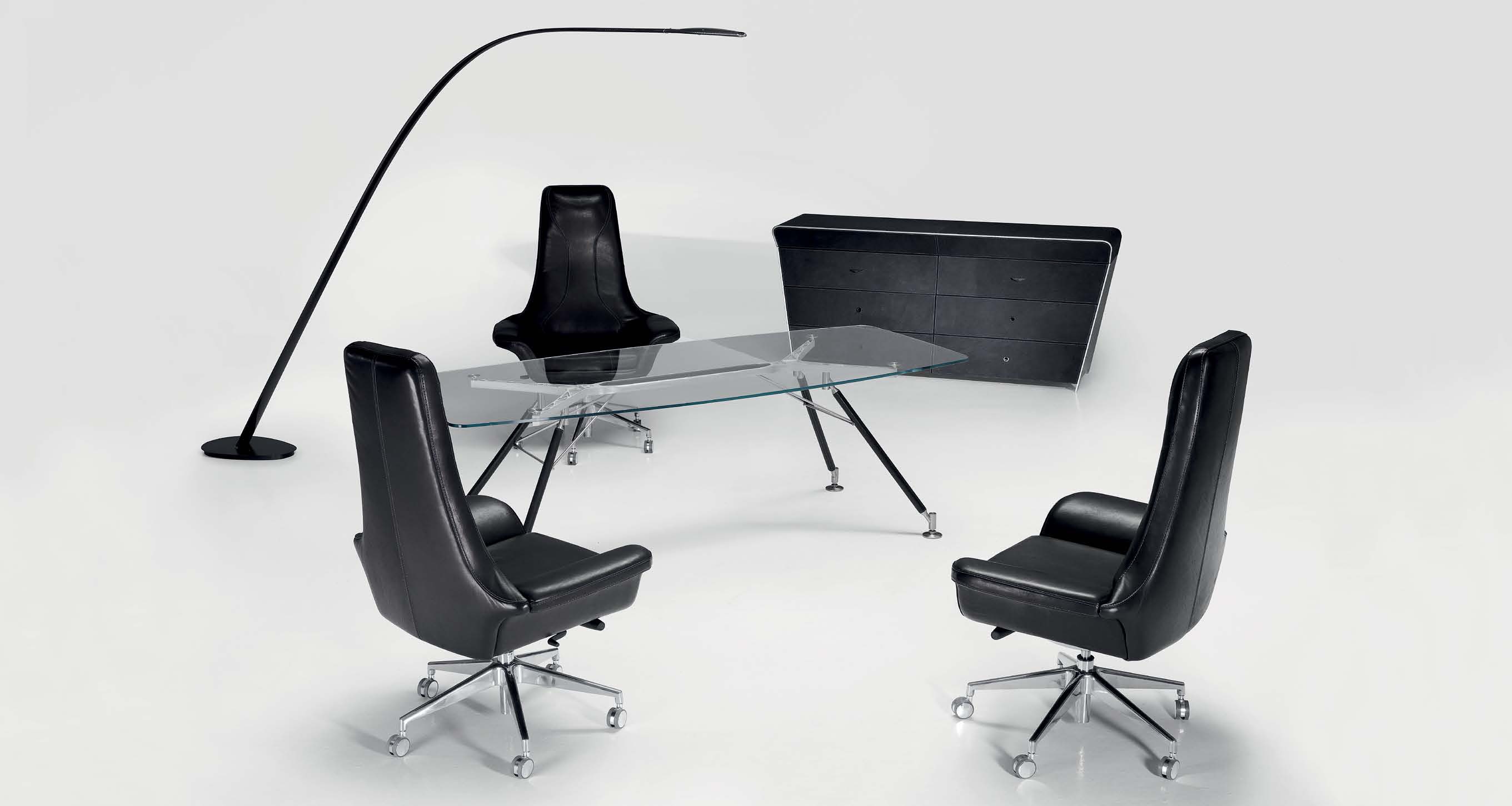 The office (Suite office) V049, V008 from the Italian manufacturer Formitalia. Glass top, metal legs in leather upholstery as well as other finish options. A chair on metal base, upholstery - leather. Offers a wide range of colors.