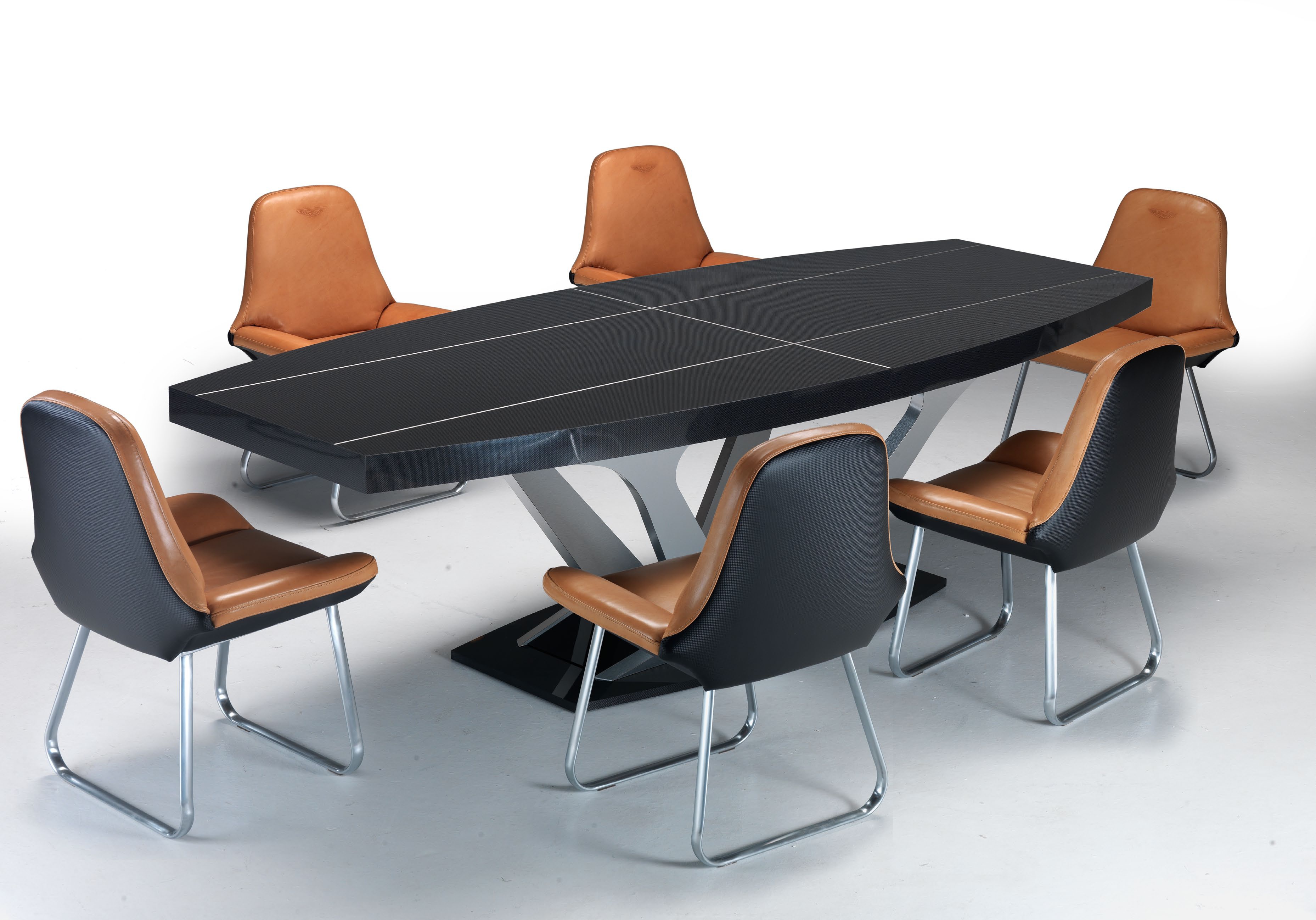 Dining room (dining set) V026,V067/C from the Italian manufacturer Formitalia. Wooden table top, legs - metal. Chair in leather upholstery with metal legs. Offers a wide range of colors.