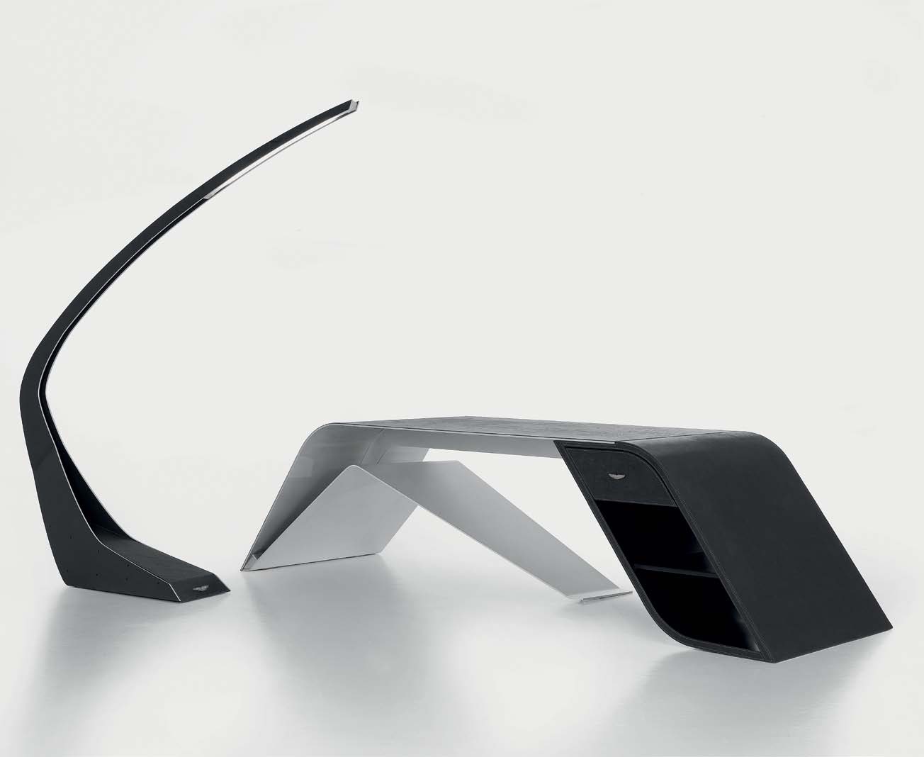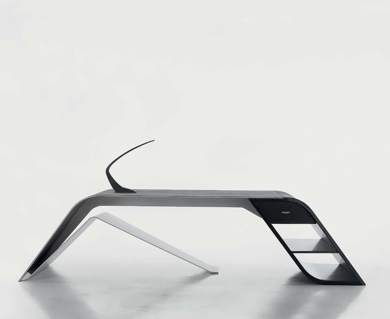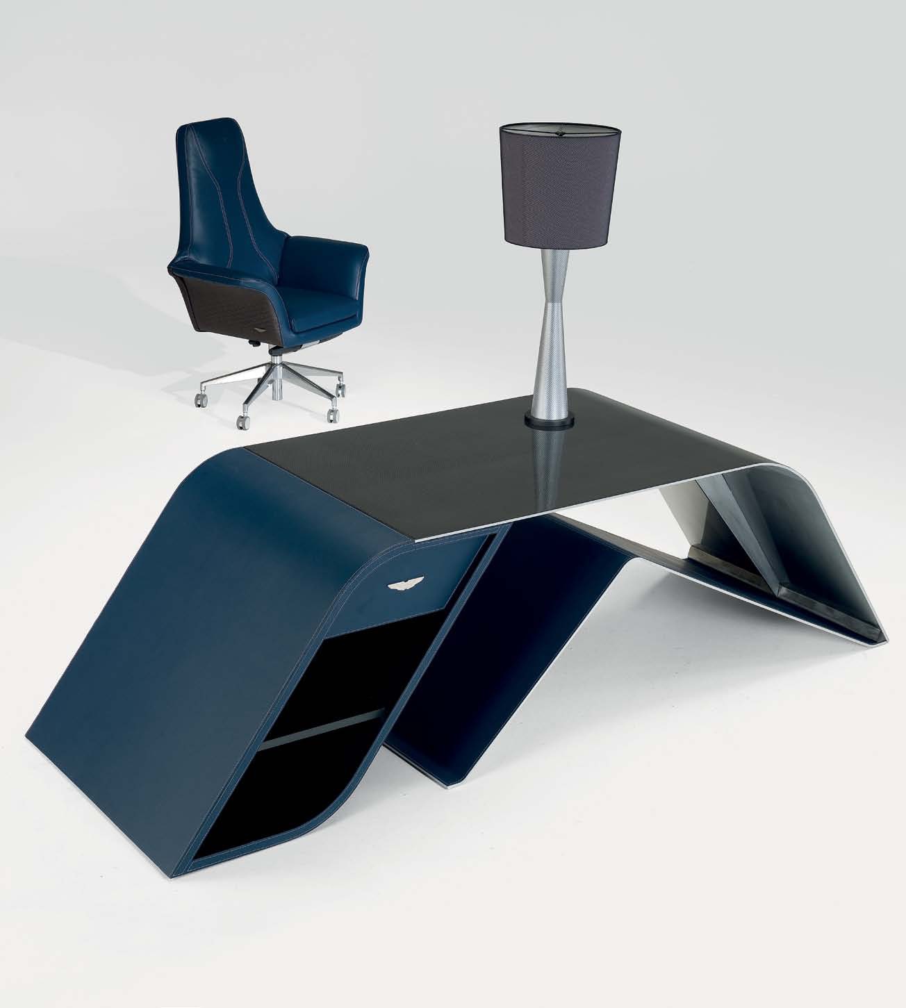 Desk V004 from the Italian manufacturer Formitalia. The model collection Aston Martin. Wooden table top, base made of aluminum. Trim - leather, from the company portfolio or carbon. Offers a wide range of colors.