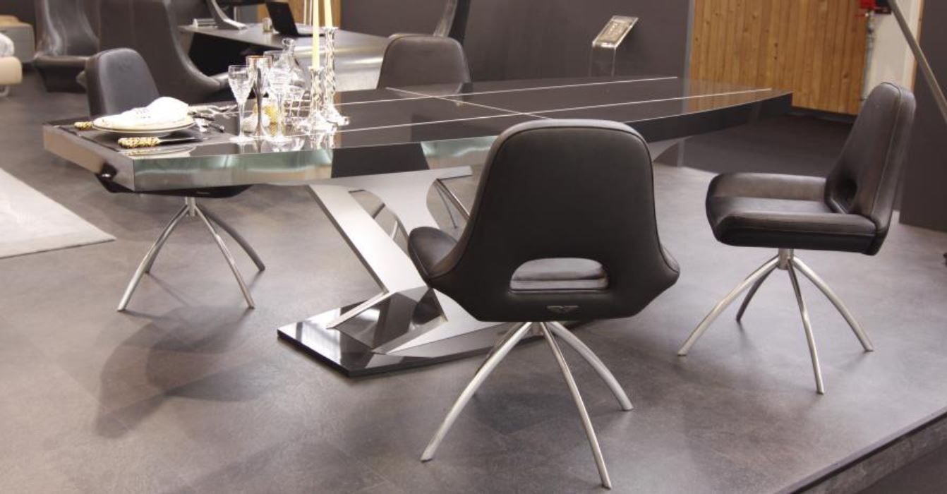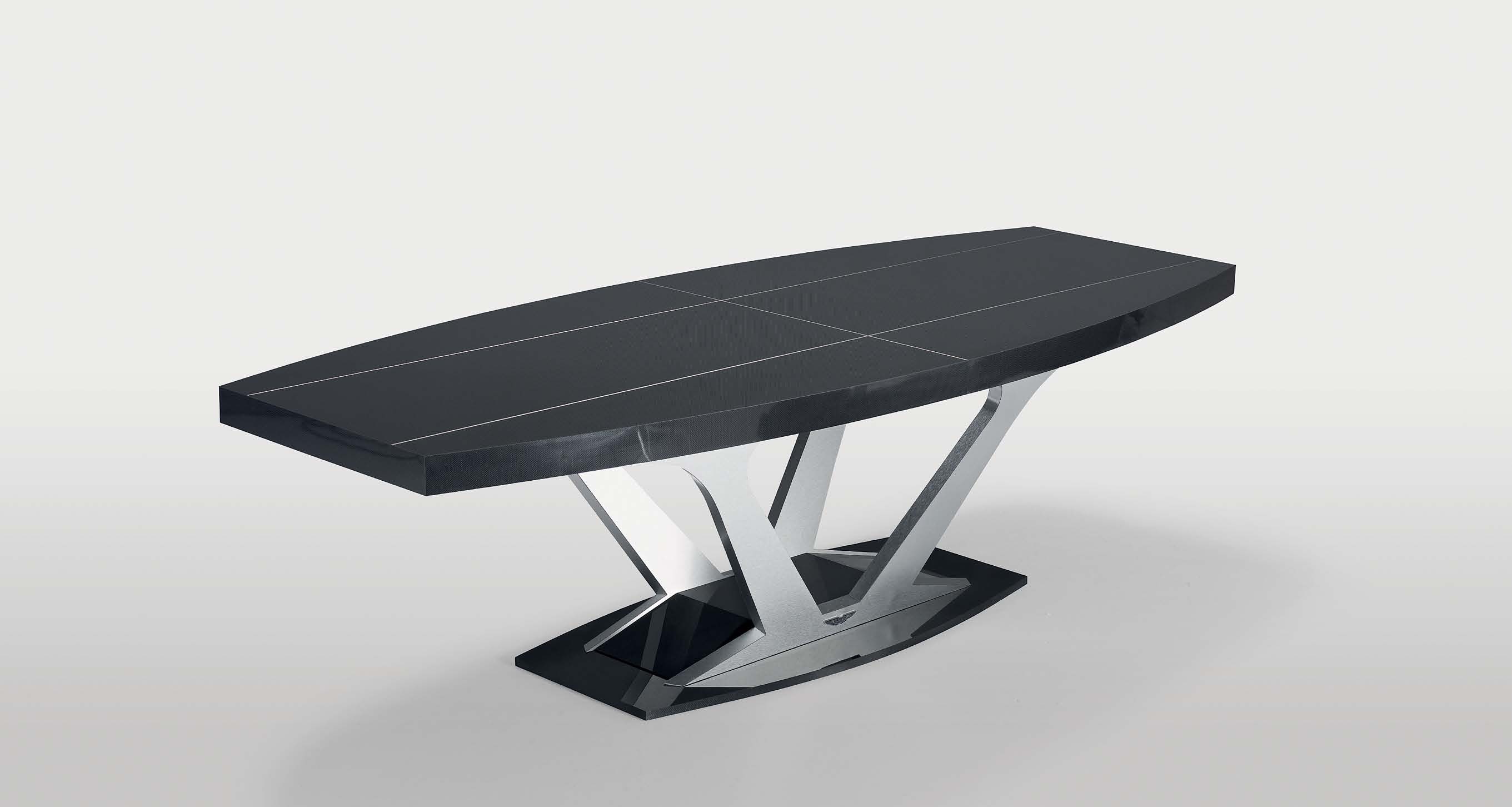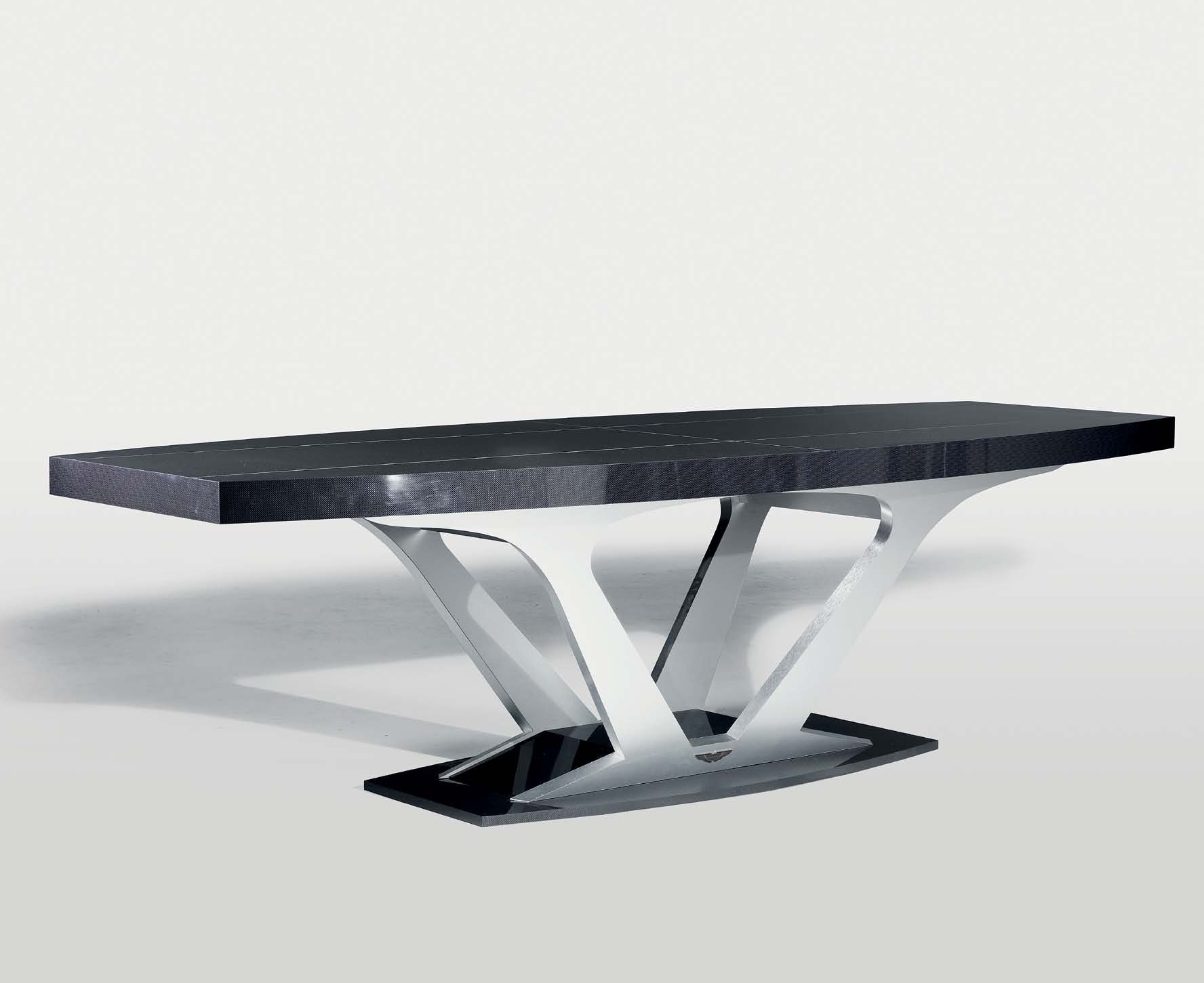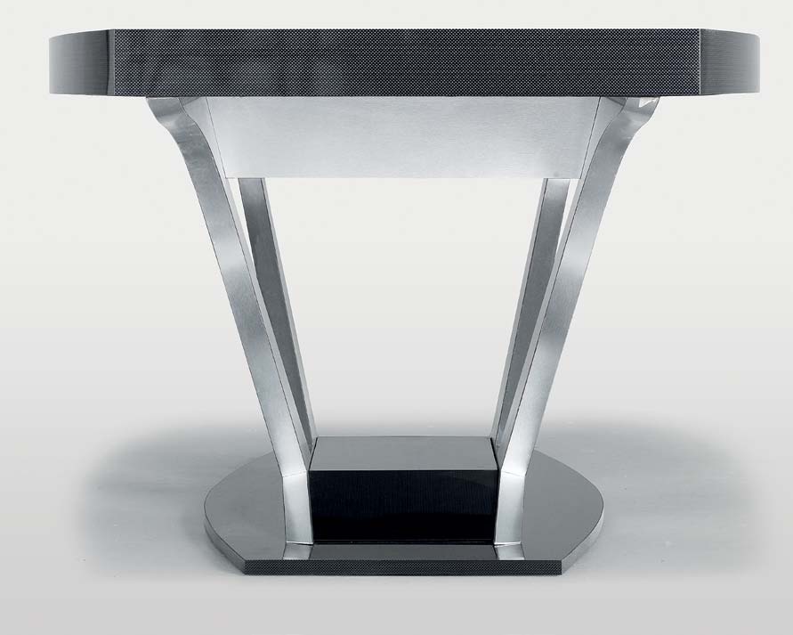 V026 dining table from Italian manufacturer Formitalia. The model collection Aston Martin. Wood countertop trim carbon, the base is made from aluminum. Offers a wide range of colors.