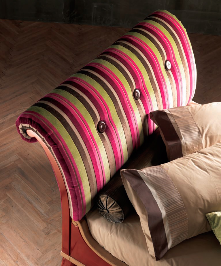 Double bed with curved headboard Art.C456 Italian manufacturer Bizzotto. Model for small feet. Bed frame made of wood, upholstered in multicoloured textile. The headboard is low, soft and perfect for bedrooms fusion.