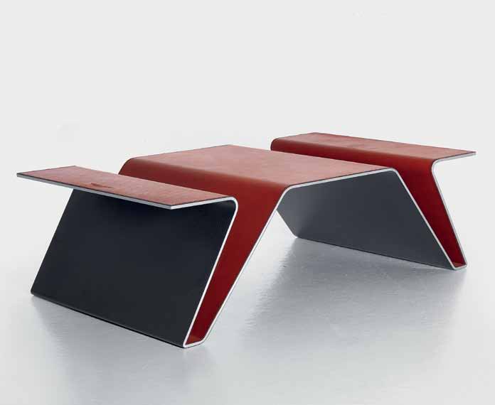 | Description: | Coffee table V005 (table 2 sides) from the Italian manufacturer Formitalia. The frame is made from aluminium, the inner surface covered with Nabuk leather Smog in gray. The outer surface is in aluminium. Price on request at the factory. |