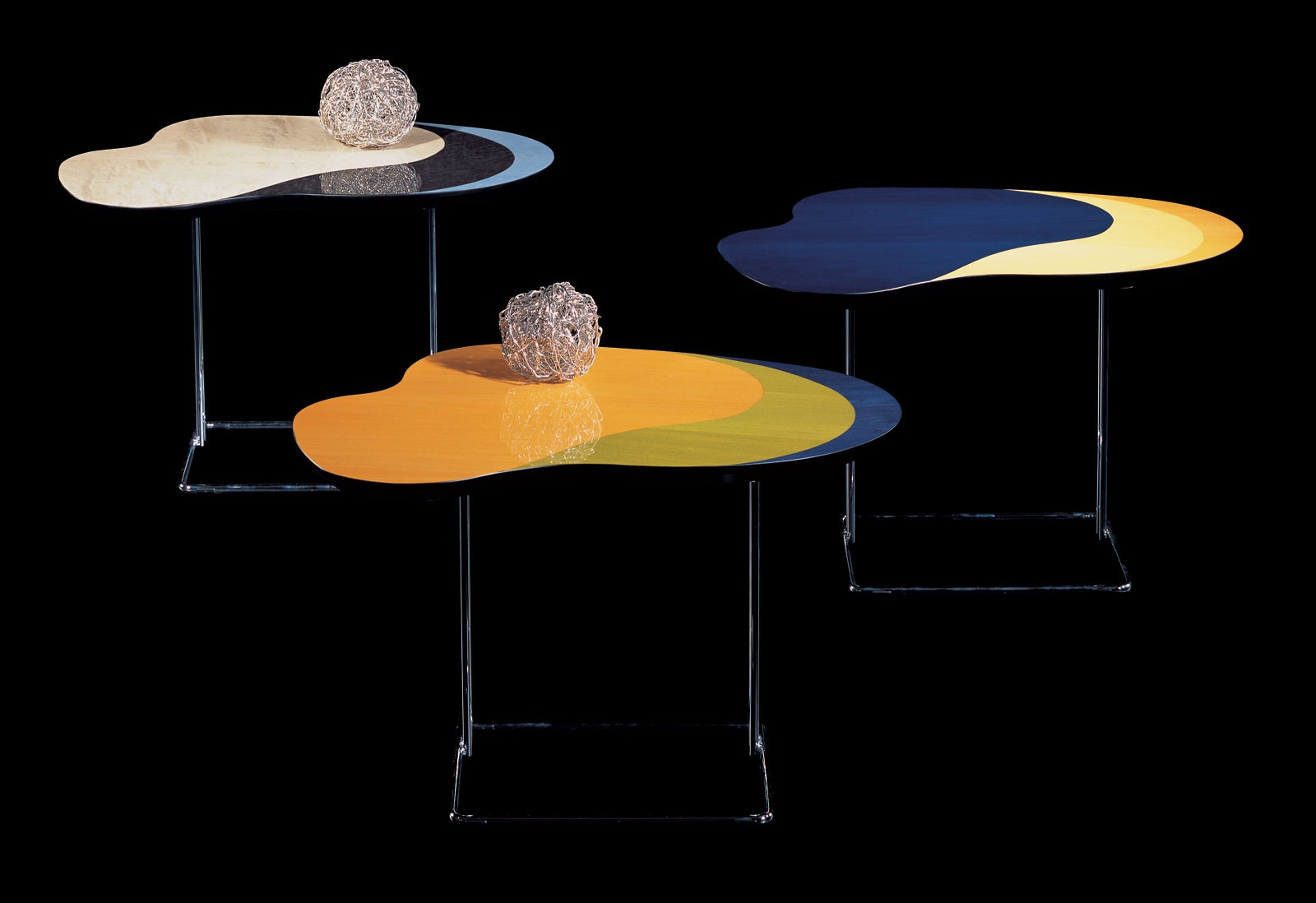 Dek coffee table from the Italian manufacturer Il Loft. The frame and legs are made of chrome steel. Curly top made of wood with high gloss or Matt lacquer. The modern design.