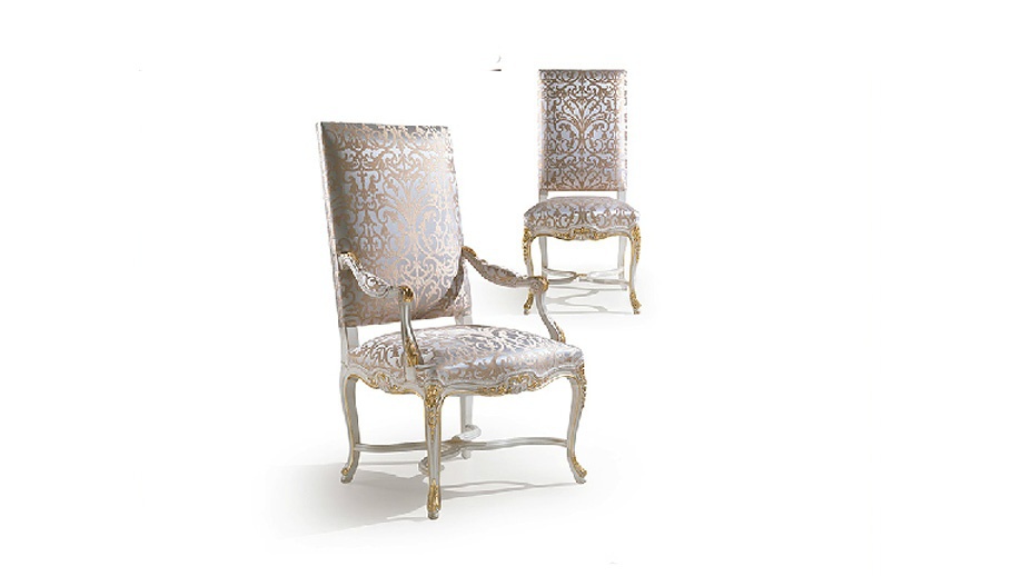 A chair from the Italian manufacturer Angelo Cappellini. The model with high backrest is available with wooden armrests or without. The frame is made from wood. Decoration is a decorative carved and gilded elements. Seat and back in the soft upholstery. The upholstery is made of textile fabric with a pattern from the company portfolio.