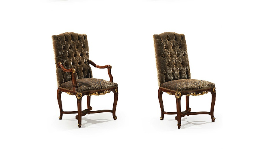 A chair from the Italian manufacturer Angelo Cappellini. Model with a high back. The upholstery is made of textile fabric from the company portfolio. The back is decorated with a decorative stitch Capito. The frame is made from wood and decorated with carving and gilding. The chair is available in two versions with or without armrests.