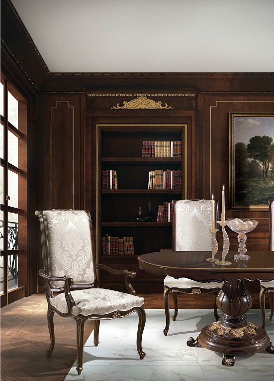 A chair from the Italian manufacturer Angelo Cappellini. Model with a high back is made with a frame made of wood. The chair comes in two versions with or without armrests. Legs and armrests are shaped and decorated with carvings. The upholstery is made of textile fabric company.