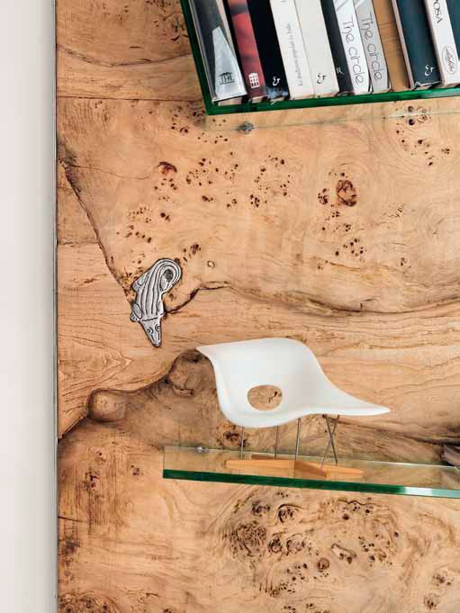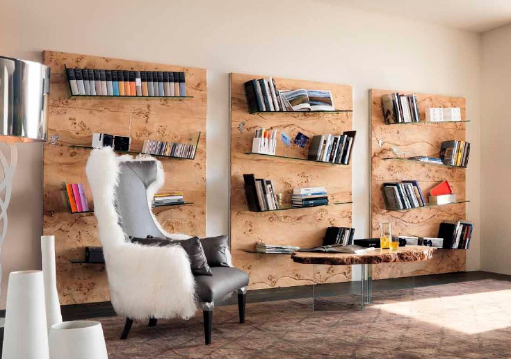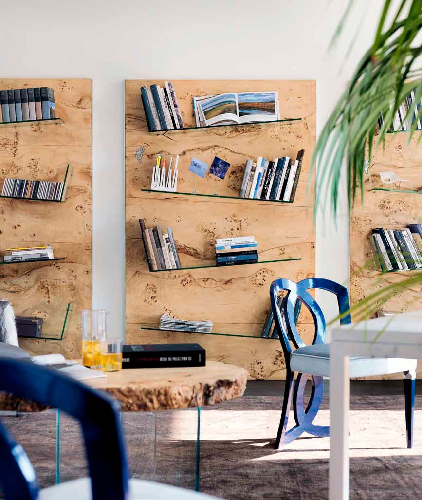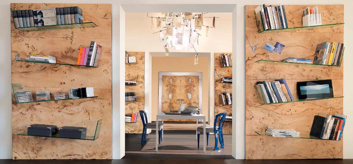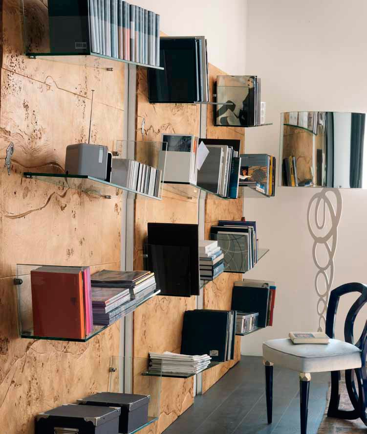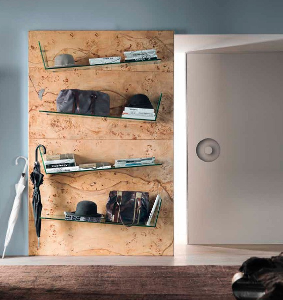 Rack with glass shelves Sydney Italian manufacturer Bizzotto. The panel is made from root wood (radiaca), 200 year old trees. This tree is unique as it occurs in specific environmental conditions, such as floods, landslides, and therefore each product from the "radica" by their unique sizes and shapes. Shelves are made of glass, located under the slope. And unique design solution for modern interior living room or library.