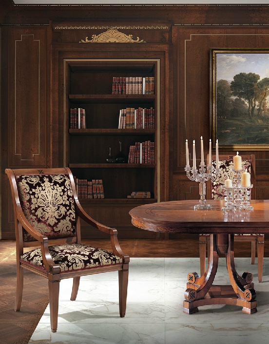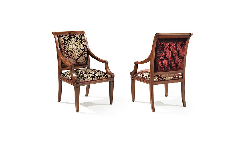 A chair from the Italian manufacturer Angelo Cappellini. The model with armrests. Frame and armrests made of wood. Upholstery fabrics from a range of companies. The varnish finish offered. The design is executed in classical style.