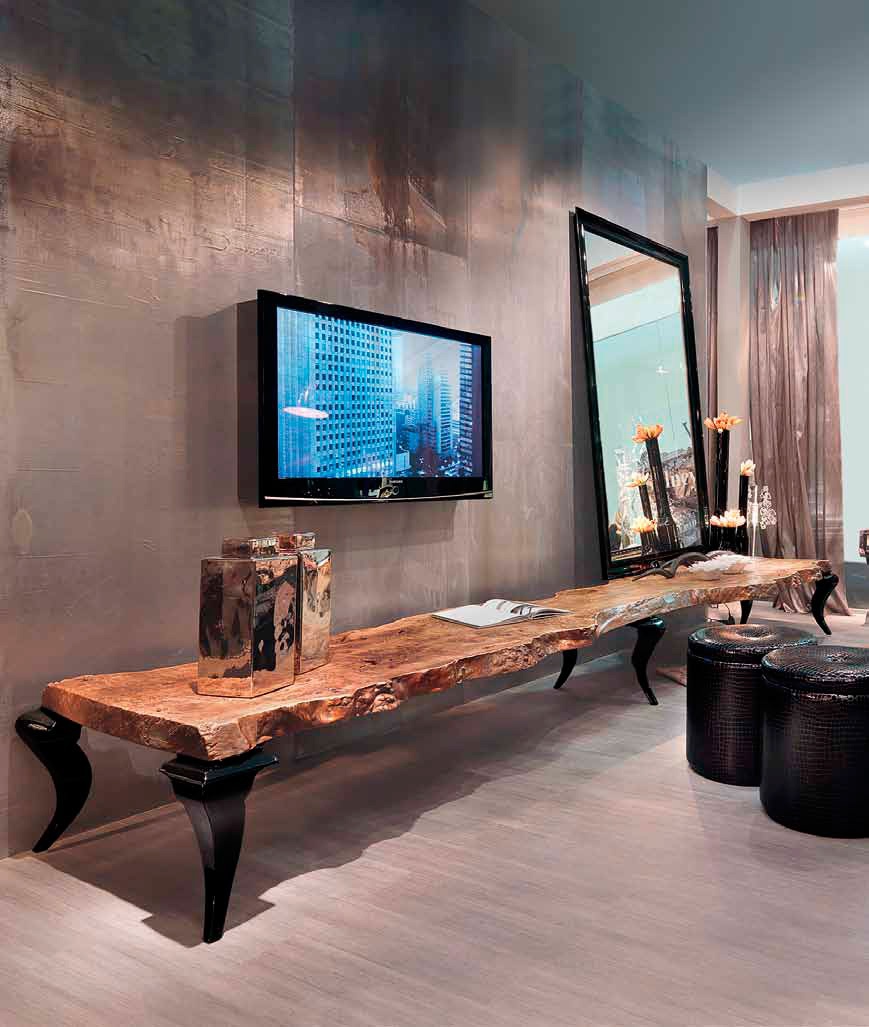 Bench Sidney Bizzotto Italian manufacturer. Table top made from basal wood (radiaca), 200 year old trees. This tree is unique as it occurs in specific environmental conditions, such as floods, landslides, and therefore each product from the "radica" by their unique sizes and shapes. The legs are made of wood, figure, covered with black varnish. And unique design solution for modern interior dining room or kitchen.