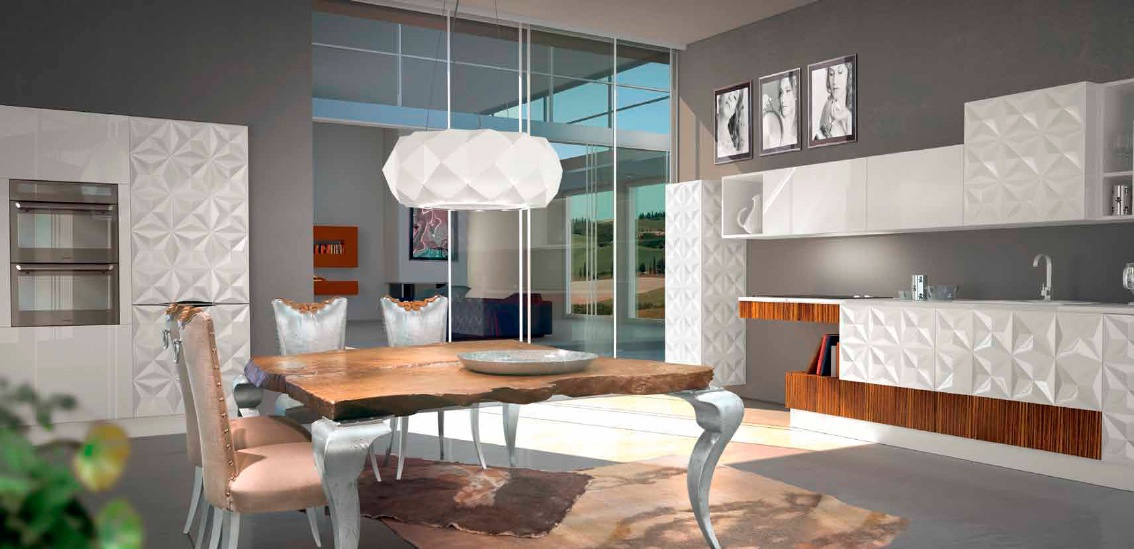 Kitchen (kitchen set) Sidney Bizzotto Italian manufacturer. The system storage for the kitchen. Consists of mounted and floor cabinets, built-in columns. The kitchen provides all necessary equipment. Doors made from solid wood, covered with white high gloss lacquer finish and veneer rosewood. Color to be selected from the manufacturer's catalogue. The design solution for this kitchen interior.