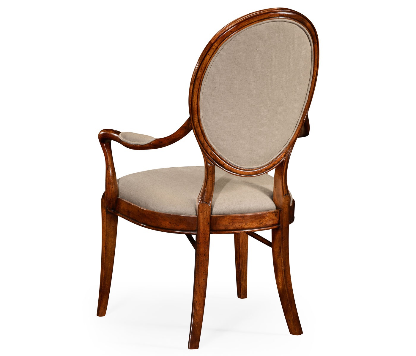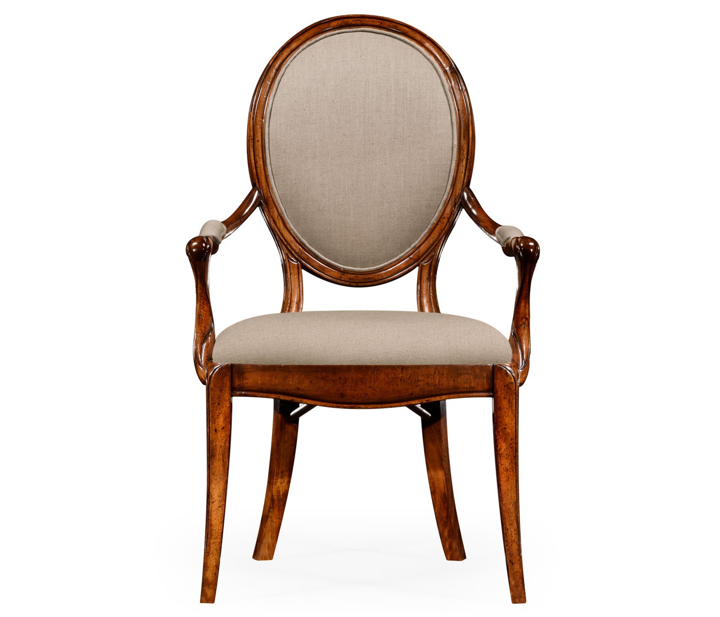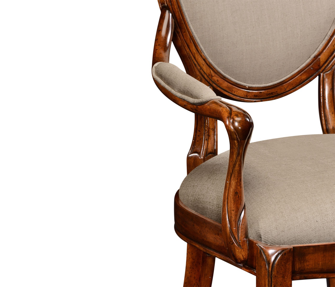 The Windsor chair from the American manufacturer Jonathan Charles. The model with armrests. The frame is made from wood. The upholstery is made of textile cloth. On the armrests padded lining. Dining chair for dining room in classic style, the original 1790.