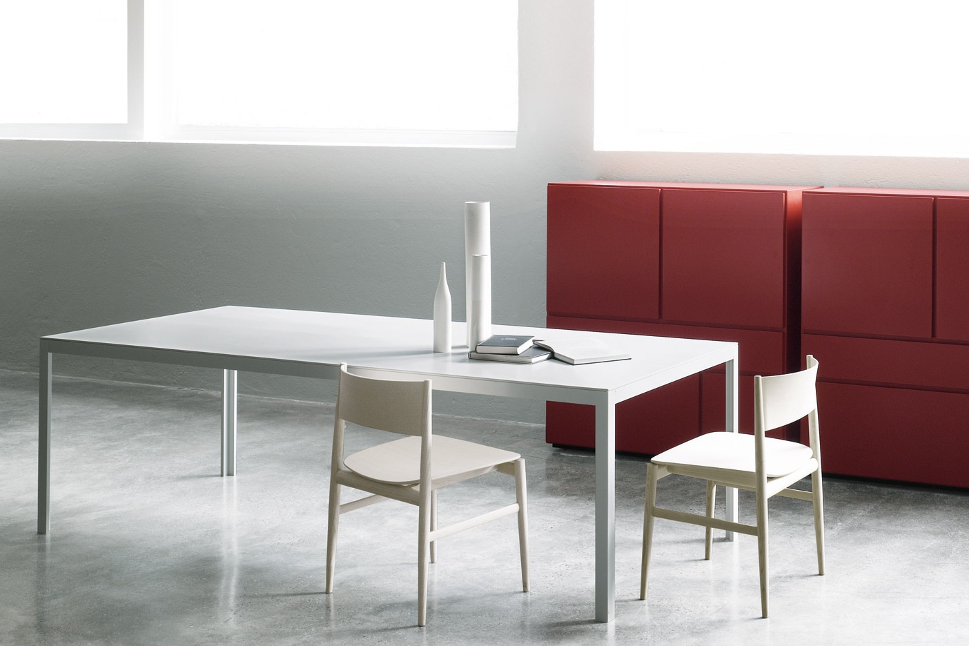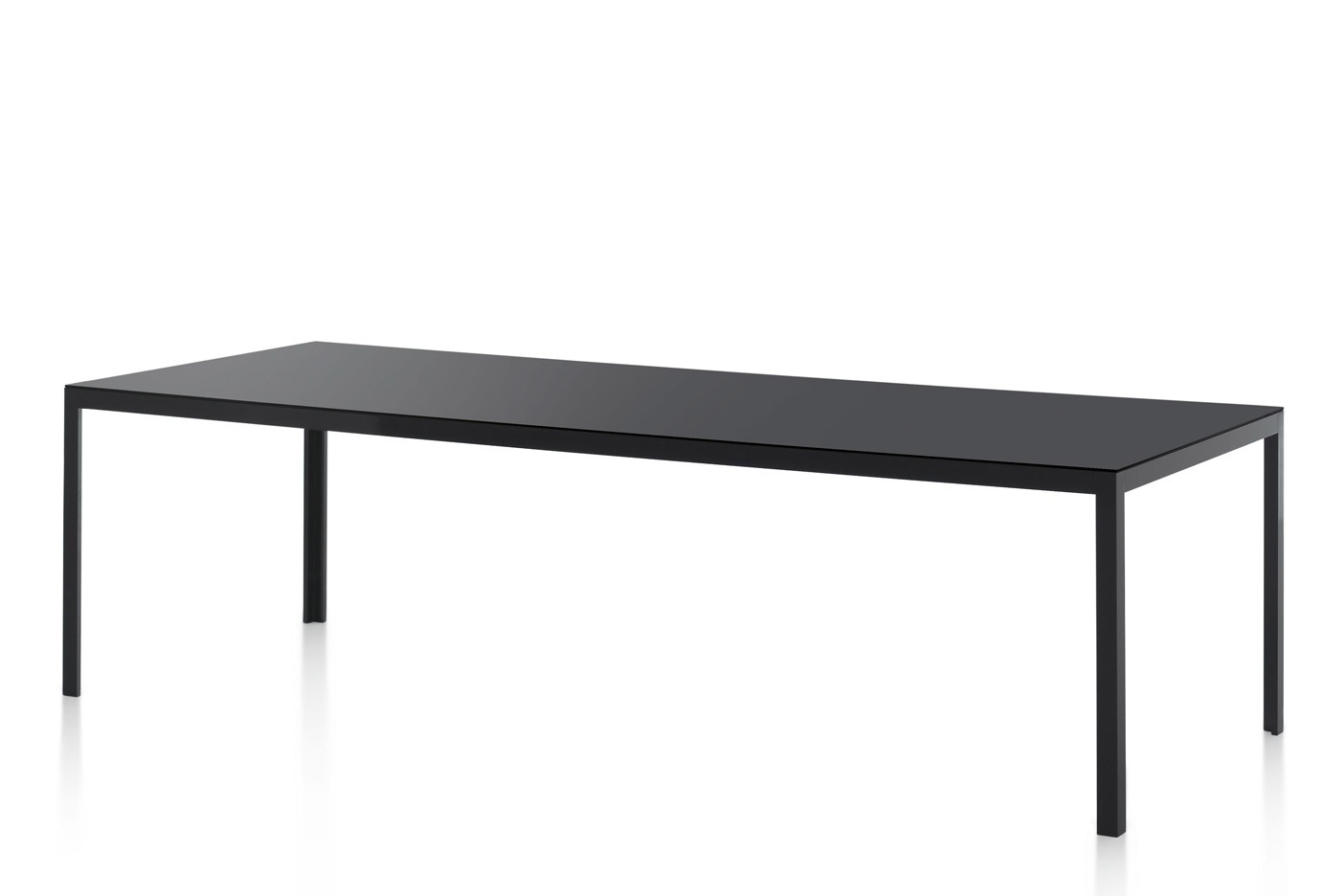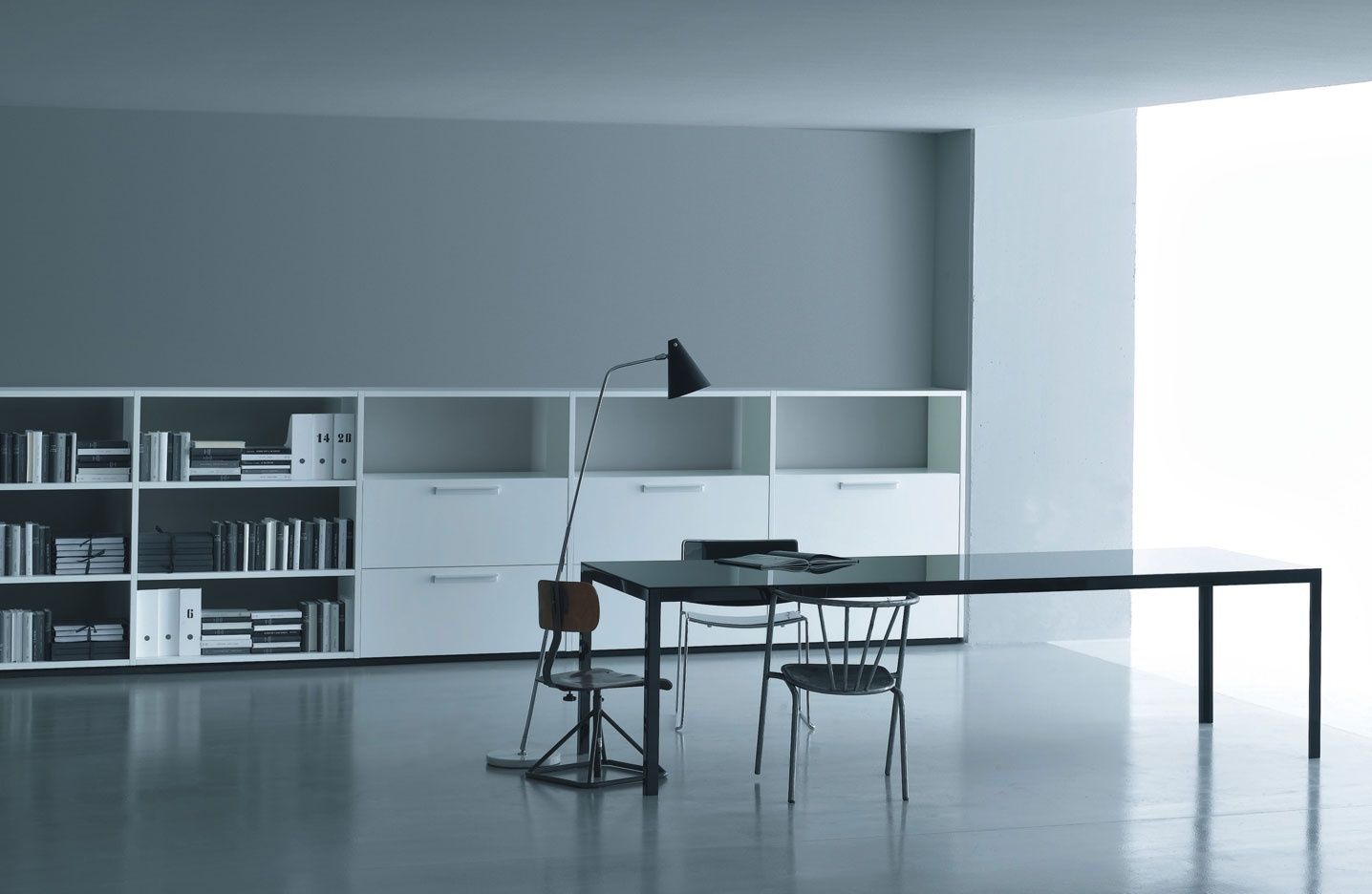 The Fractal table from Italian manufacturer Porro. The model with square or rectangular top. The legs are made in shape of Latin letter "L". the material is aluminum with a glossy finish or coated in white or black lacquer. The table top is available in different versions, transparent, treatment must be performed or painted black glass; wood finish in "natural" or coloured; artificial stone Pral®. The model can be adapted to work in the office, to lay the cable duct (in feet), to complement the Desk sliding shelf for computer and wall mounted cupboards.