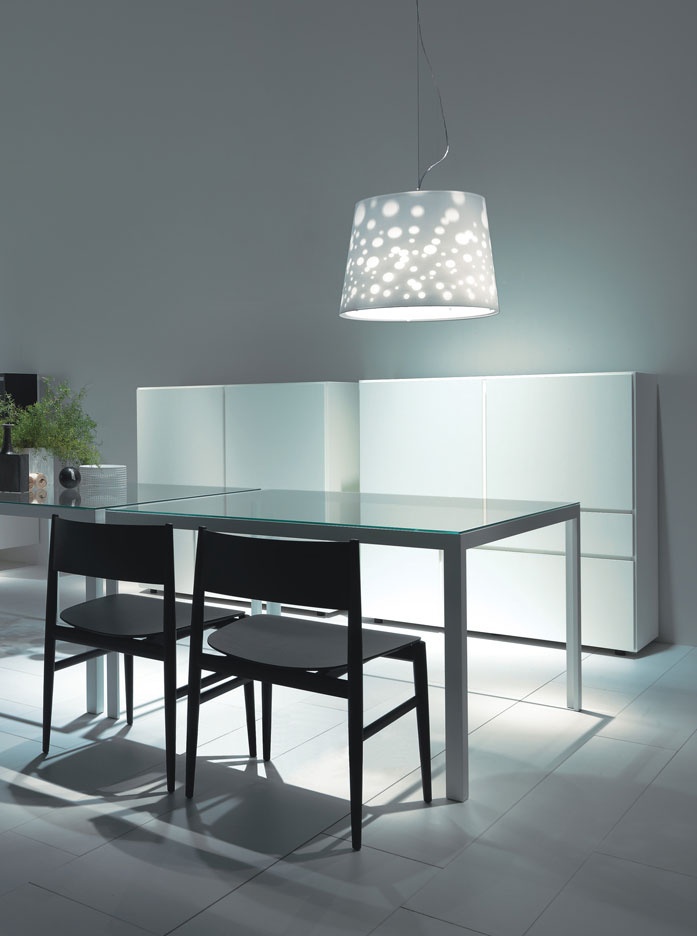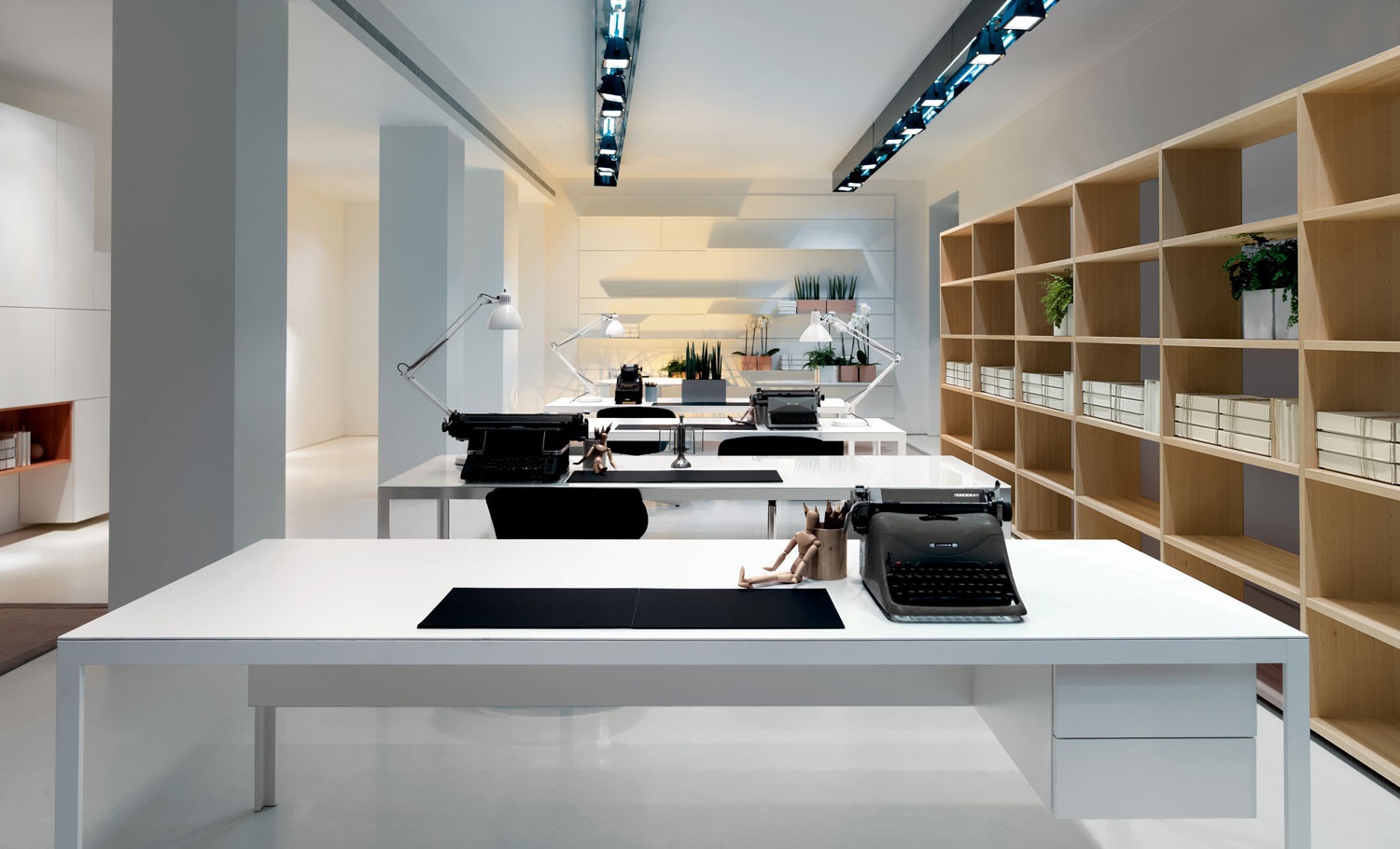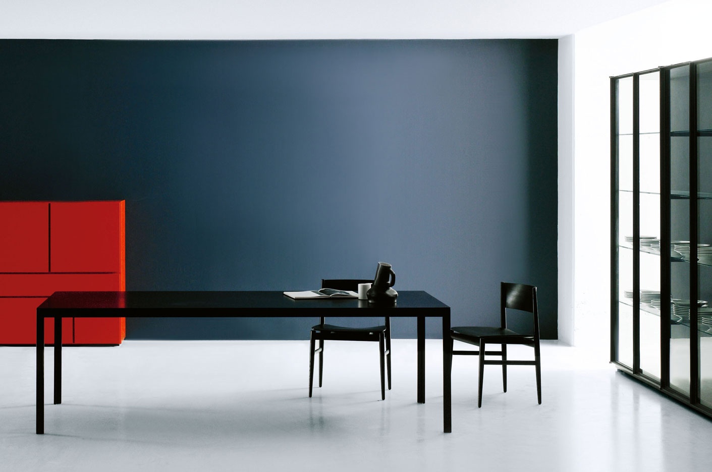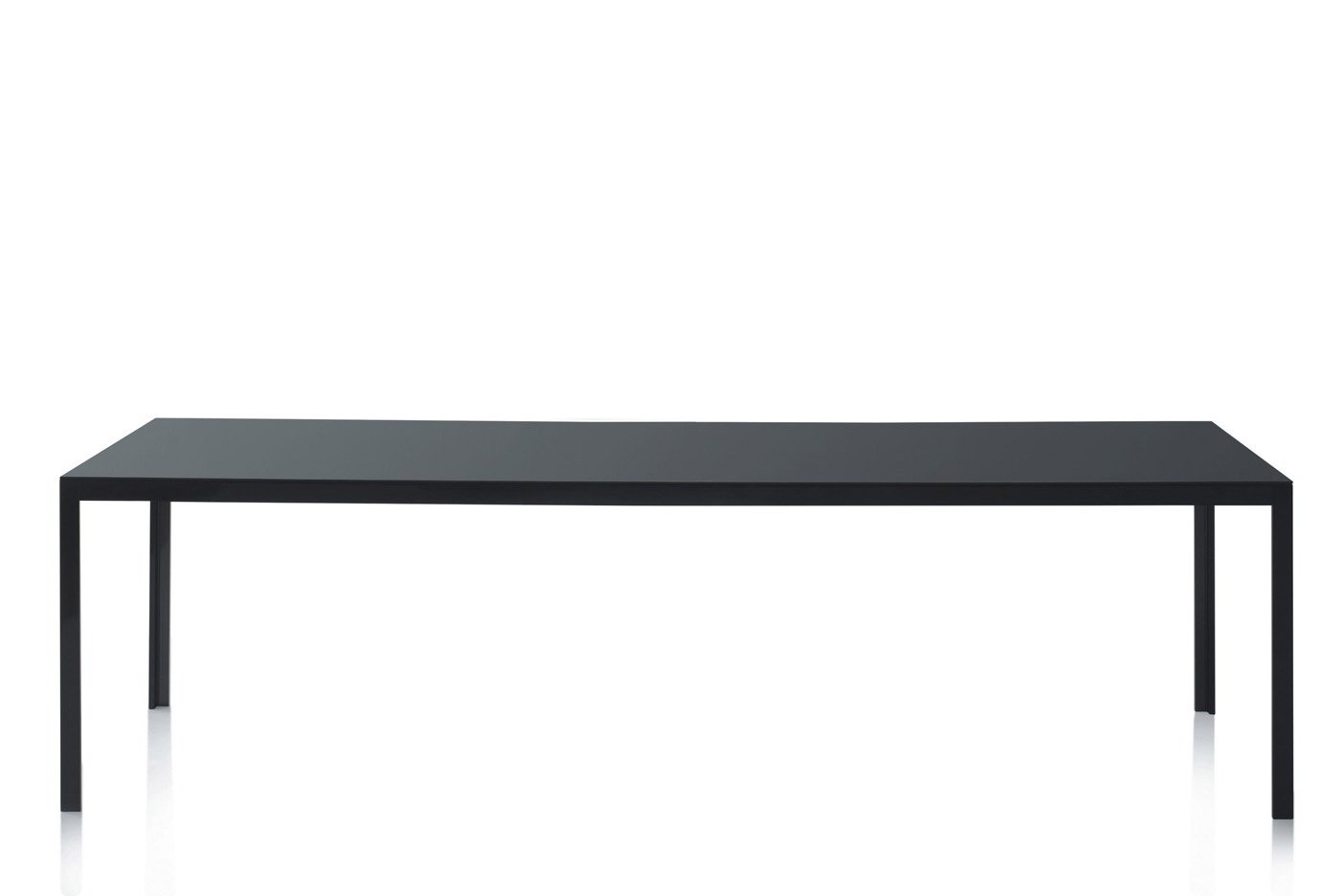 The Fractal table from Italian manufacturer Porro. The model with square or rectangular top. The legs are made in shape of Latin letter "L". the material is aluminum with a glossy finish or coated in white or black lacquer. The table top is available in different versions, transparent, treatment must be performed or painted black glass; wood finish in "natural" or coloured; artificial stone Pral®. The model can be adapted to work in the office, to lay the cable duct (in feet), to complement the Desk sliding shelf for computer and wall mounted cupboards.