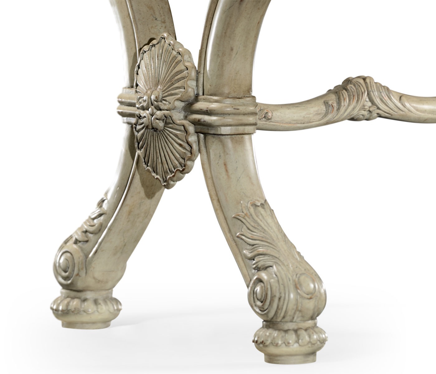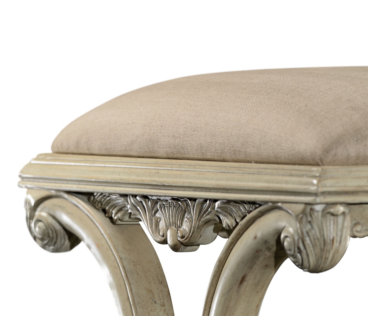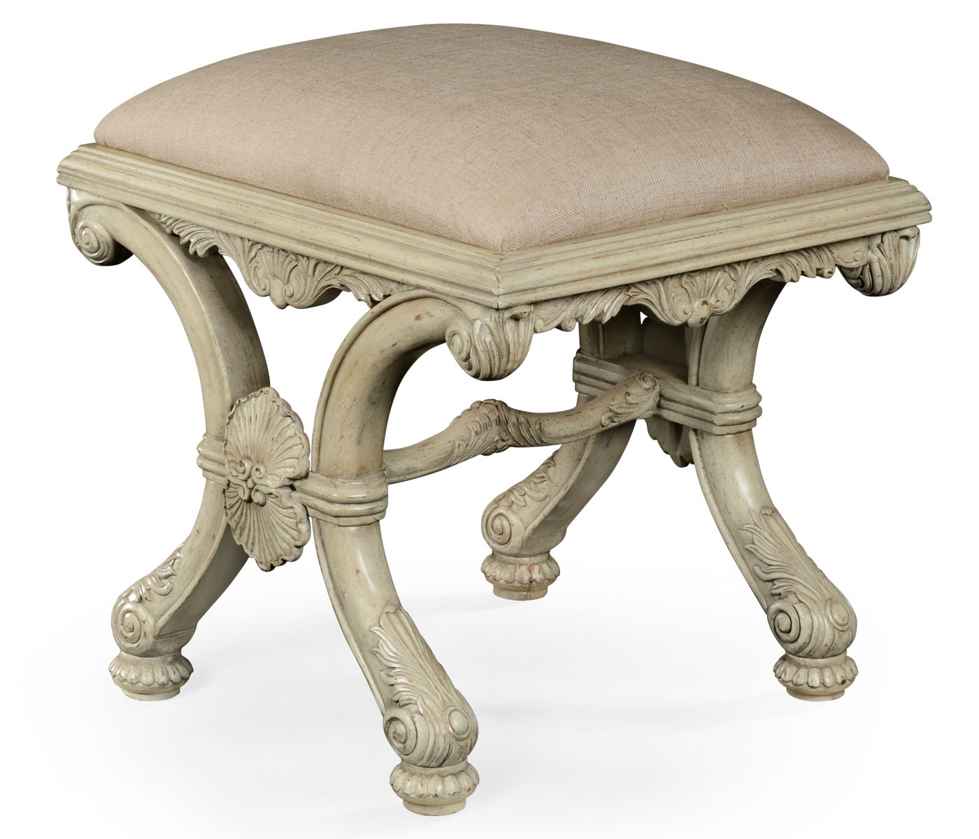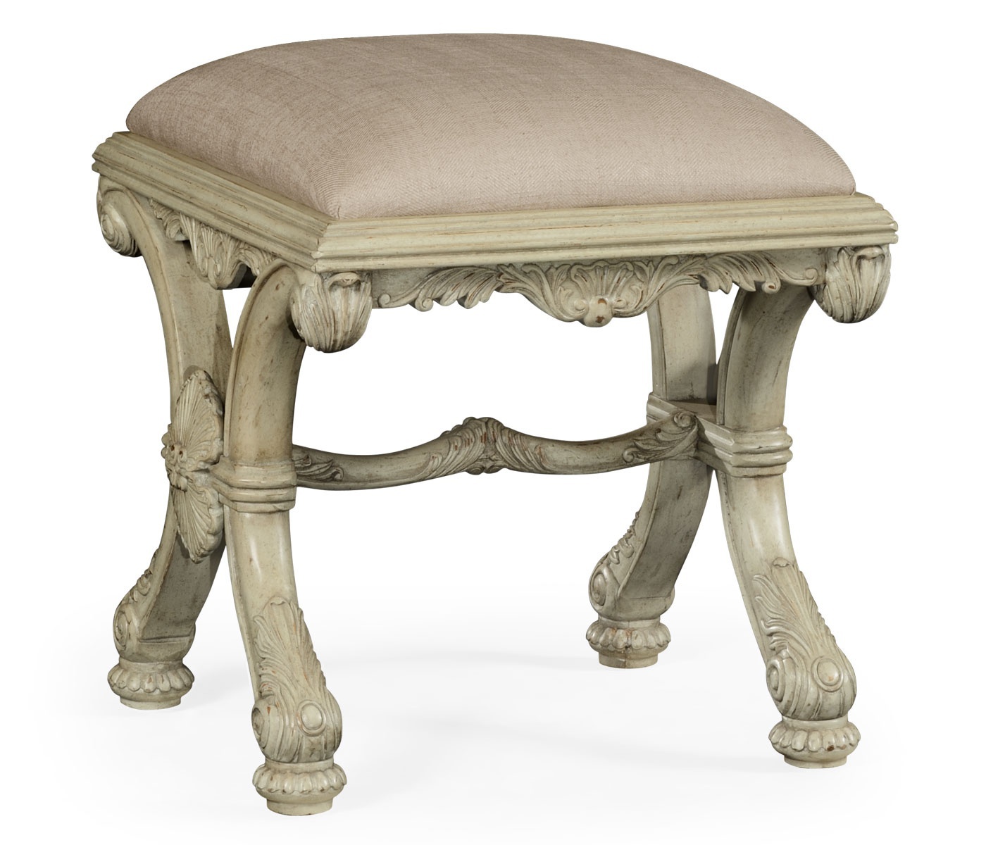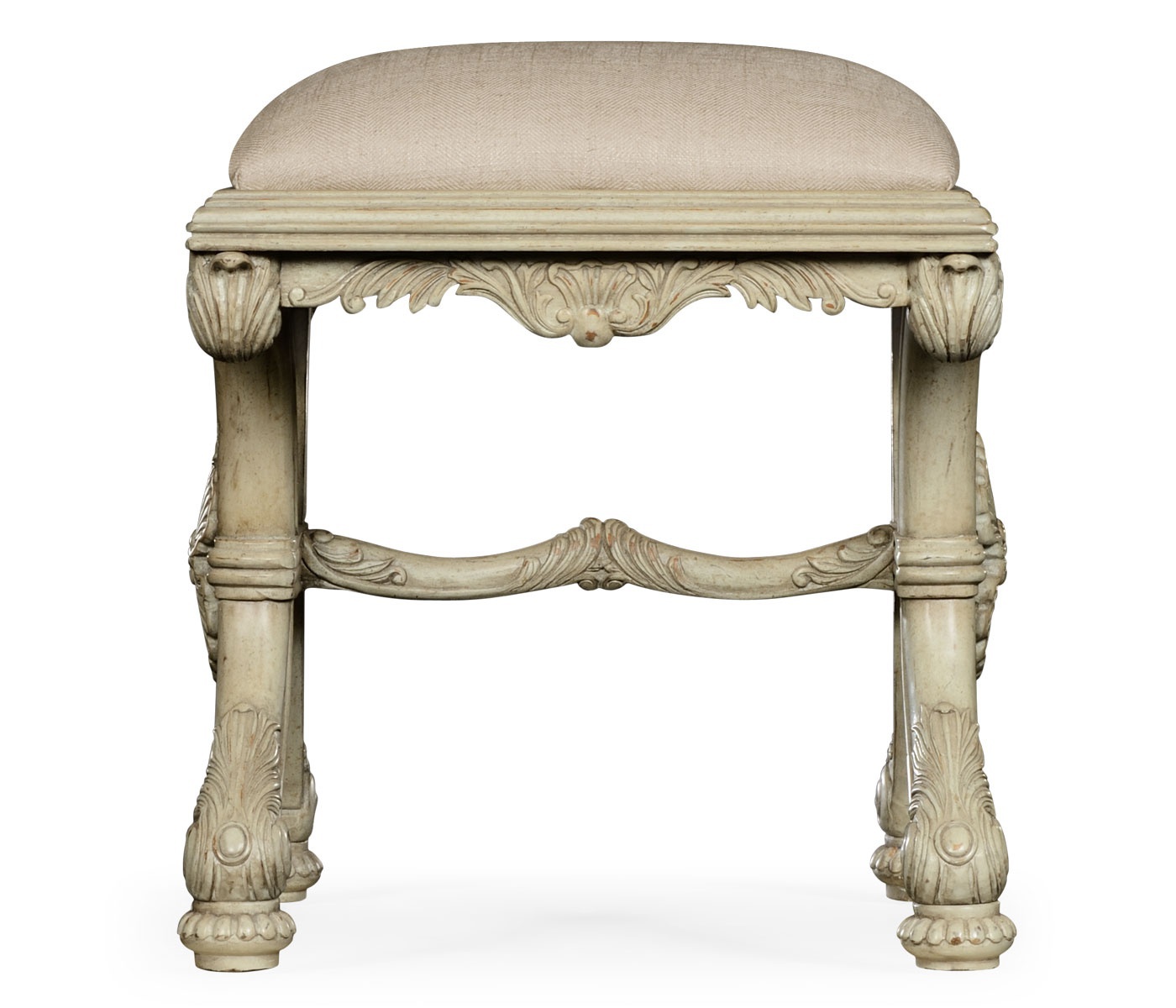 Stool Country Farmhouse from the American manufacturer Jonathan Charles. Model with a frame made of wood. The frame is carved and painted with the effect of aging. The seat is upholstered with a textile cloth. Puff filled with French provincial style.