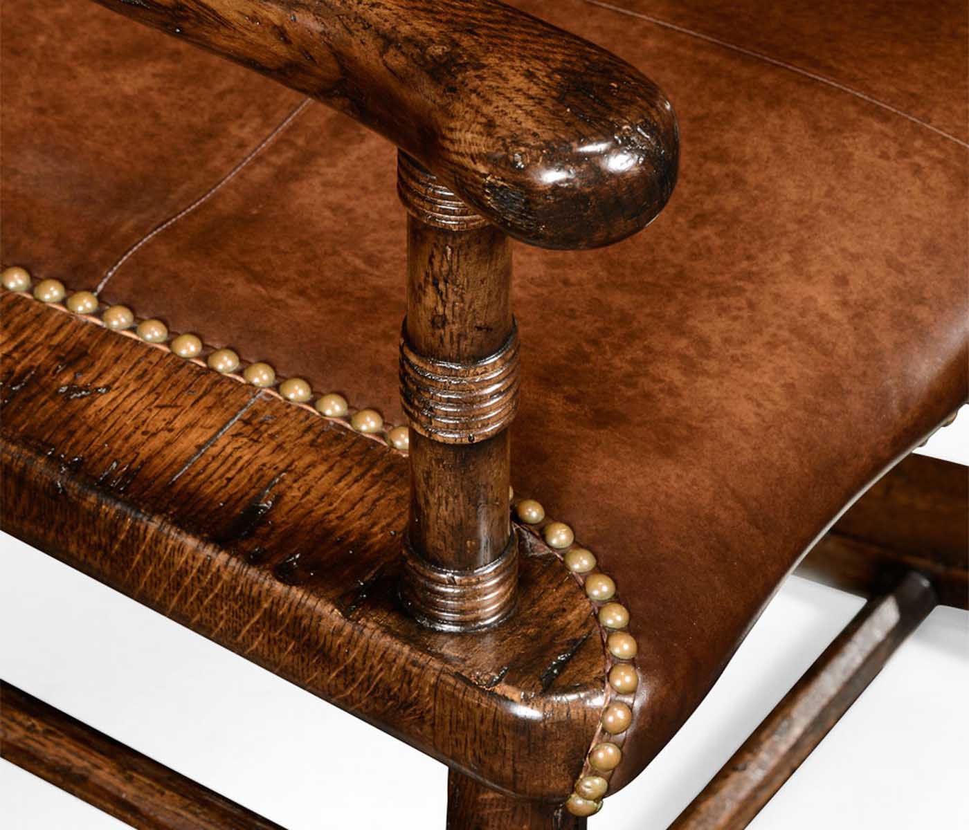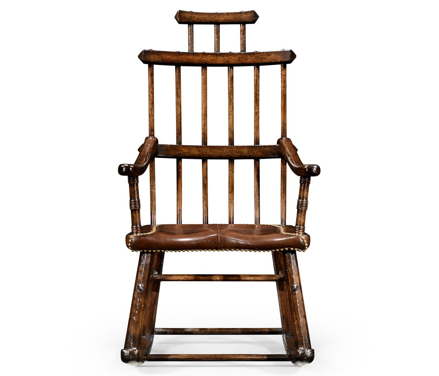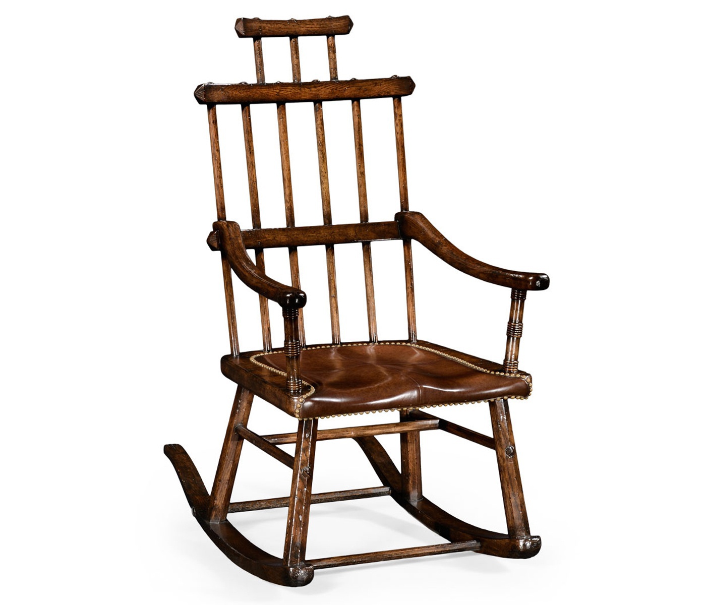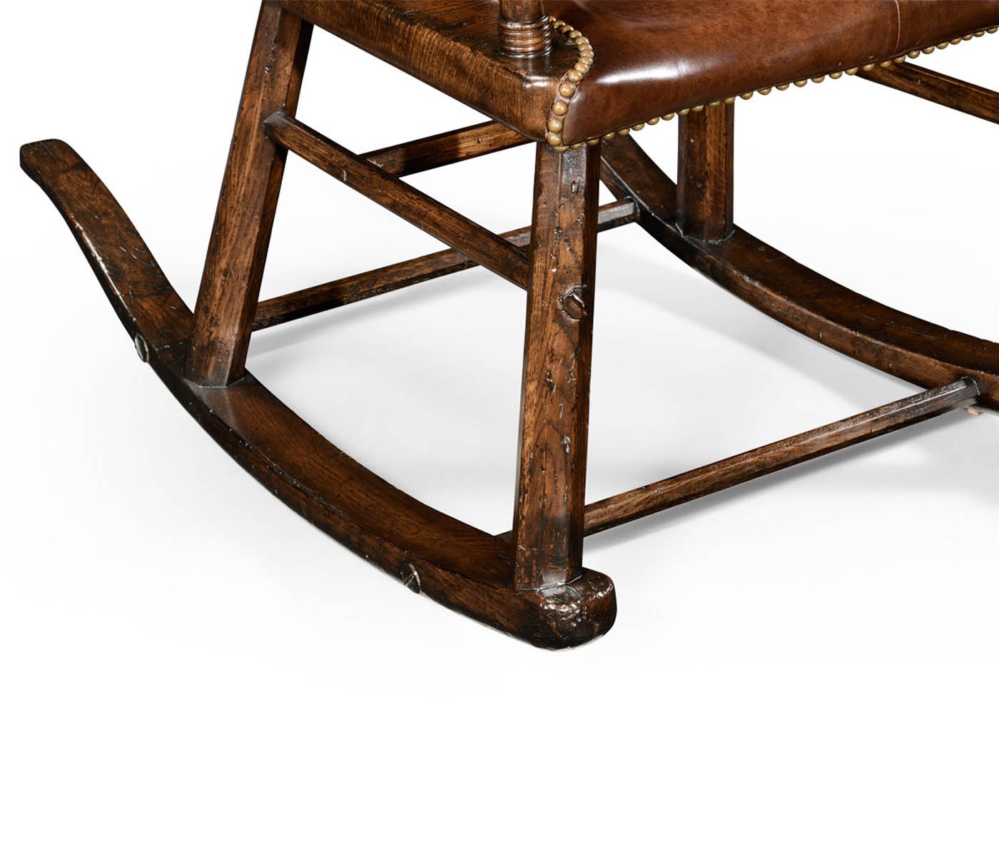 Rocking chair Tudor Oak from the American manufacturer Jonathan Charles. The model with armrests and high back. The frame is made of wood with the effect of aging and varnished. Seat upholstered in leather.
