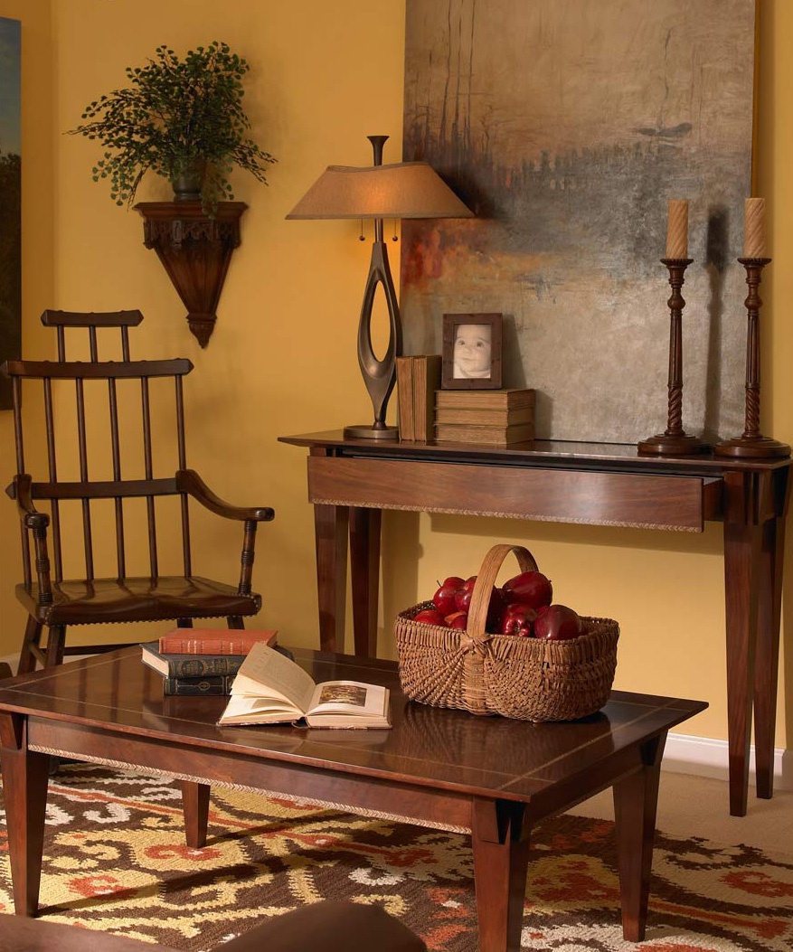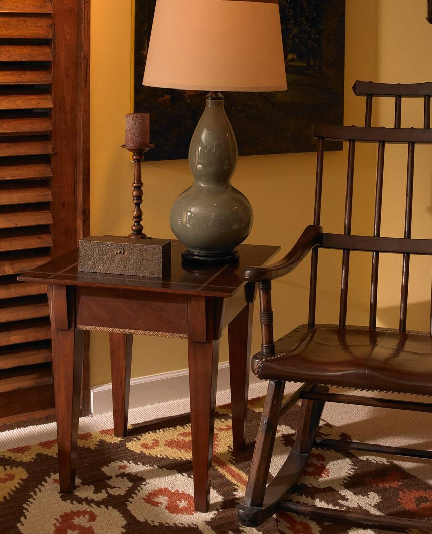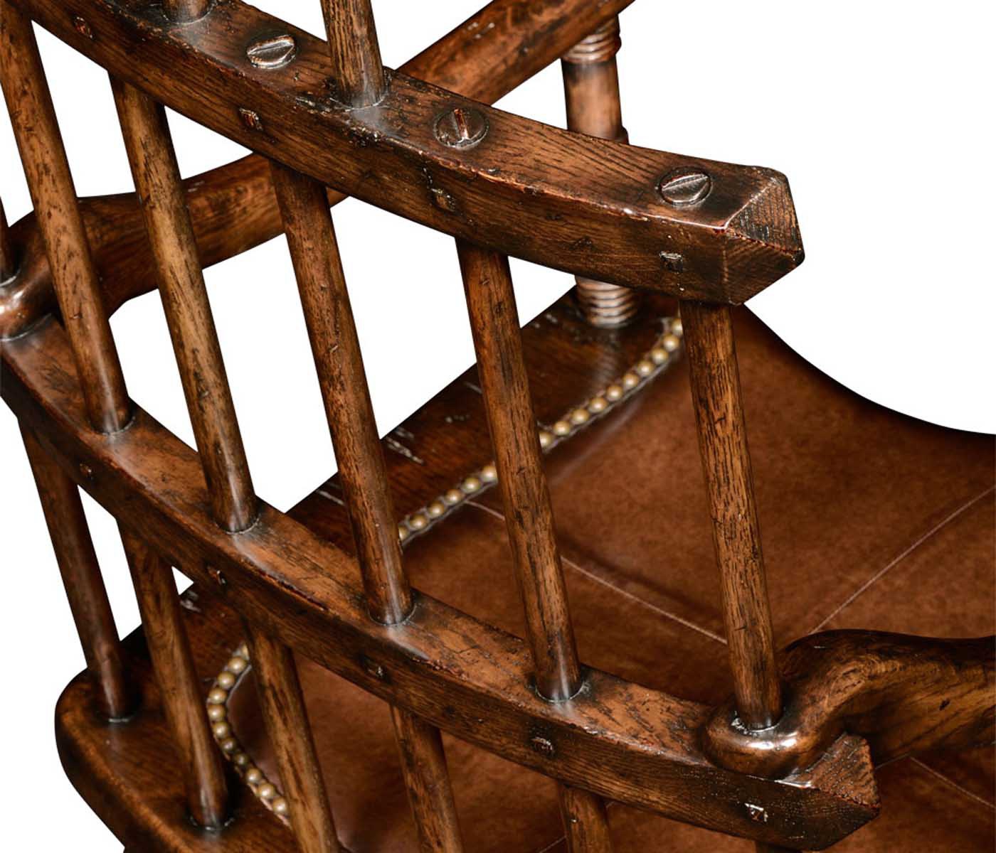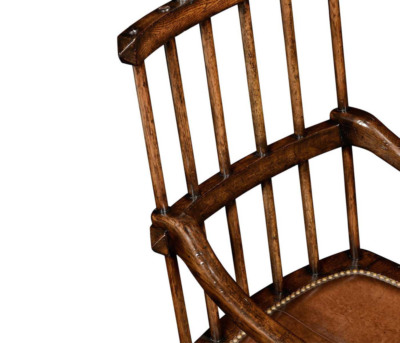 Rocking chair Tudor Oak from the American manufacturer Jonathan Charles. The model with armrests and high back. The frame is made of wood with the effect of aging and varnished. Seat upholstered in leather.