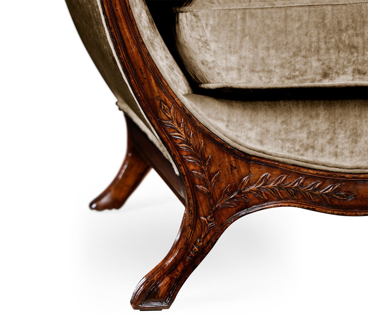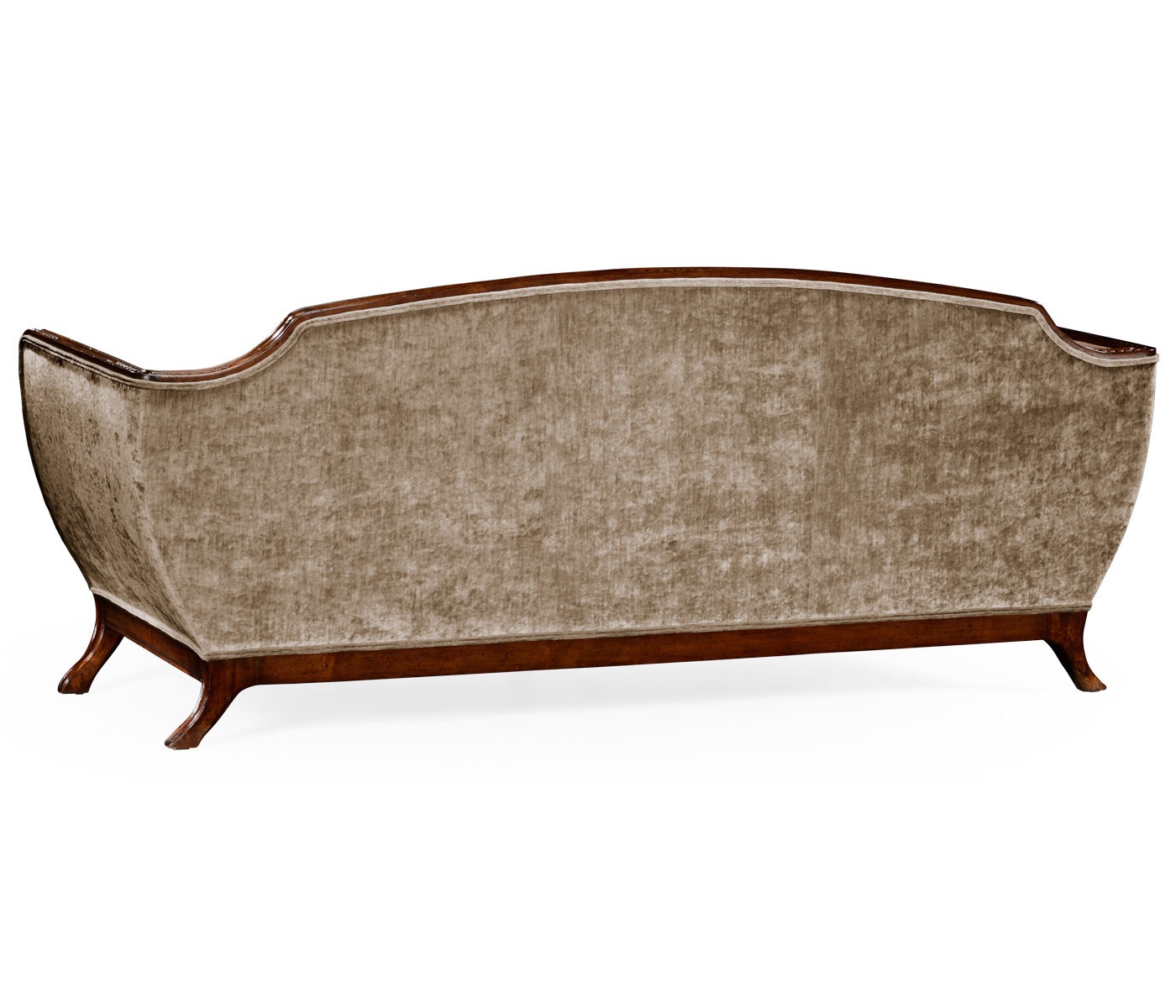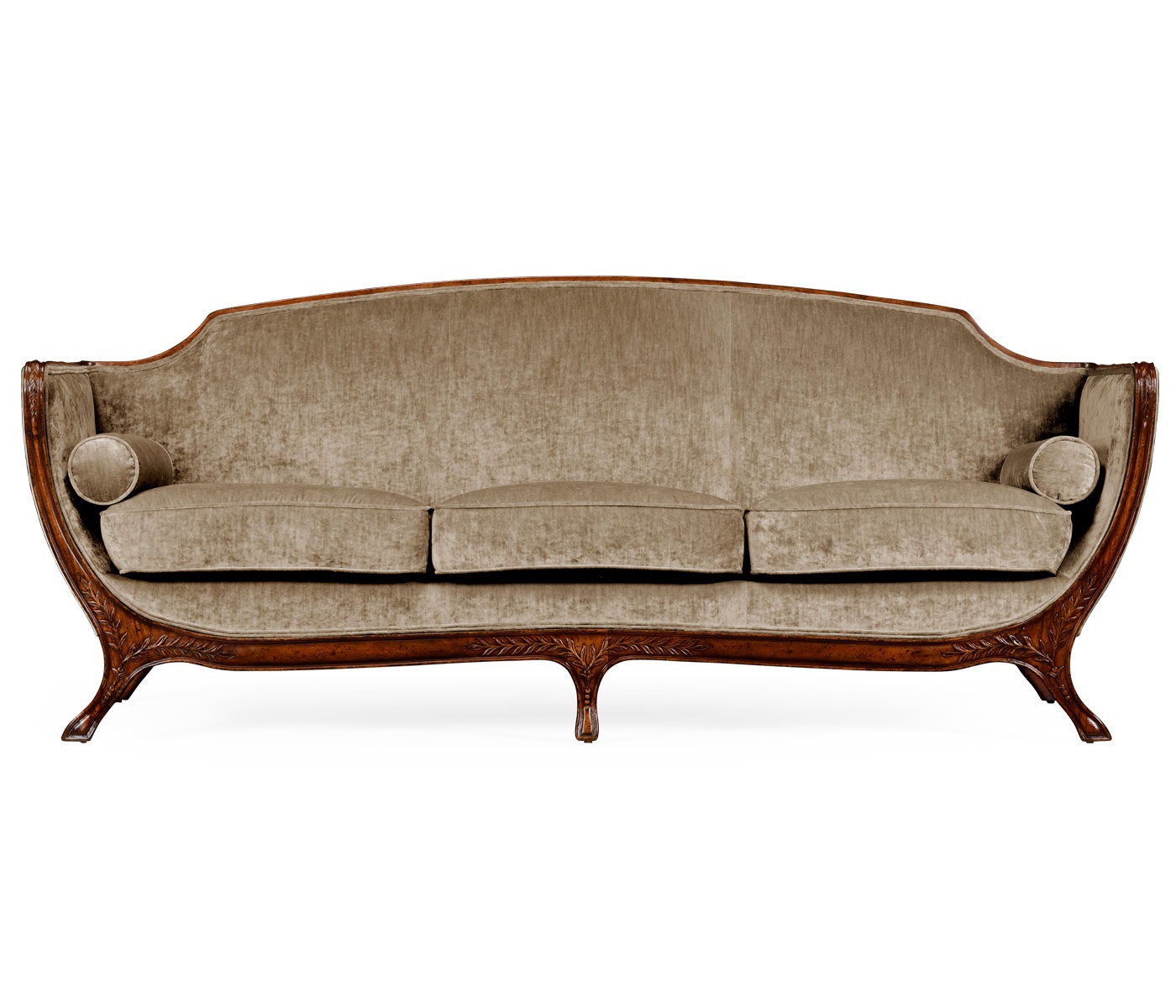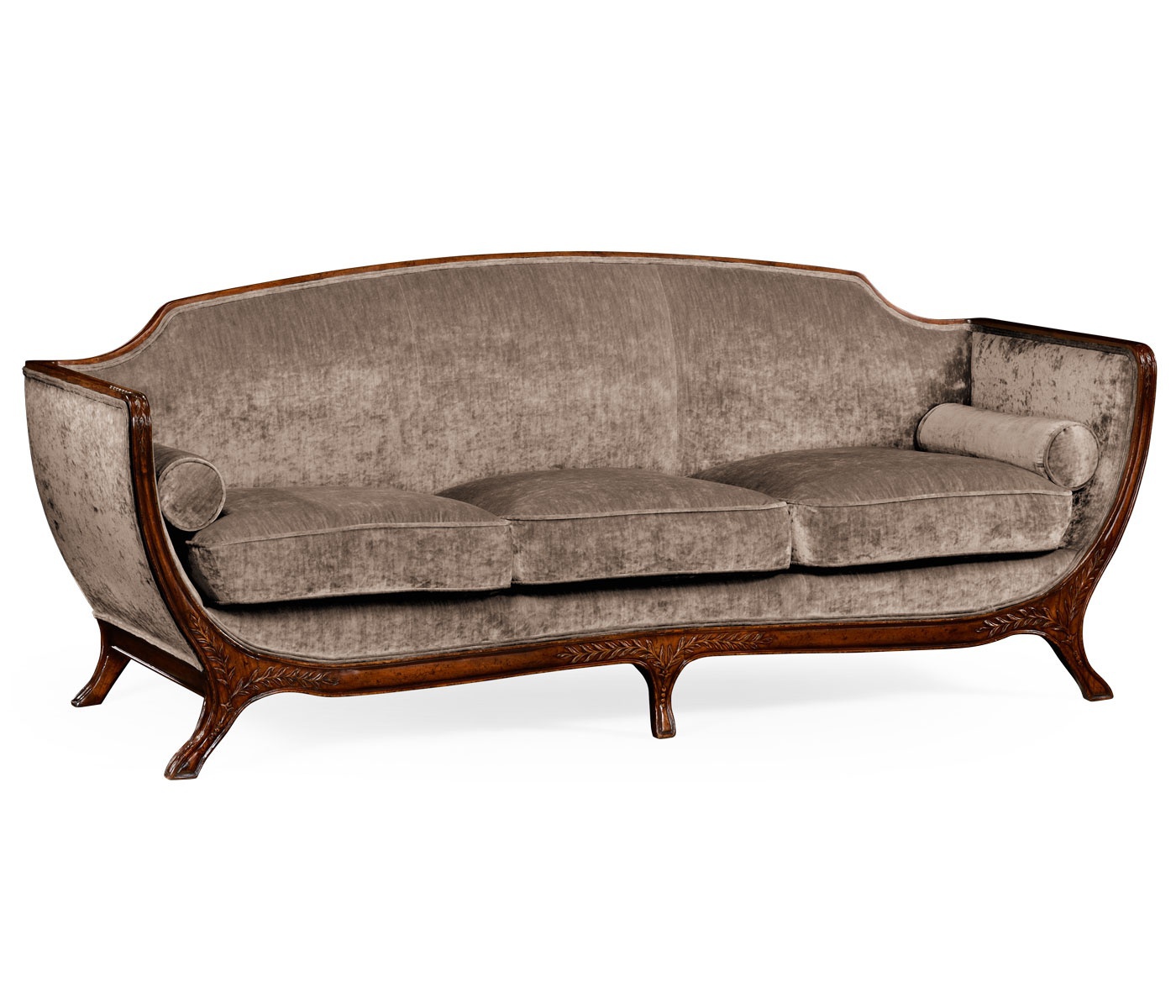 Three seater sofa Versailles from the manufacturer Jonathan Charles. Model with removable seat cushions and decorative cushions in the form of rollers. The frame and legs are made of wood. Legs decorated with carved floral detail. The manufacturer offers 7 types of finishing and 4 colors of upholstery.