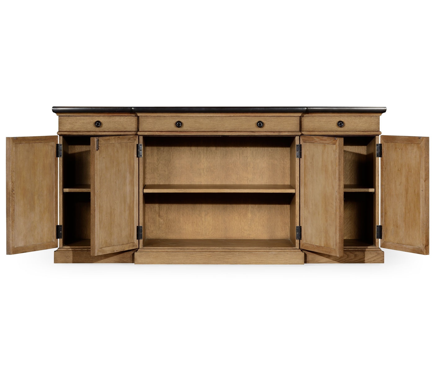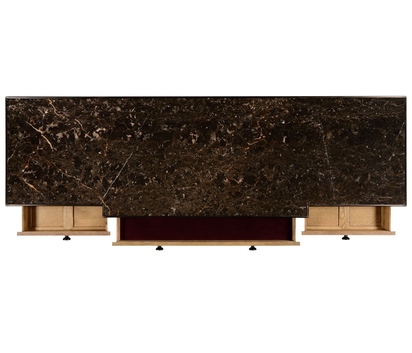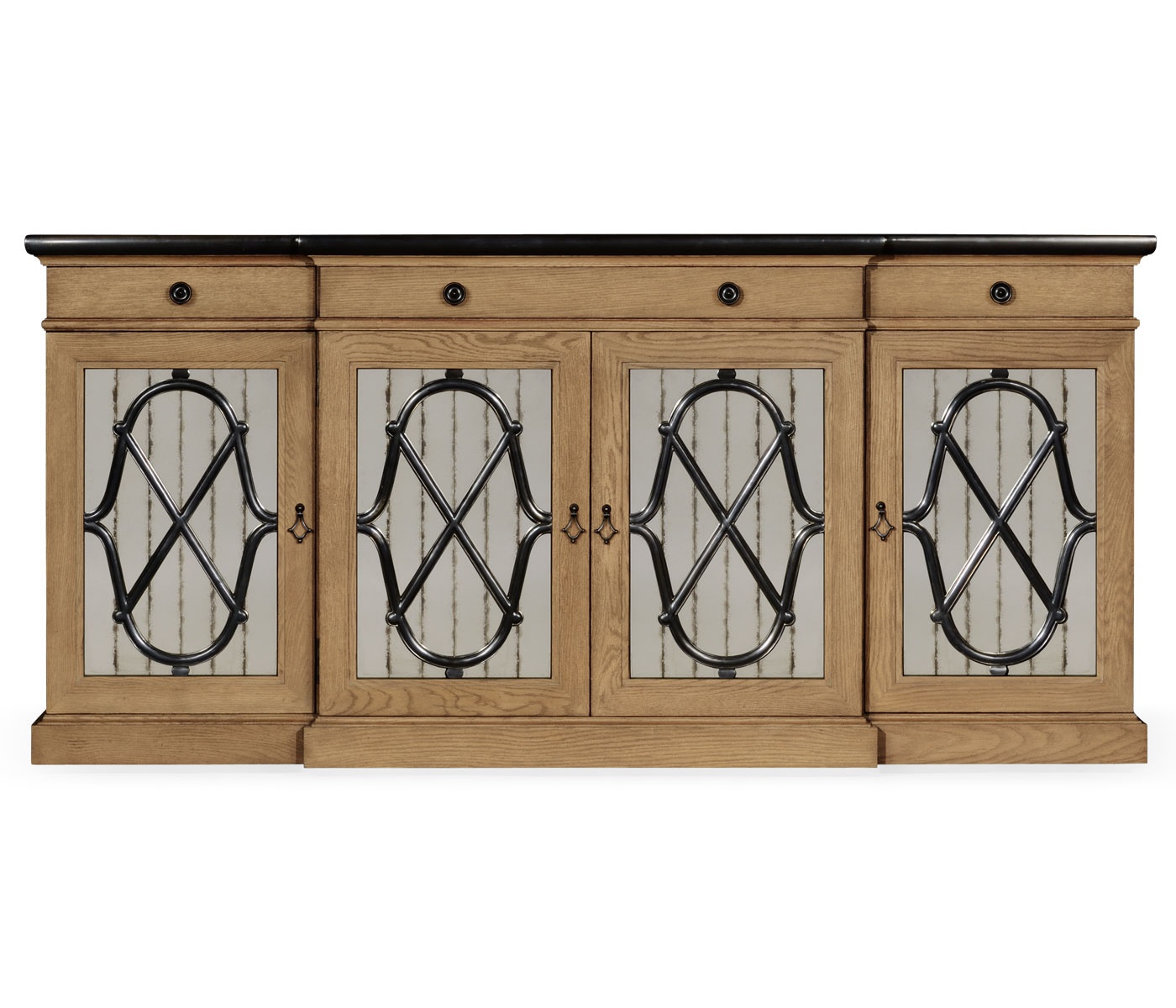 A snack bar William Yeoward from the American manufacturer Jonathan Charles. The body is made of wood. The table top is made of marble. The sideboard is equipped with drawers and doors. Shelves are adjustable in height for easy storage crystal and Cutlery. The model is decorated with bronze ornaments and artificially aged mirror panels.