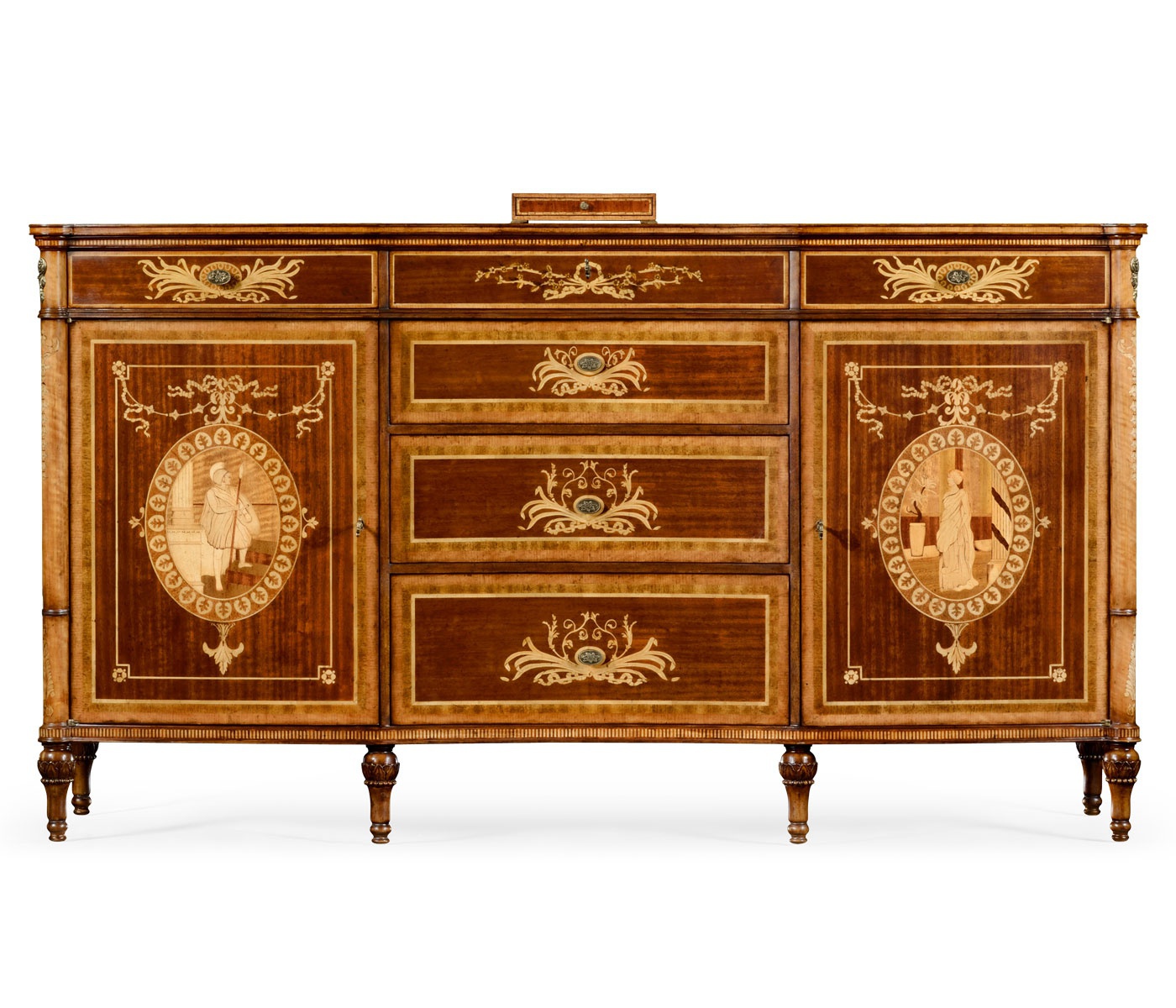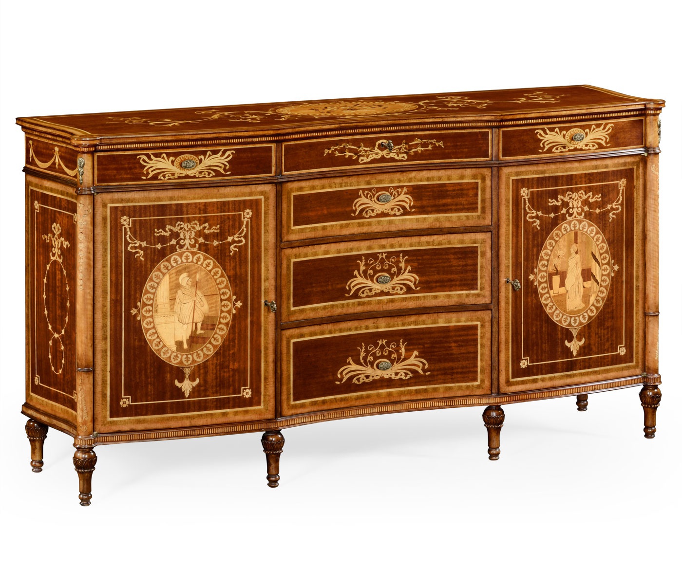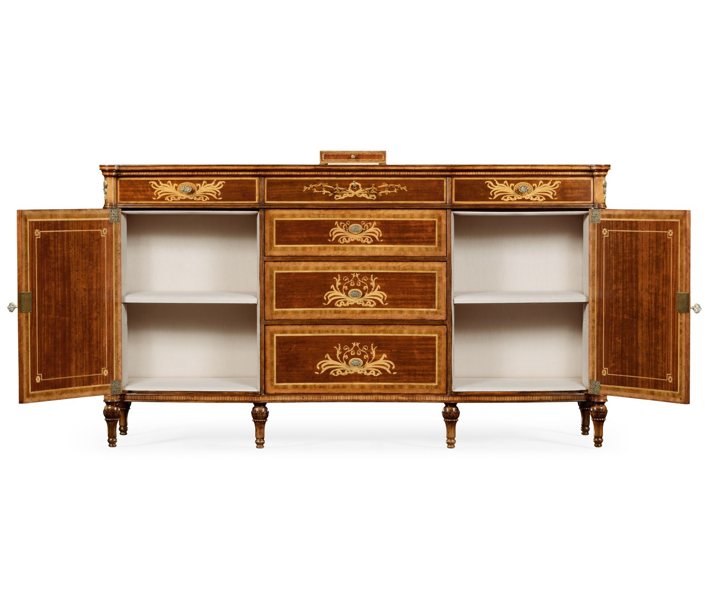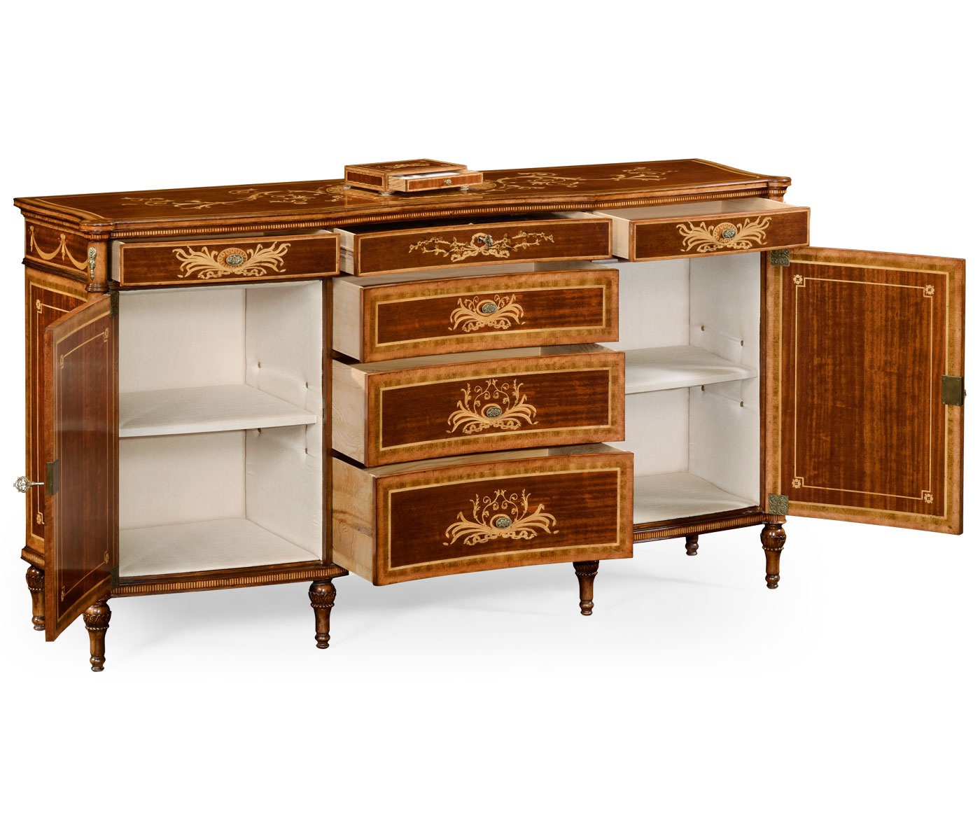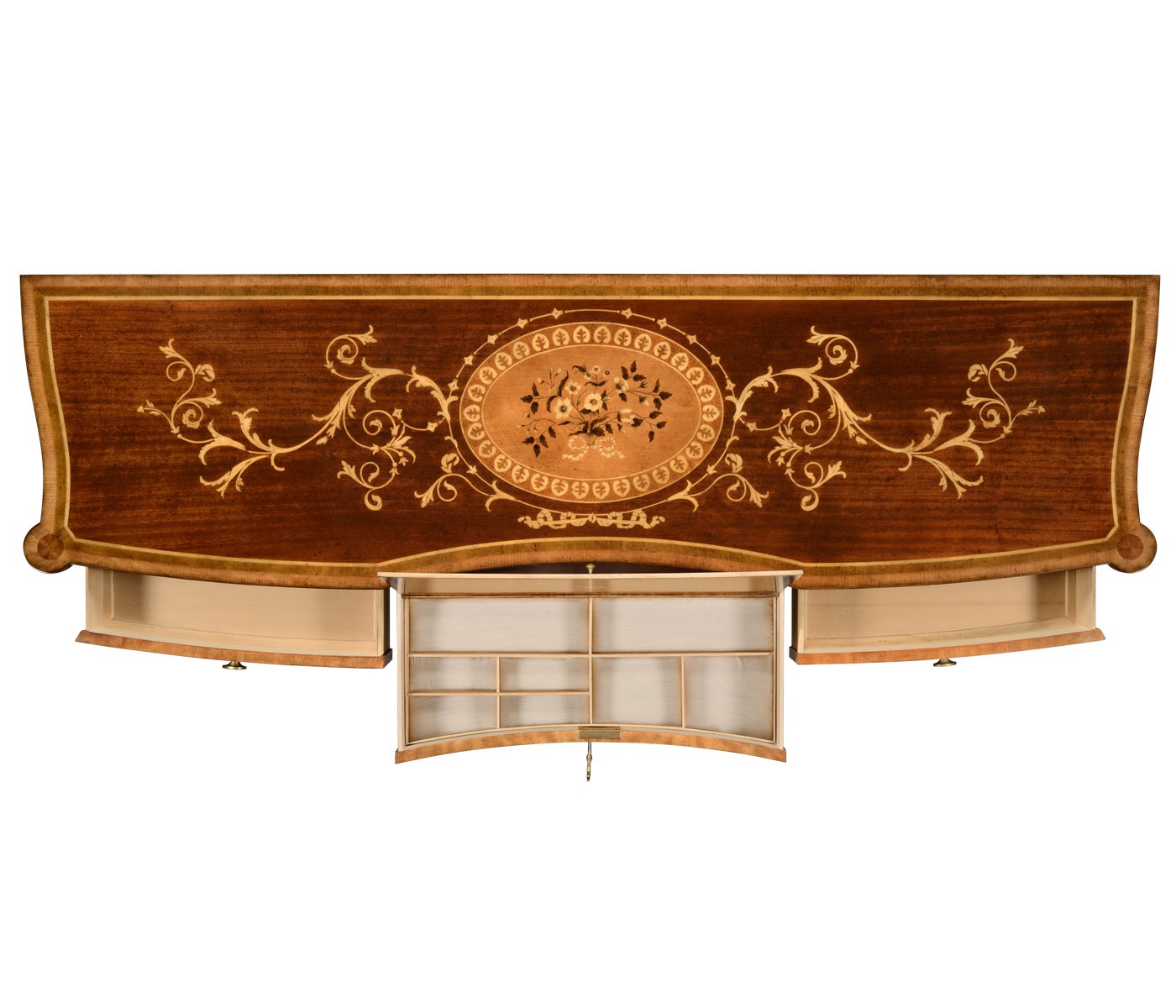 Signature sideboard from the American manufacturer Jonathan Charles. The model is inspired by antique sideboard 1880. The body is made of wood with mahogany finish and decorated with inlay. The buffet features two gently curved doors and drawers. Interior trim is made of silk and aromatic cedar. Limited edition of 200 pieces, individually numbered and signed.