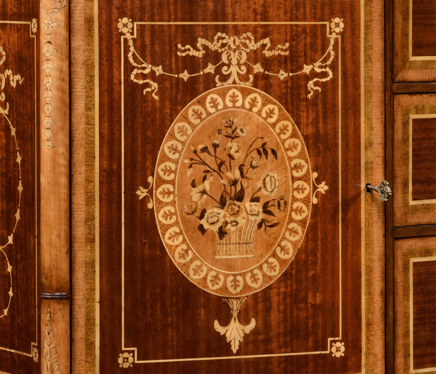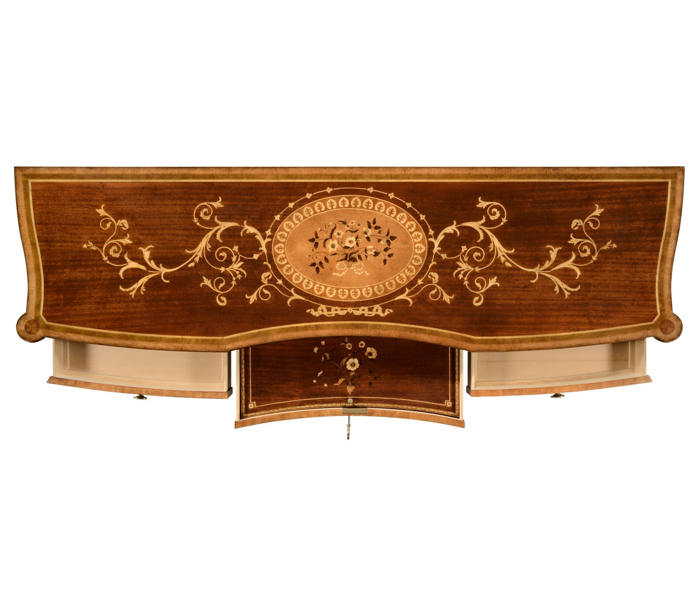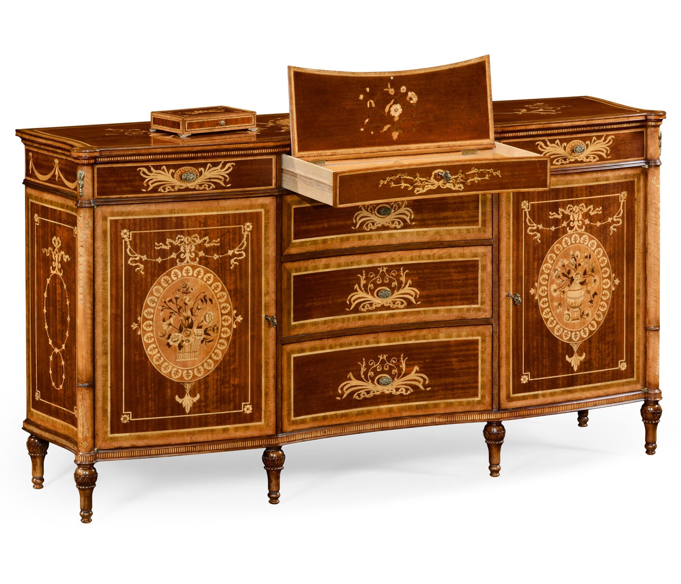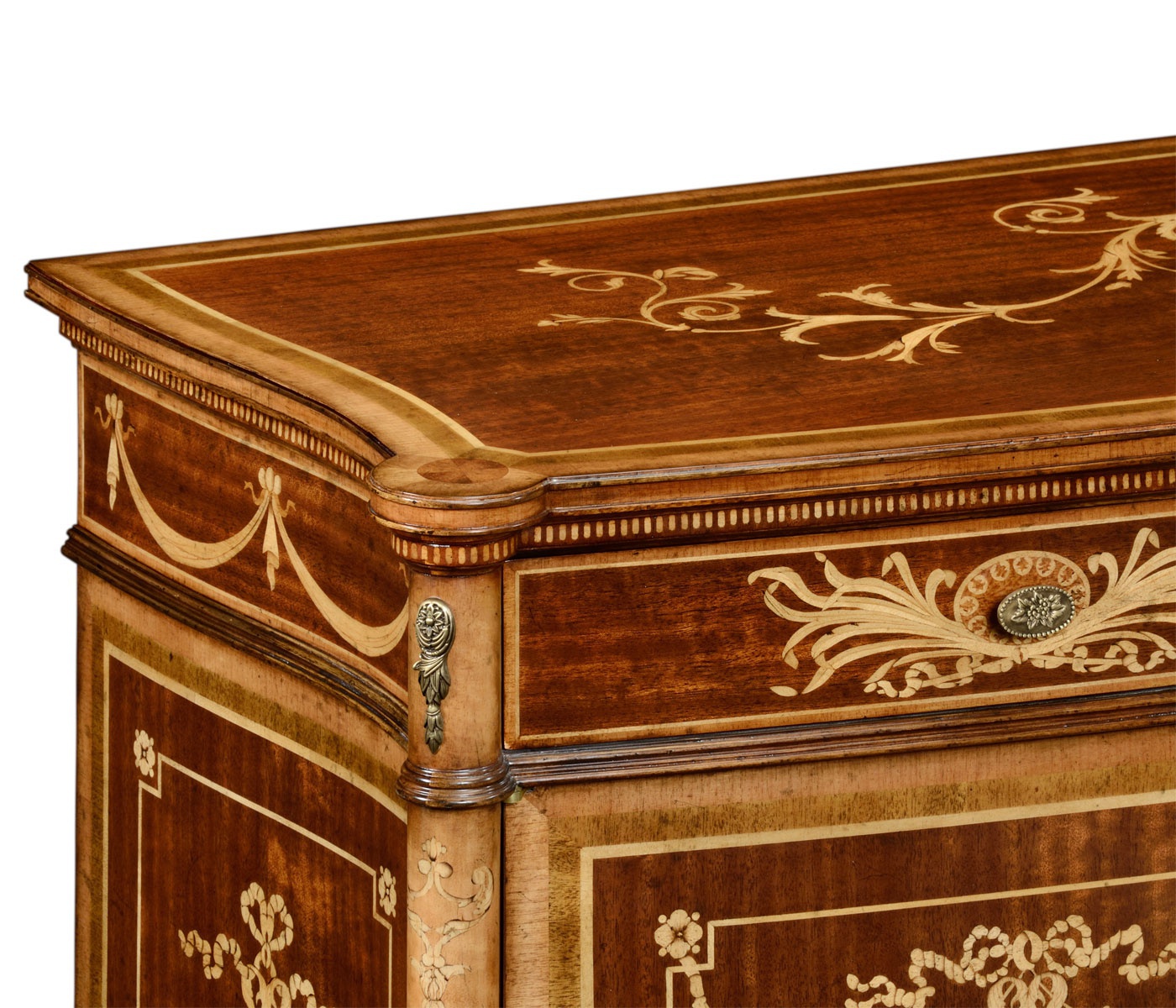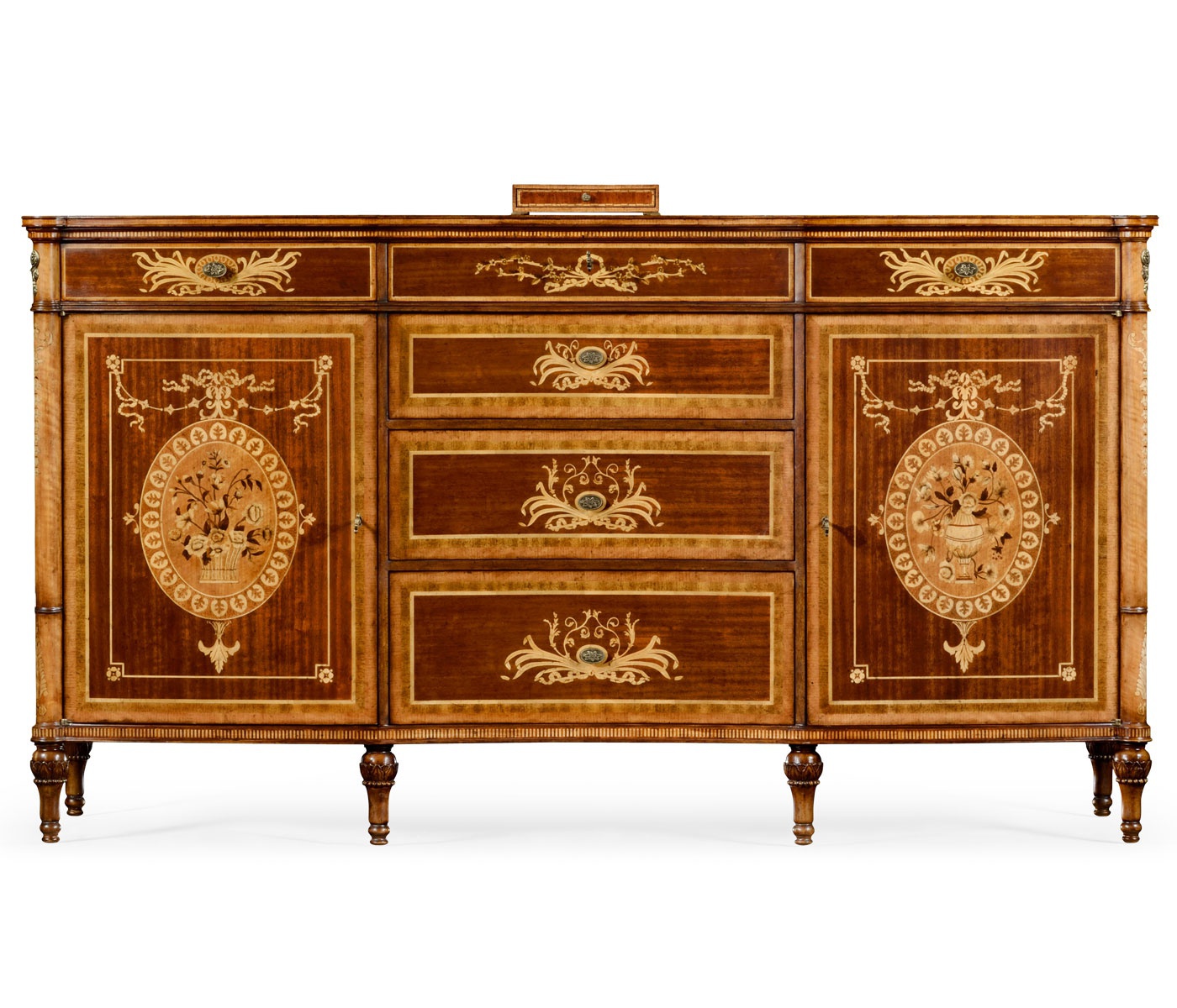 Signature sideboard from the American manufacturer Jonathan Charles. The model is inspired by antique sideboard 1880. Limited edition of 200 pieces, individually numbered and signed. The body is made from wood veneer finished in mahogany and decorated with inlaid. Sideboard with legs features two doors and drawers. Interior trim is made of silk and aromatic cedar.