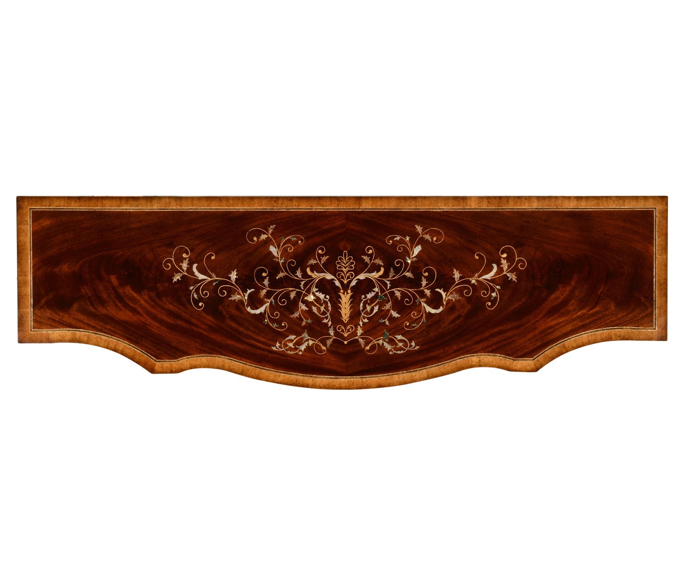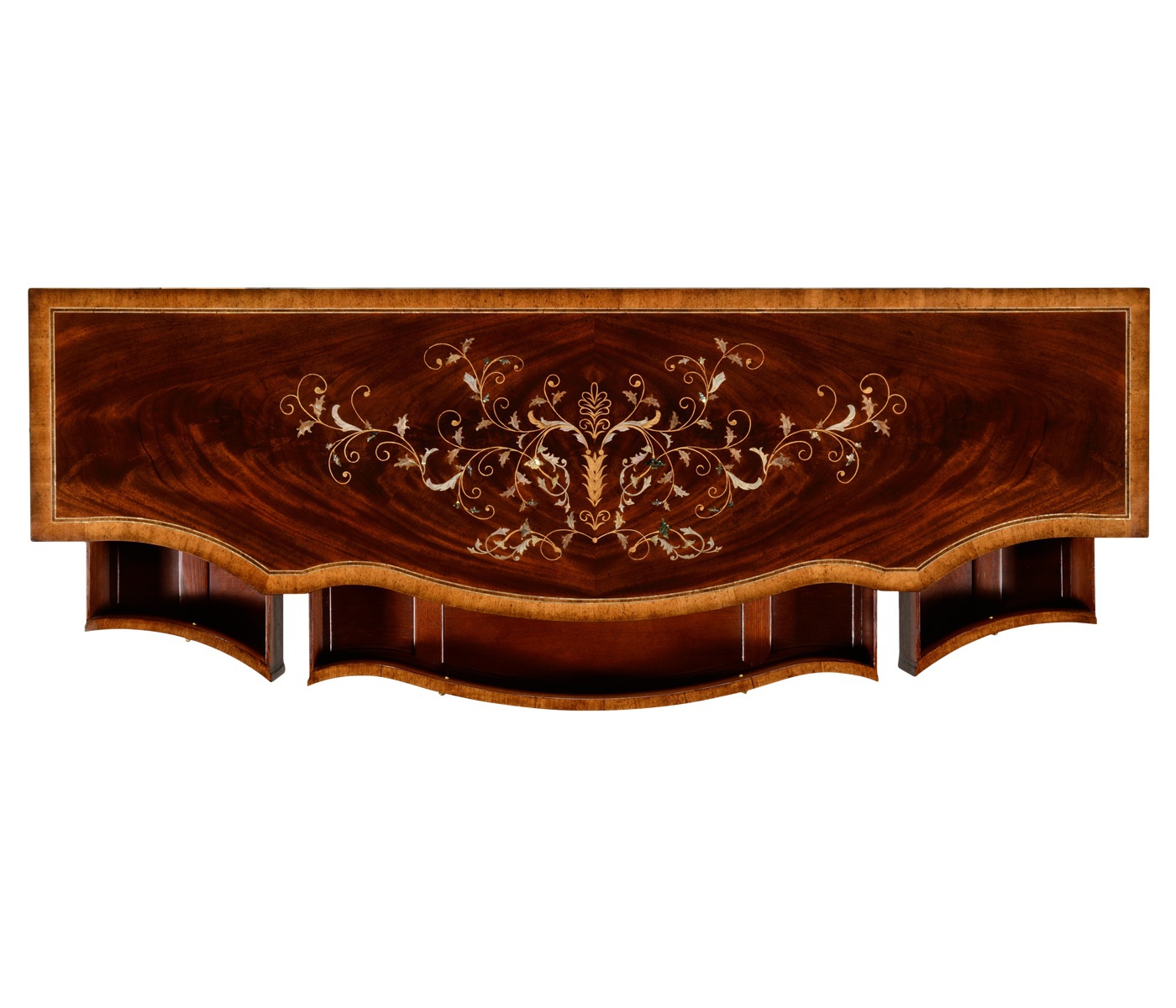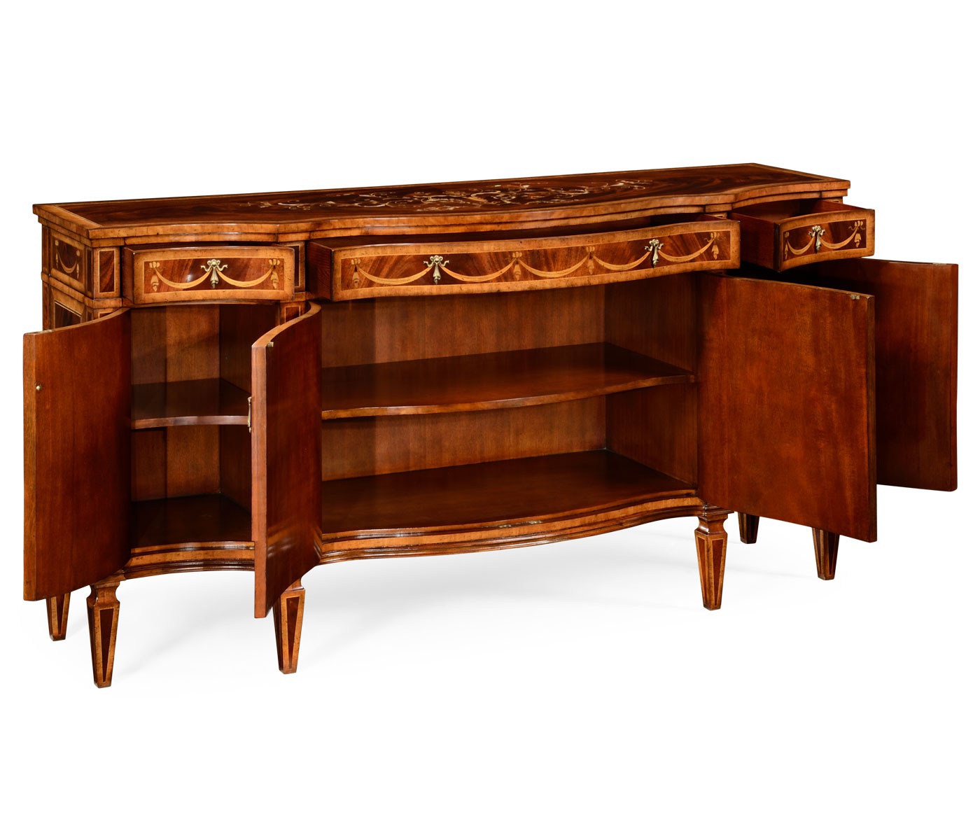 The Regency sideboard from the American manufacturer Jonathan Charles. The body is made of wood. The finish offers a natural wood veneer. The curved fa?ade and the top decorated with marquetry. Buffet on legs equipped with four doors and three drawers.