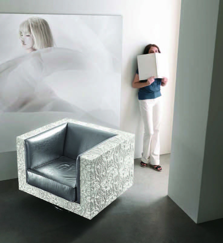 Rebecca chair swivel Italian manufacturer Bizzotto. Chair square shape, on a metal swivel base, the external finish of the chairs are decorated with hand-carved, covered with silver foil inside, silver leather. Colors to choose from the range of the manufacturer. Design solution for interior living room.