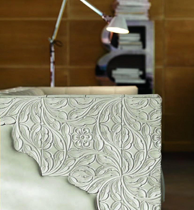 The Rebecca sofa by Italian manufacturer Bizzotto. Presents a model of a low sofa on metal legs, backrest and armrests of the same height. Color scheme in white. Back and seat in soft leather upholstery, finished with stitch Capito. The outer surface of the side walls is decorated with patterns. Design solution for modern interior in art Deco style.