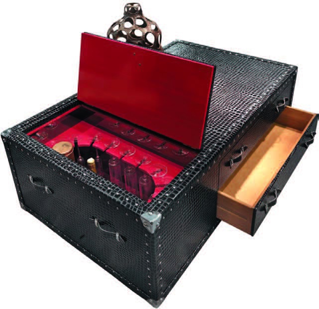 Chest Trunk bar Happy Hour Italian manufacturer Bizzotto. Presents a model of a mini bar in the form of a large chest. Equipped with 4 drawers and compartment for bottles. Exterior finish made of natural black leather, metal handle. Interior finishes the color of a bright red color. Design solution for a modern living room or office.