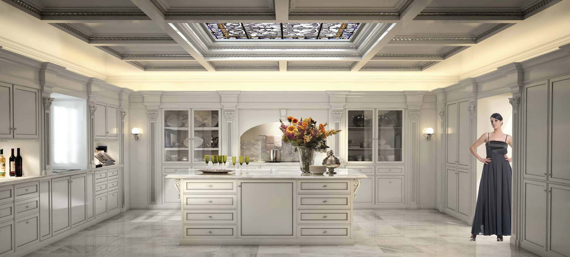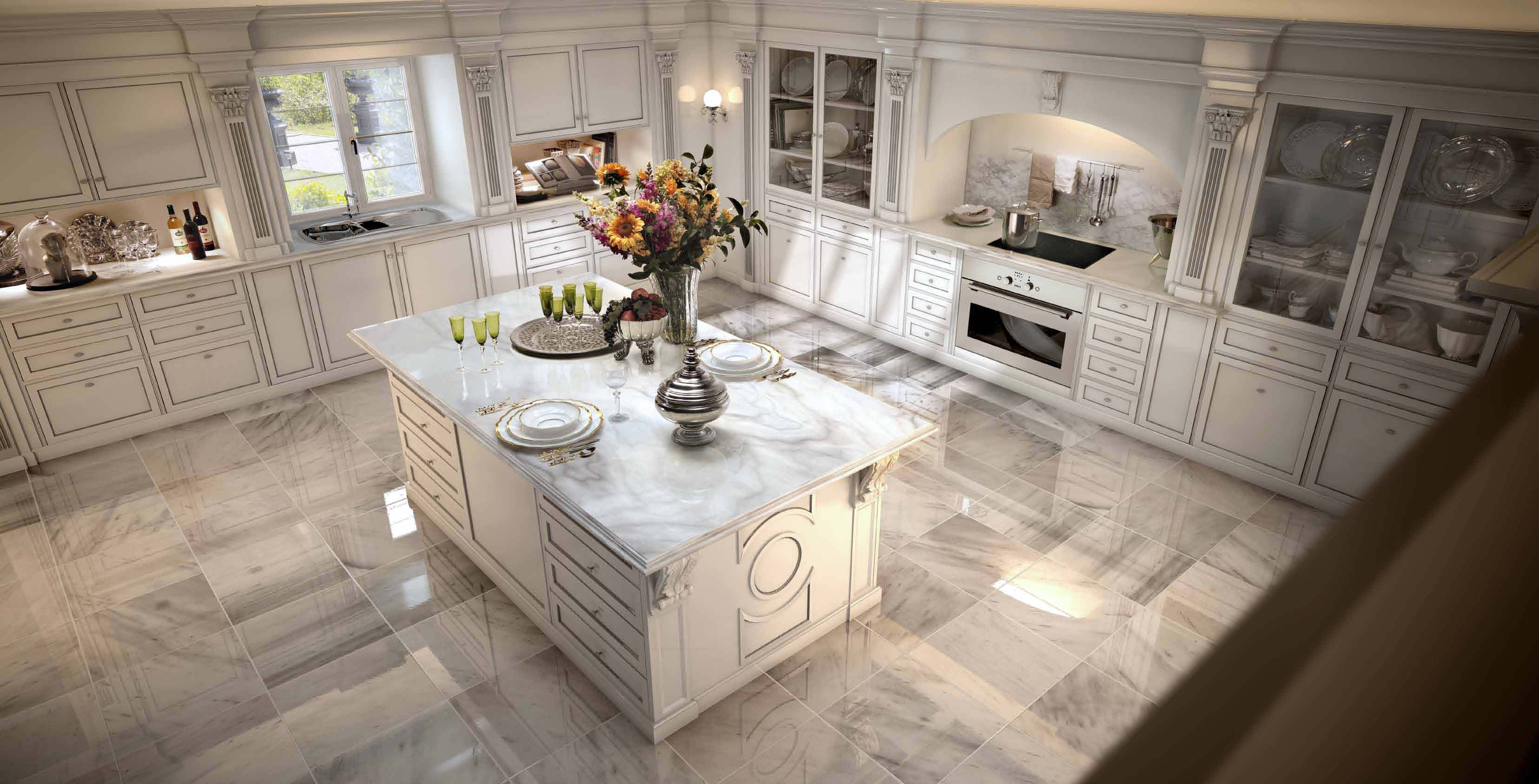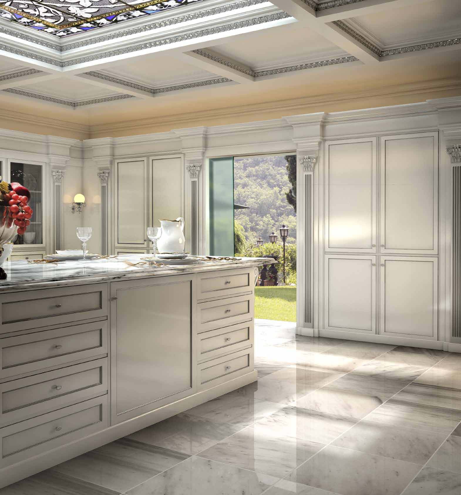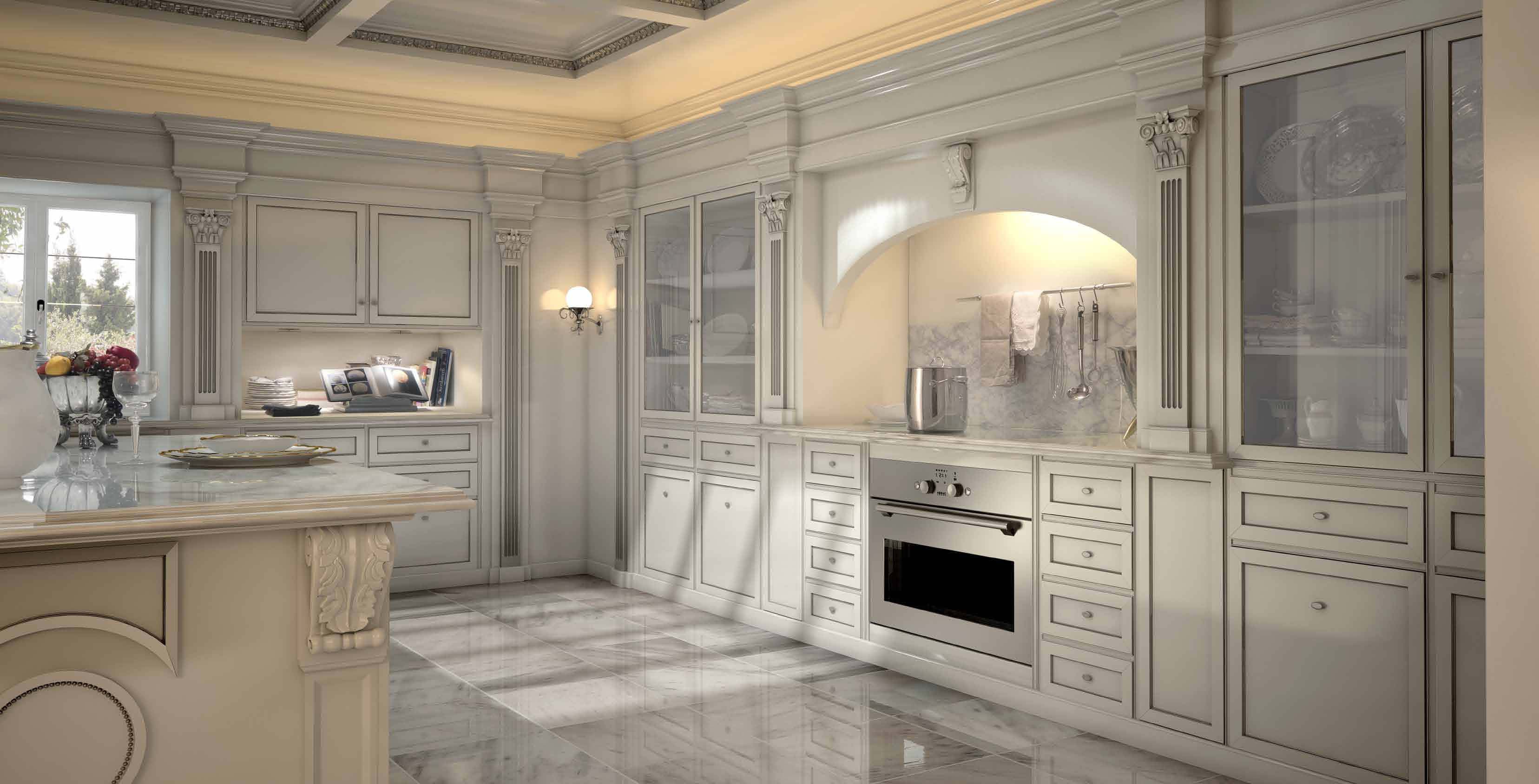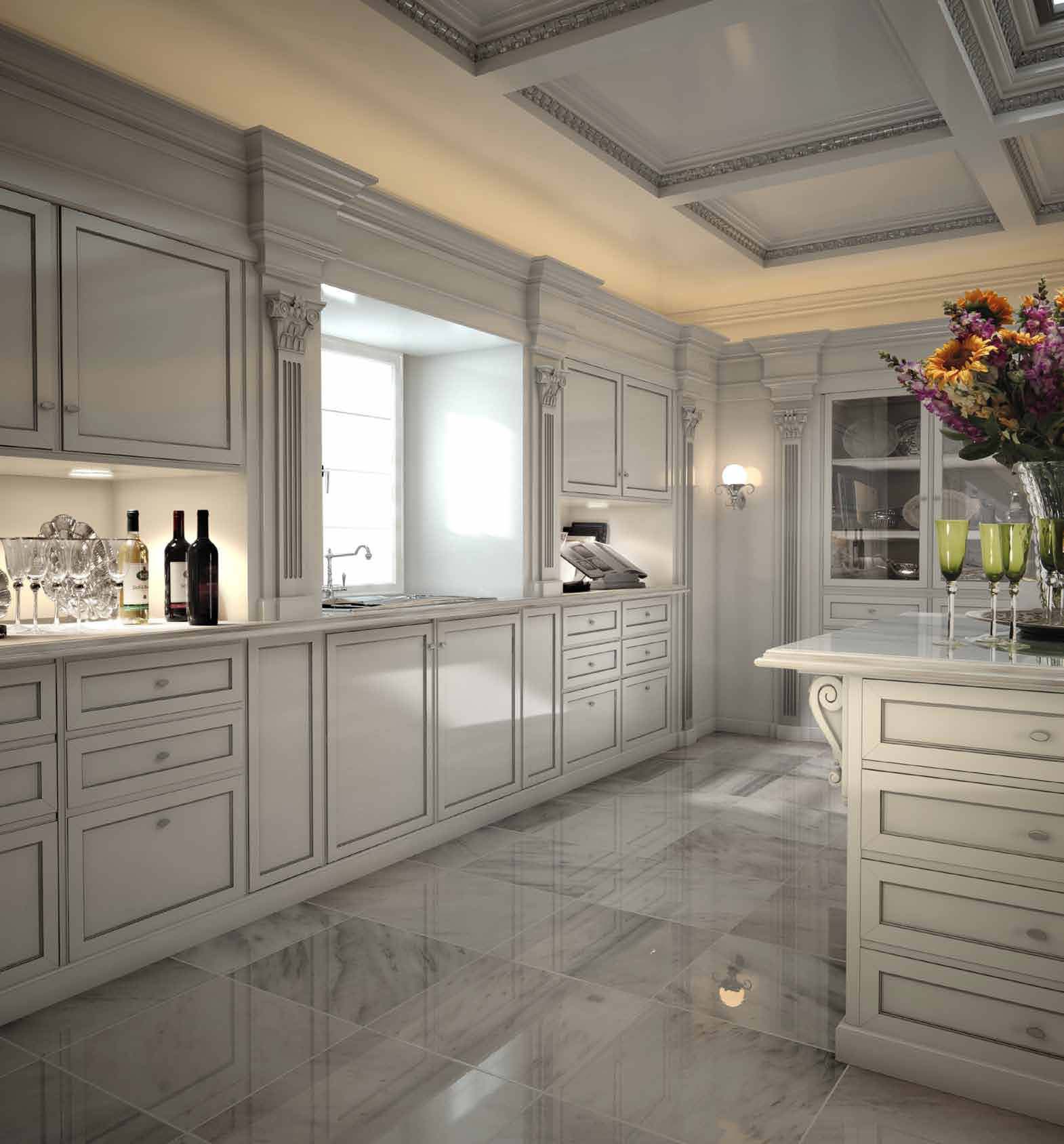 Kitchen with island Taormina First Italian manufacturer Bizzotto. Provides storage for kitchen interior. Doors made from solid wood, lacquered and silver, the furniture is equipped with wing lockers, drawers, built-in columns, wall and ceiling panels. The table top is made of white marble. The color of the furniture is light grey or a choice from manufacturer's catalogue. Modern, multi-functional solution for the kitchen interior in classic style.