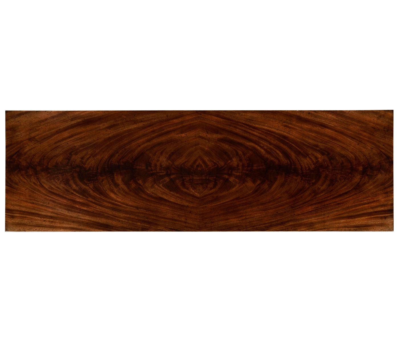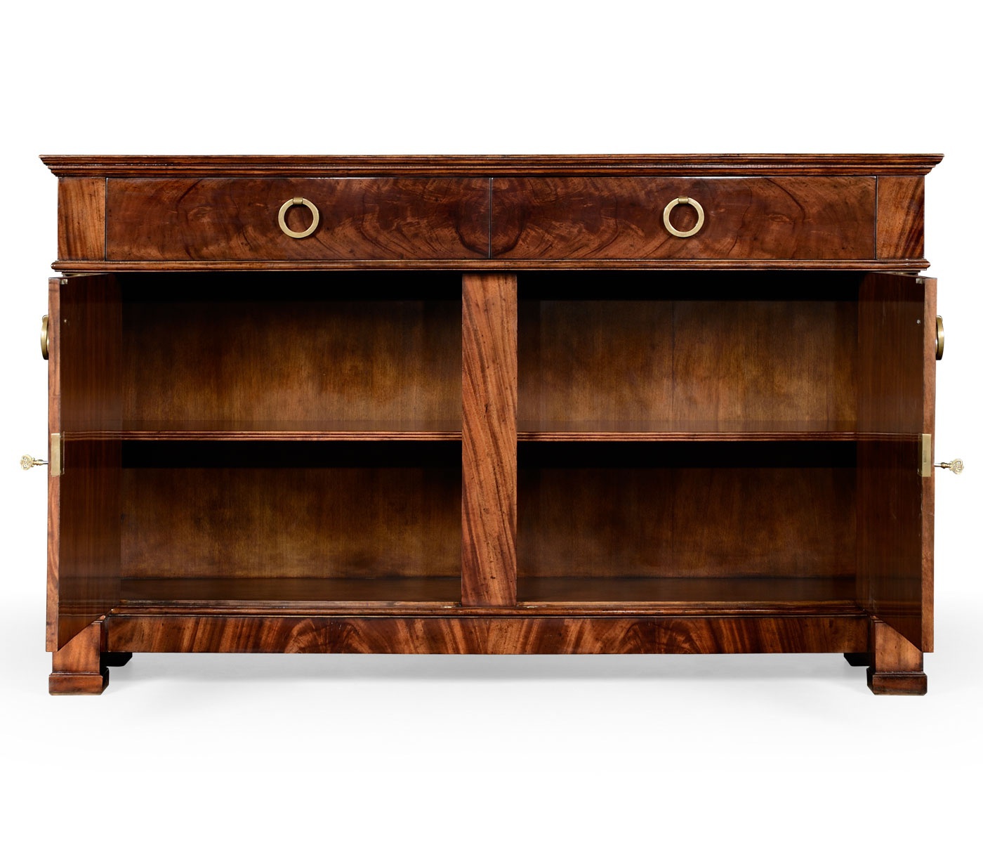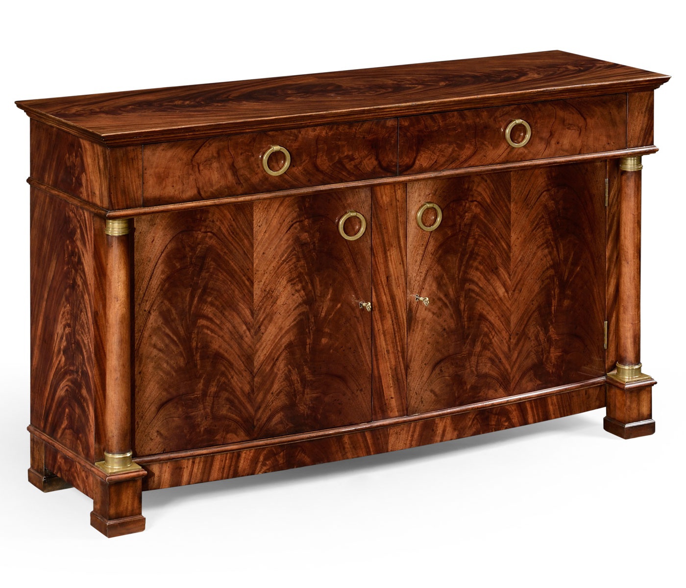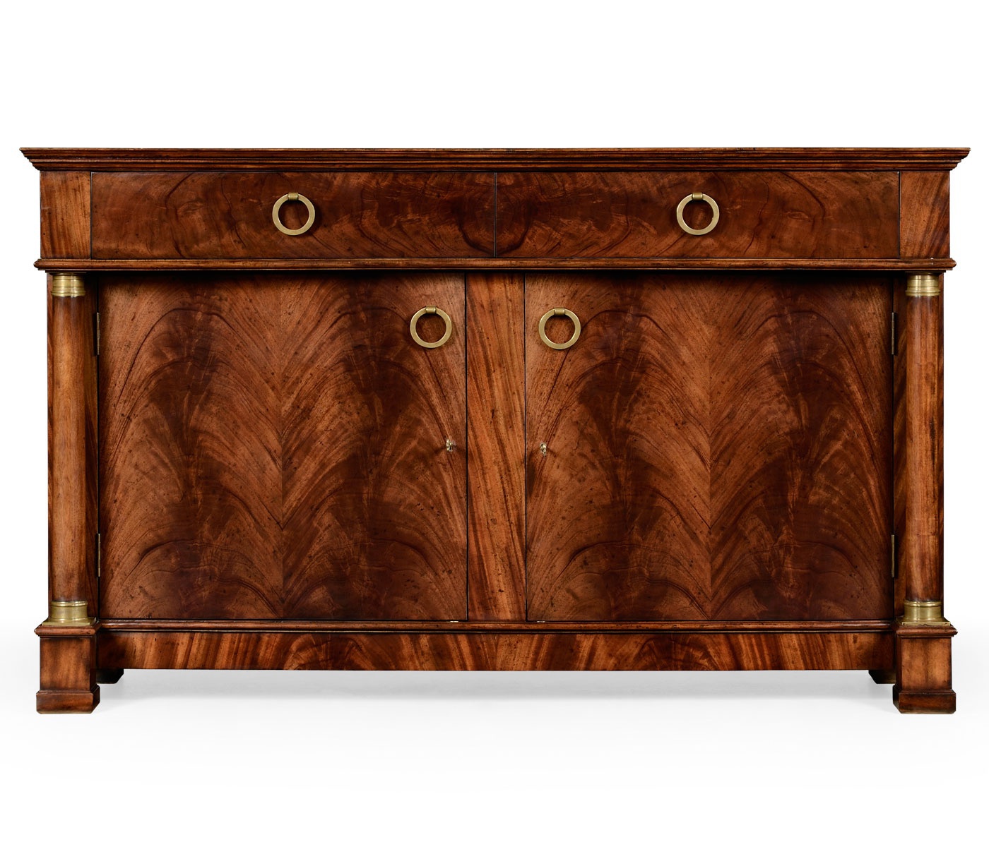 A snack bar Knightsbridge from the American manufacturer Jonathan Charles. Model with two doors and drawers. The case is made of natural wood and veneered mahogany. The sideboard is adorned with decorative columns with brass parts. Fittings also made of brass.