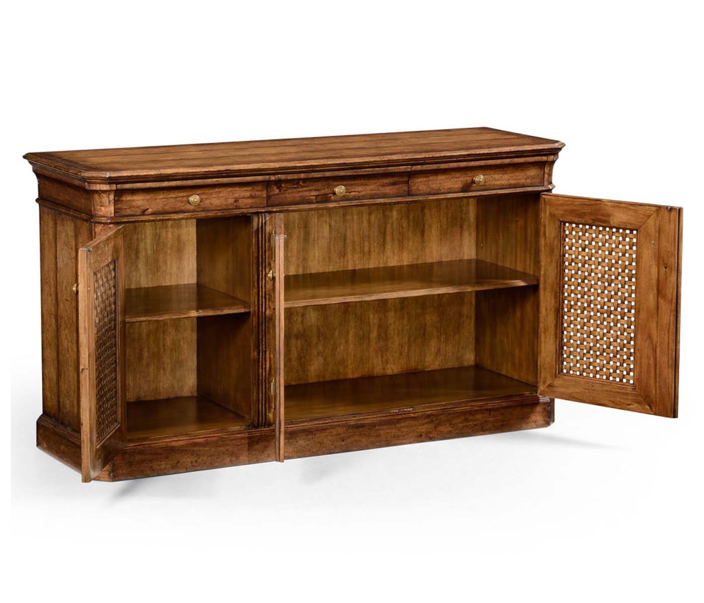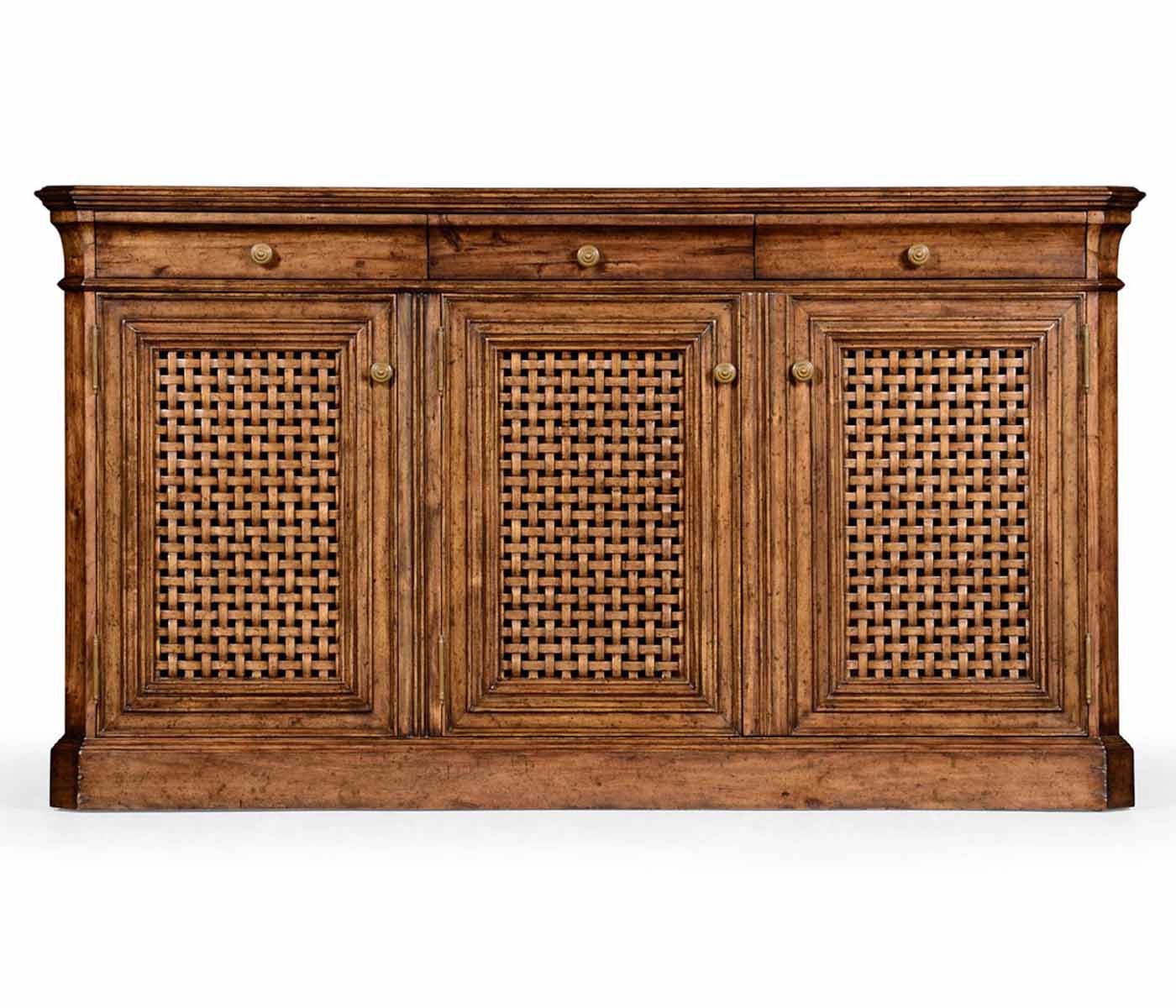 Buffet Country Farmhouse from the American manufacturer Jonathan Charles. The model with three doors and three drawers. The case is made from natural wood, stained walnut and aged. Lattice door panels. The design is executed in style of the country.