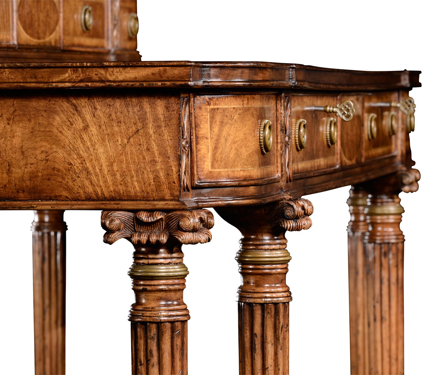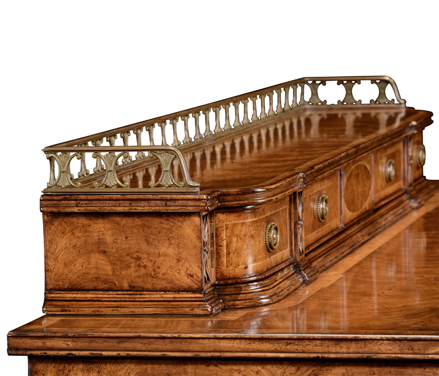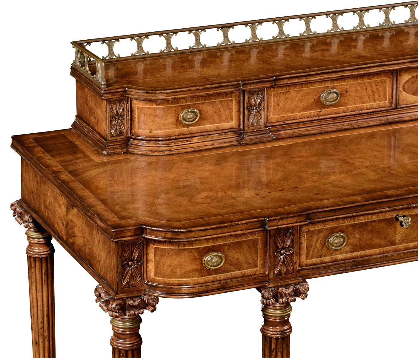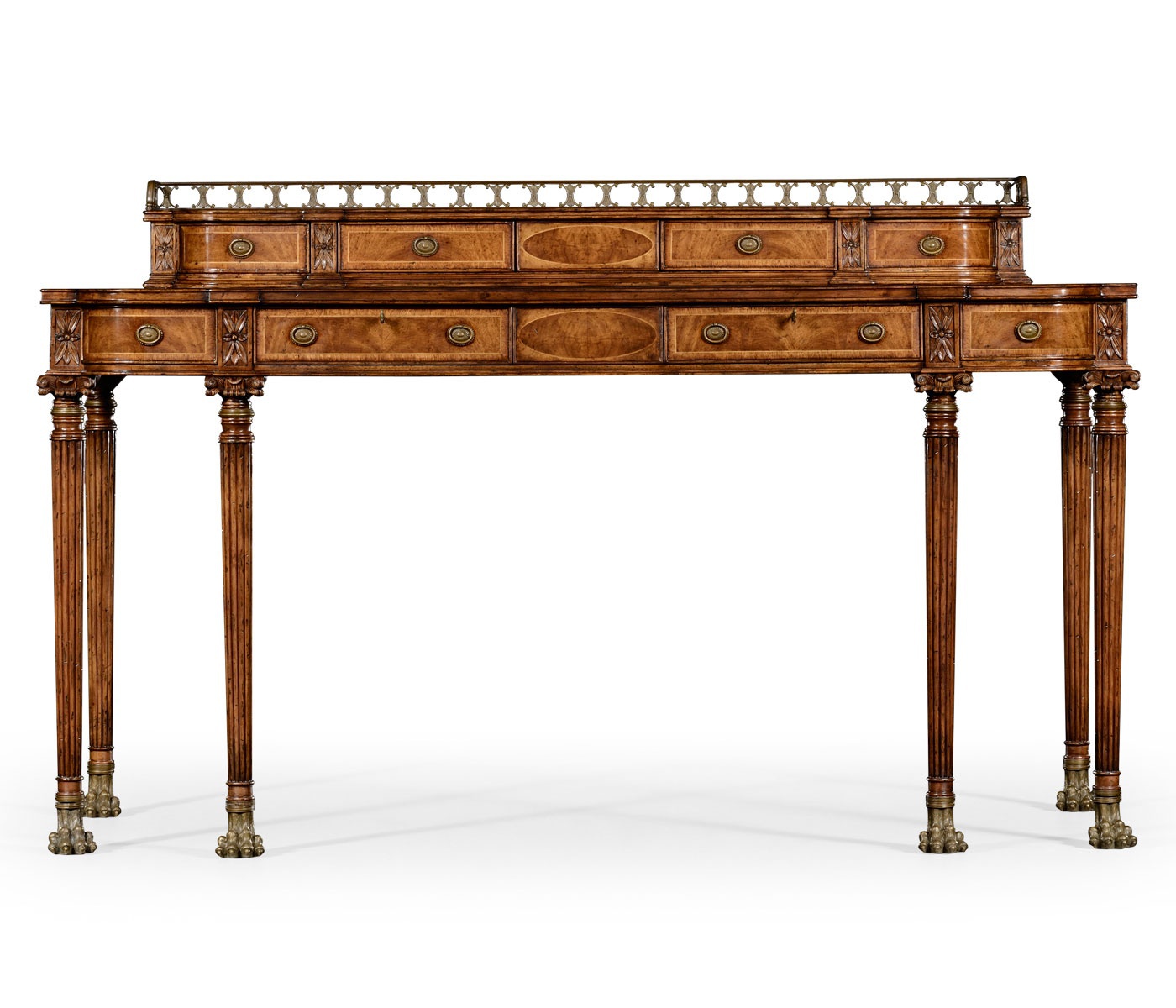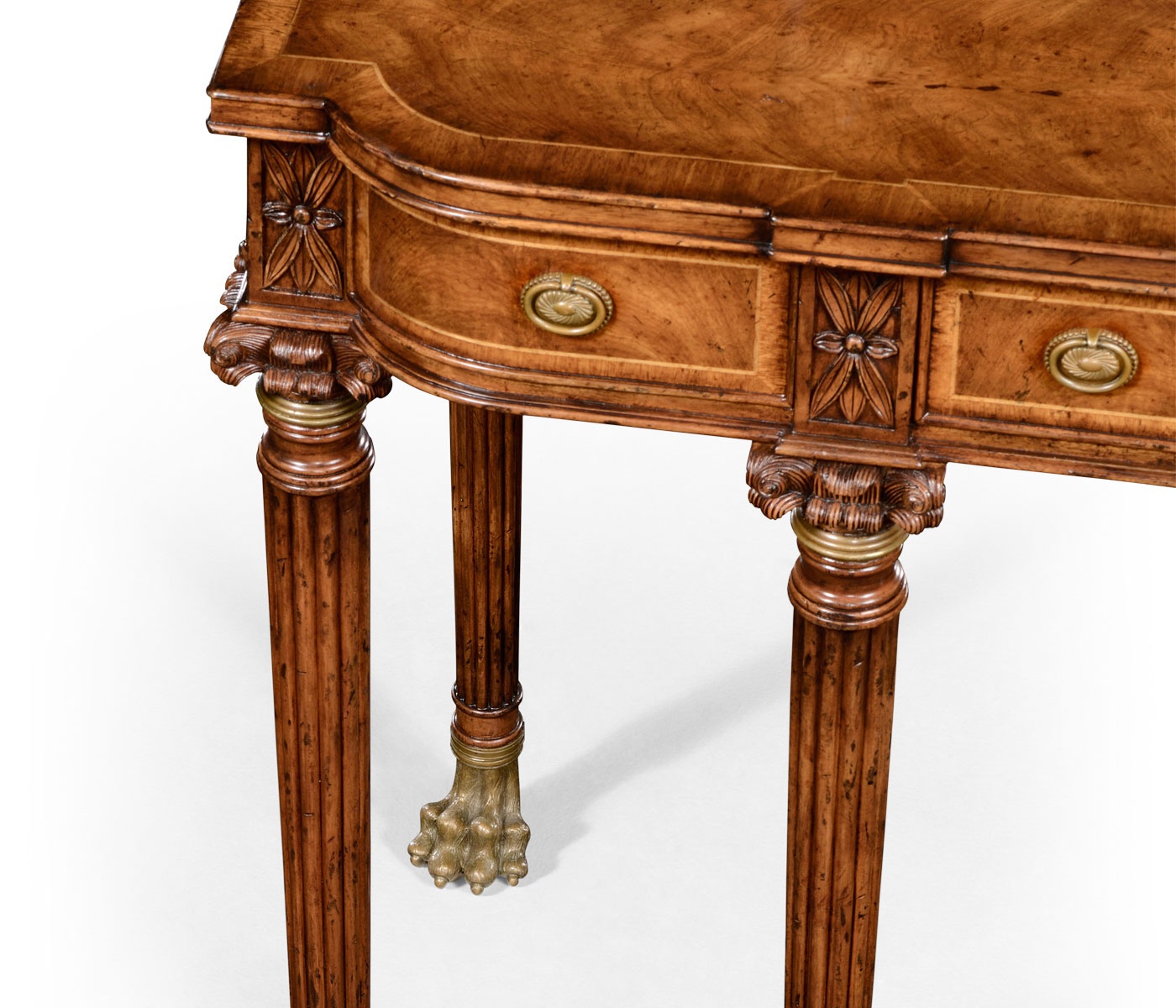 The Windsor console from an American manufacturer Jonathan Charles. Model high fluted legs with sliding drawers. The body is made of wood and decorated with carvings. Fittings and ferrules on legs made of brass. Tips on the legs cast in the form of lion paws.