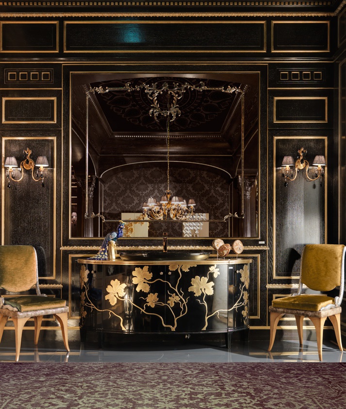 The Cabinet under the sink oval shape Iris the Italian manufacturer Bizzotto. The model of low tables on wooden legs, oval. Color in black with gold painted flowers and countertop. Has a sink oval shape in gloss black finish. Design complete wall and ceiling panels from the collection of the First Taormina, antique black with gold. Design solution for decorating your bathroom.