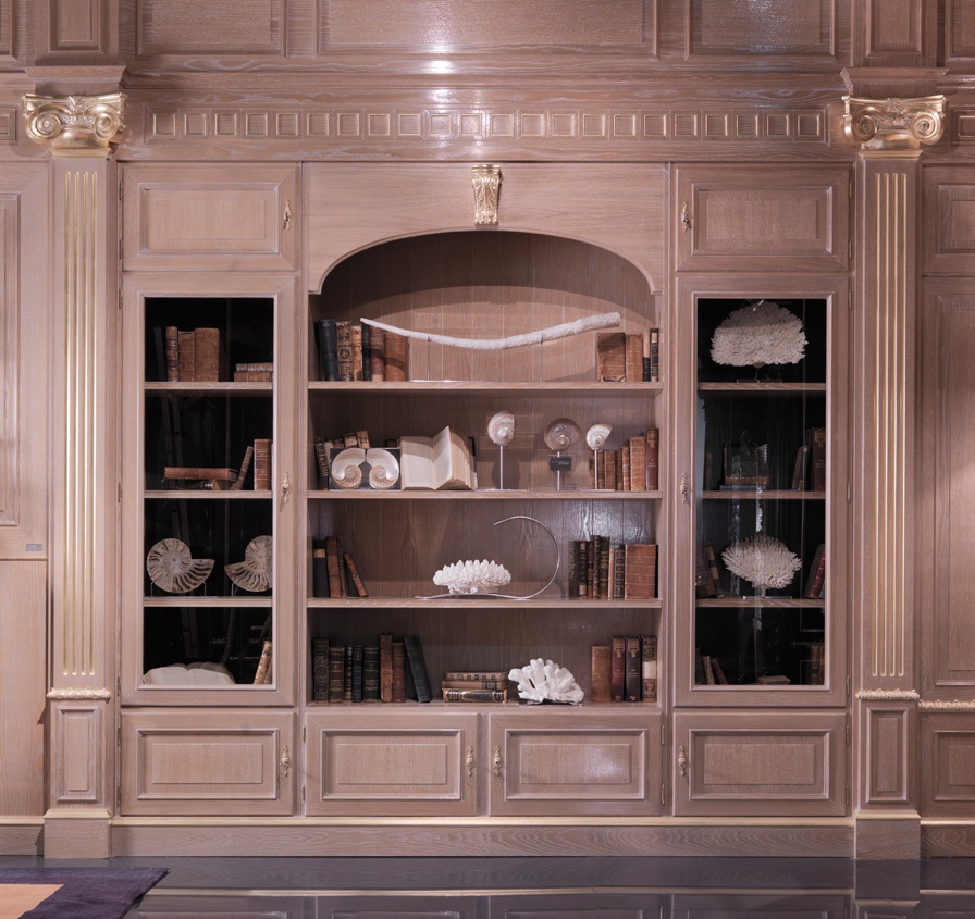 The modular storage system of Taormina First Italian manufacturer Bizzotto. The furniture is made of natural oak. Wall feature wall panels, closed cabinets with doors of glass and open shelves for storing books. The color of the furniture bright colors natural oak, handles and decorative elements finished with gold. Color to be selected from the range of the factory. The design complements the fireplace and a carved mirror. Perfect solution for interior home library or office.