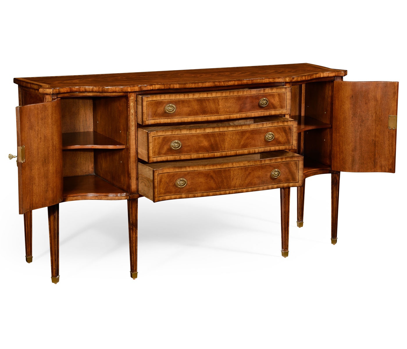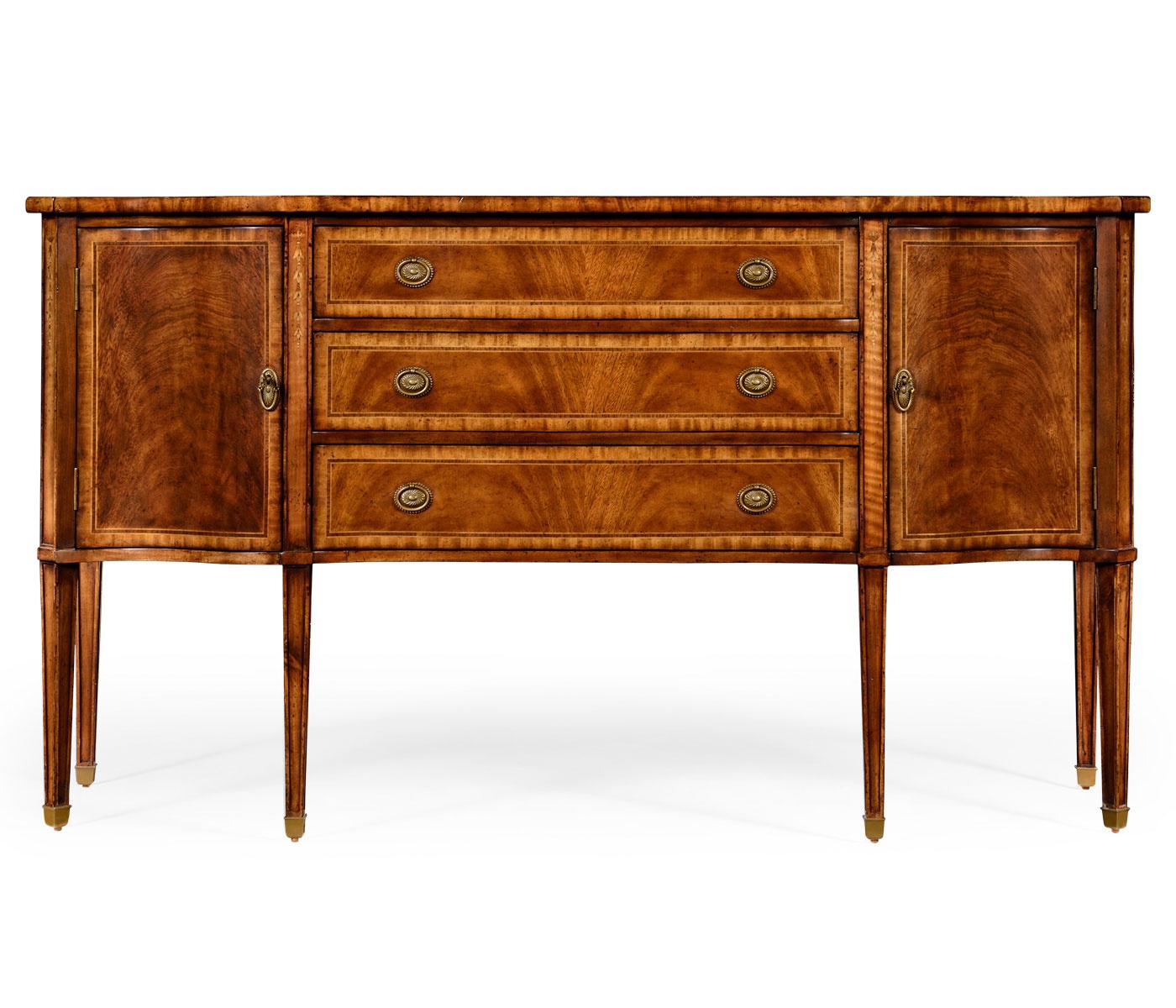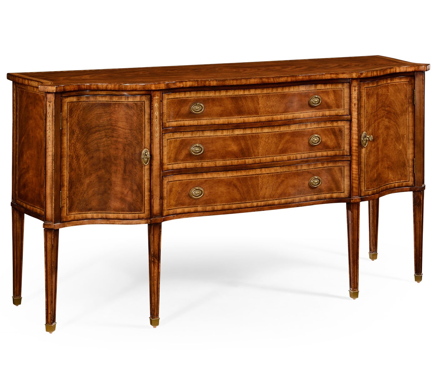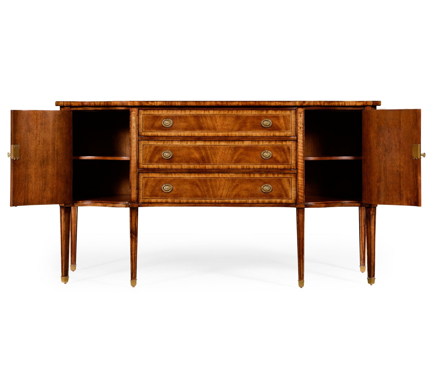 Buffet Windsor from the American manufacturer Jonathan Charles. Model on high legs equipped with two curved doors and three drawers. The body is made of wood and decorated with marquetry. Fittings and ferrules on legs made of metal.