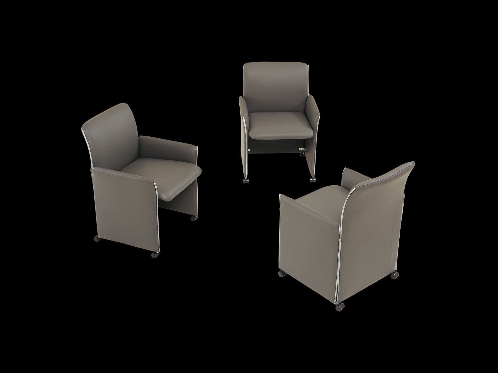 Chair with armrests Oris from the Italian manufacturer Il Loft. Model on wheels with a frame made of wood. Back, into armrests. The upholstery is made of leather or textile. Filler - polyurethane foam. The modern design. Colors range from the manufacturer.