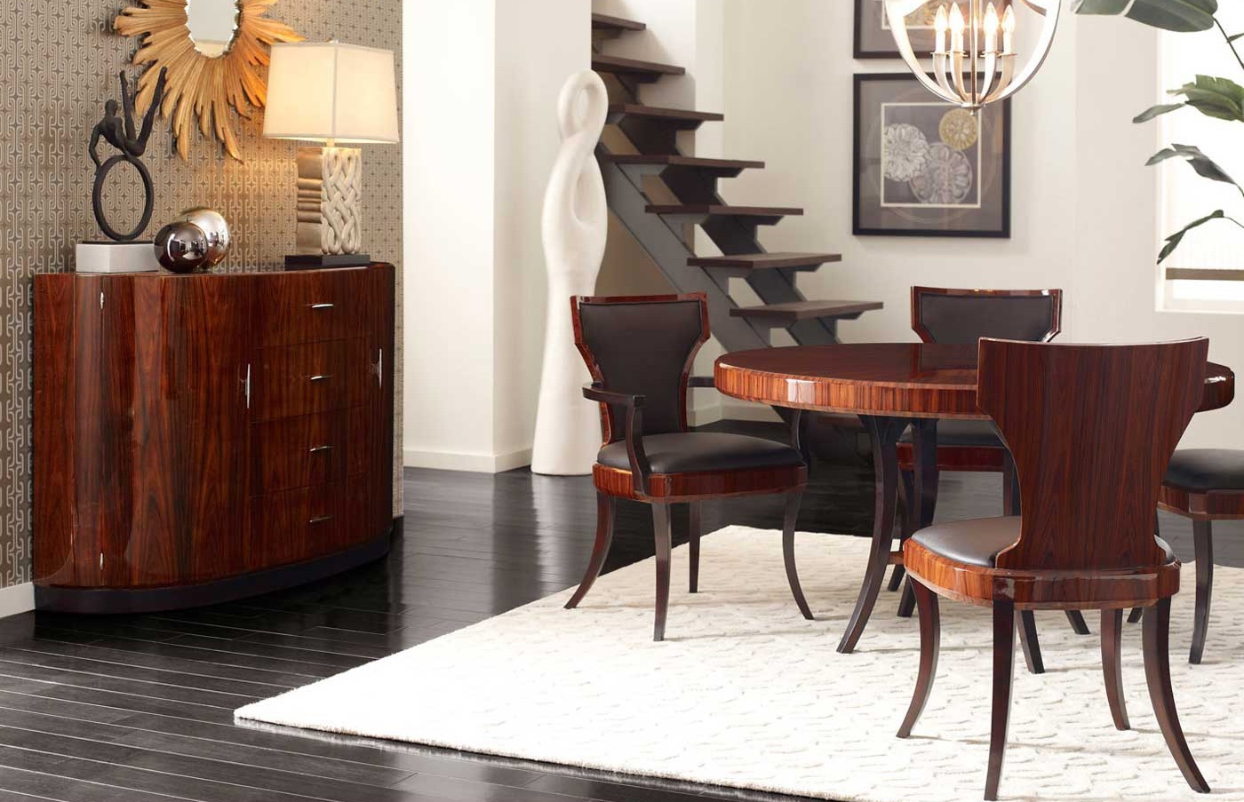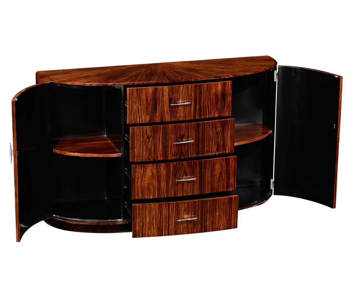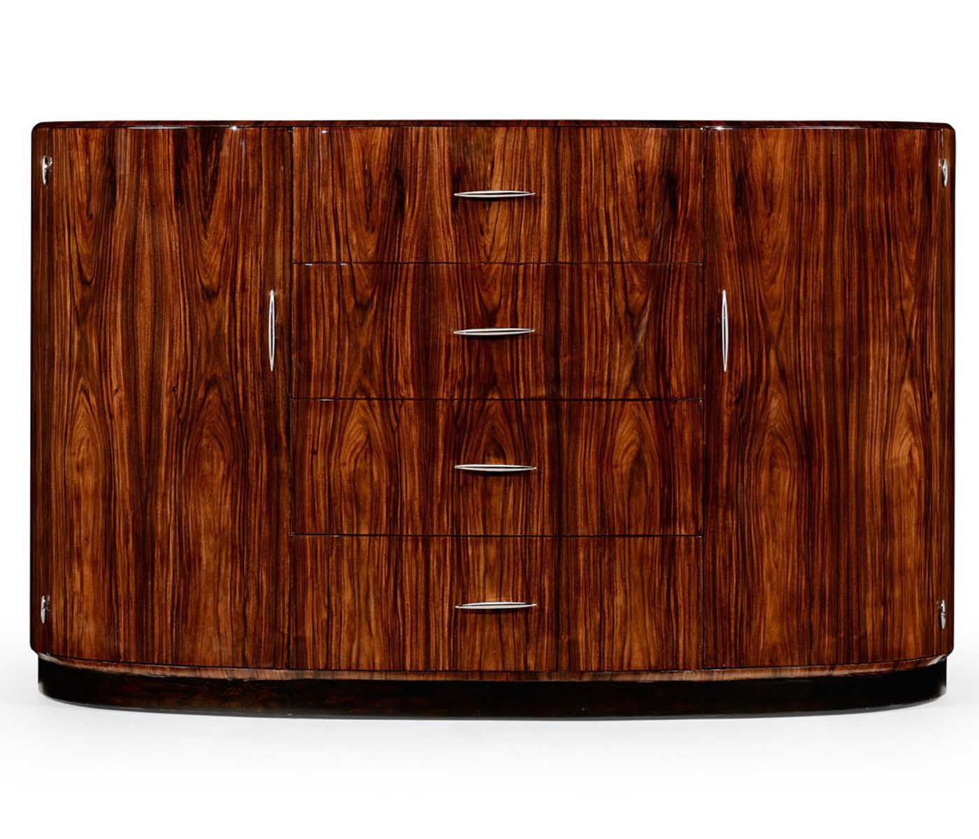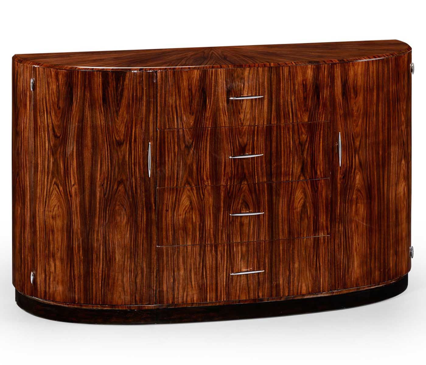 A snack bar Santos from an American manufacturer Jonathan Charles. Model semi-circular form on stepped base. The model with four drawers and curved doors on the sides. The case is made of natural wood and veneered. Fittings made of metal.